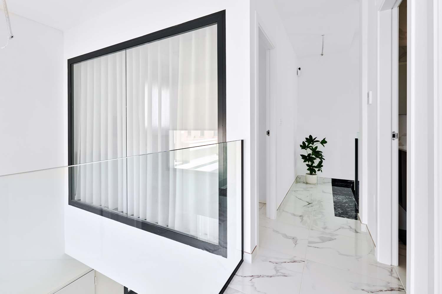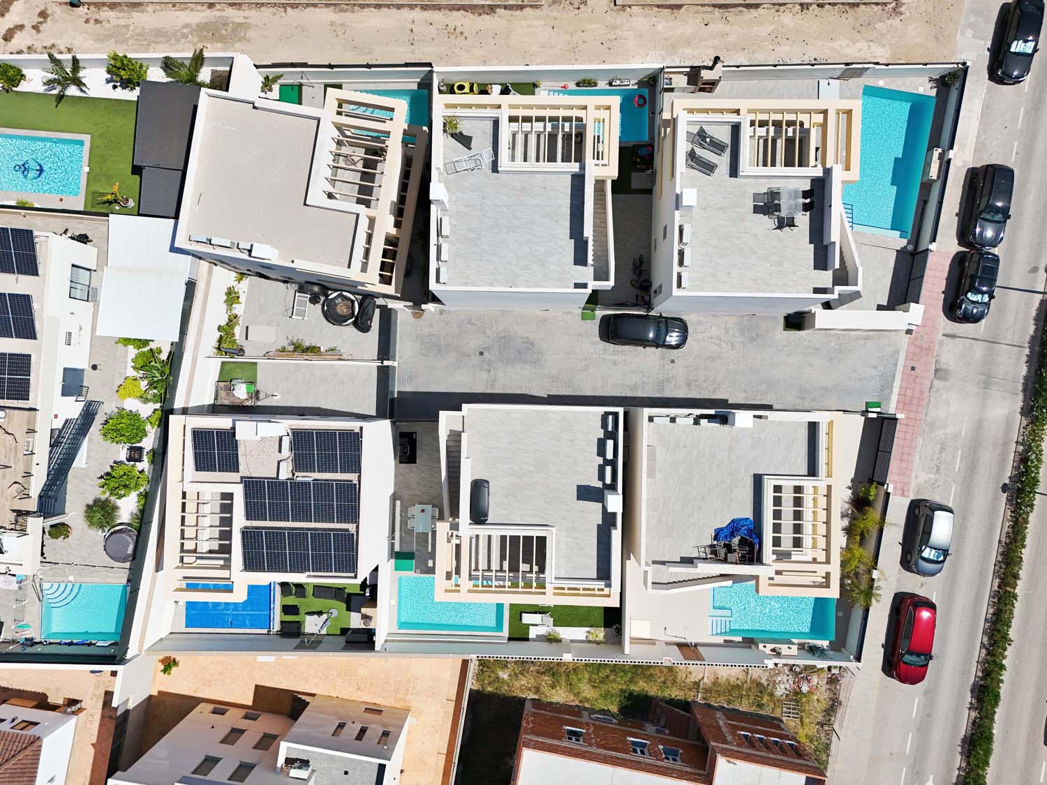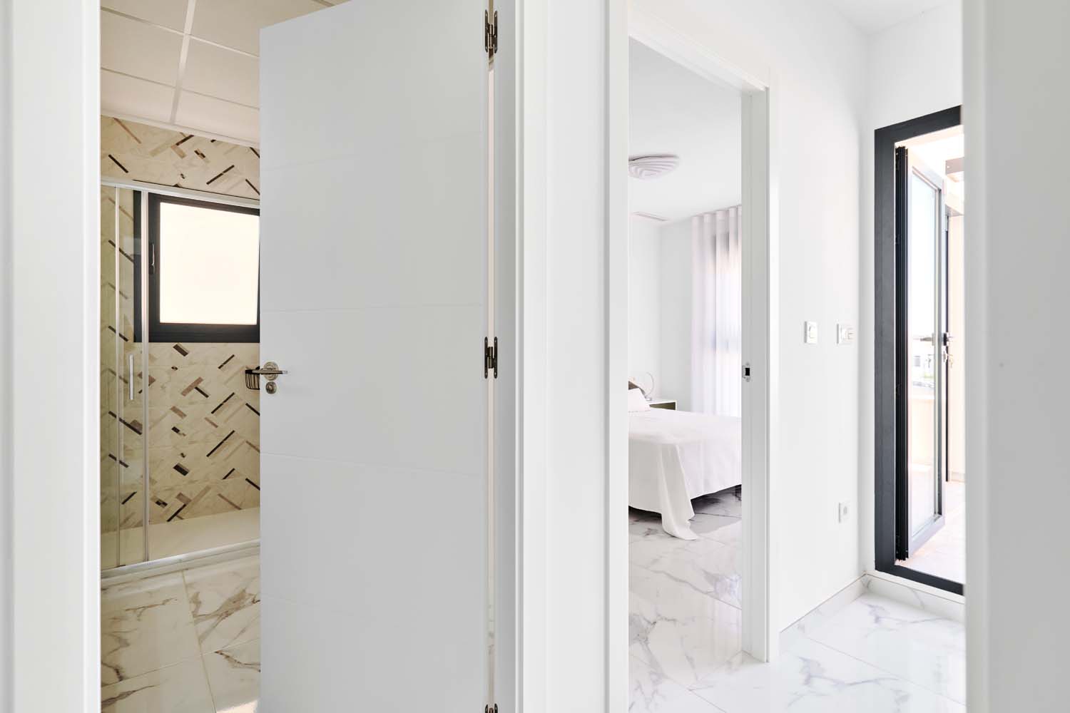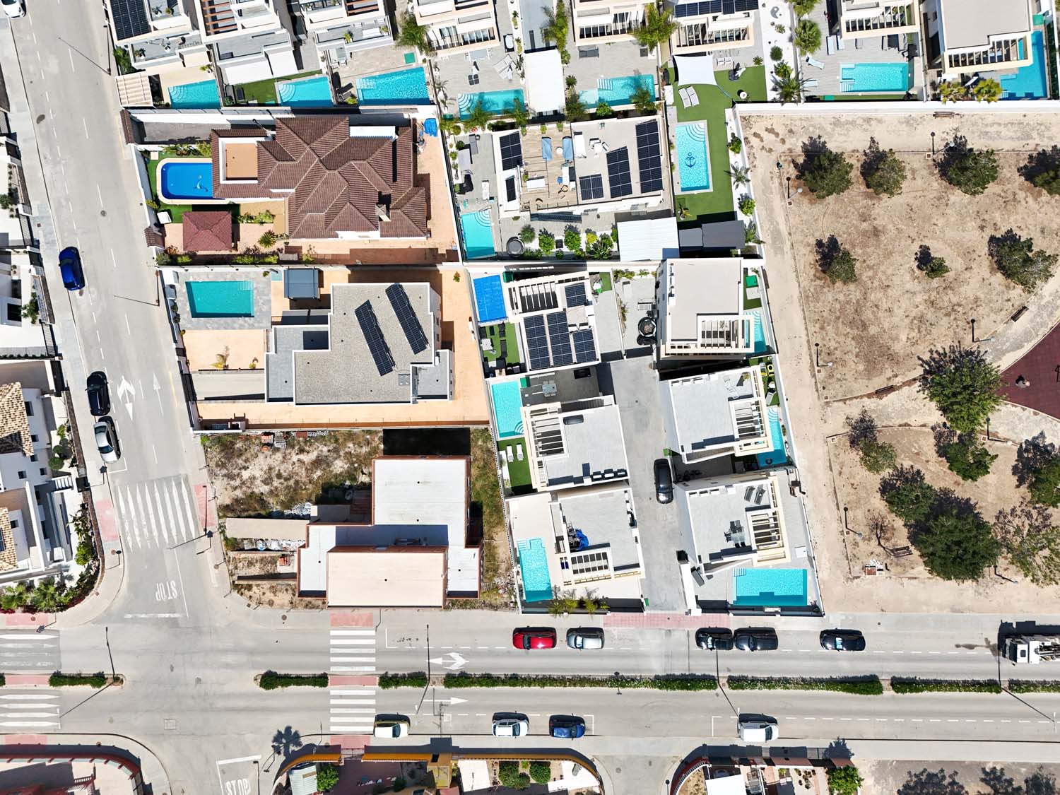 Fantastic opportunity to purchase a modern 3 bedroom, 2 bathroom detached villa with private swimming pool and off street parking, situated in a quiet cul de sac and small urbanisation on the edge of Los Montesinos town with an array of amenities and only 20 minutes drive to the beach. This beautiful villa is part of a community of only 6 detached villas in a small quiet cul de sac situated next to a green/park area and is only a few minutes walk to a large supermarket. To the outside of the villa is a spacious low maintenance plot with driveway accessible via a electric sliding gate, there is a private swimming pool with plenty of space for sunbathing and entertaining. The front door of the villa opens into a light and spacious open plan living/dining room with kitchen, the kitchen is a good size U shape with plenty of storage and there is a separate utility room next to the kitchen it is hidden and accessible by double white doors, in the living room there are patio doors which flood the room with natural light and give direct access out to the pool area. Also located on the ground floor is a bathroom with walk in shower and a large double bedroom with built in wardrobes and patio doors leading to the garden. A beautiful modern stone and glass staircase leads from the living area to the first floor of the villa, here there are two double bedrooms and a spacious family bathroom. Both bedrooms are light and good sized doubles with built in wardrobes, one of the bedrooms also benefits from direct access to the family bathroom and patio doors out to a terrace. The jack and jill bathroom has a large walk in shower and can also be accessed via a door from the hallway. There is another door in the hallway that leads onto the terrace where an external staircase leads to a large sunny roof terrace with lovely views, water and electric points should you wish to add a outside kitchen. This villa has a long list of added extras including ducted air conditioning, under floor heating in the bathrooms, private swimming pool, outside shower and electric gate. This property is immaculate, requires no work and is sold fully furnished, just pack your suitcase and enjoy! Viewing is highly recommended!