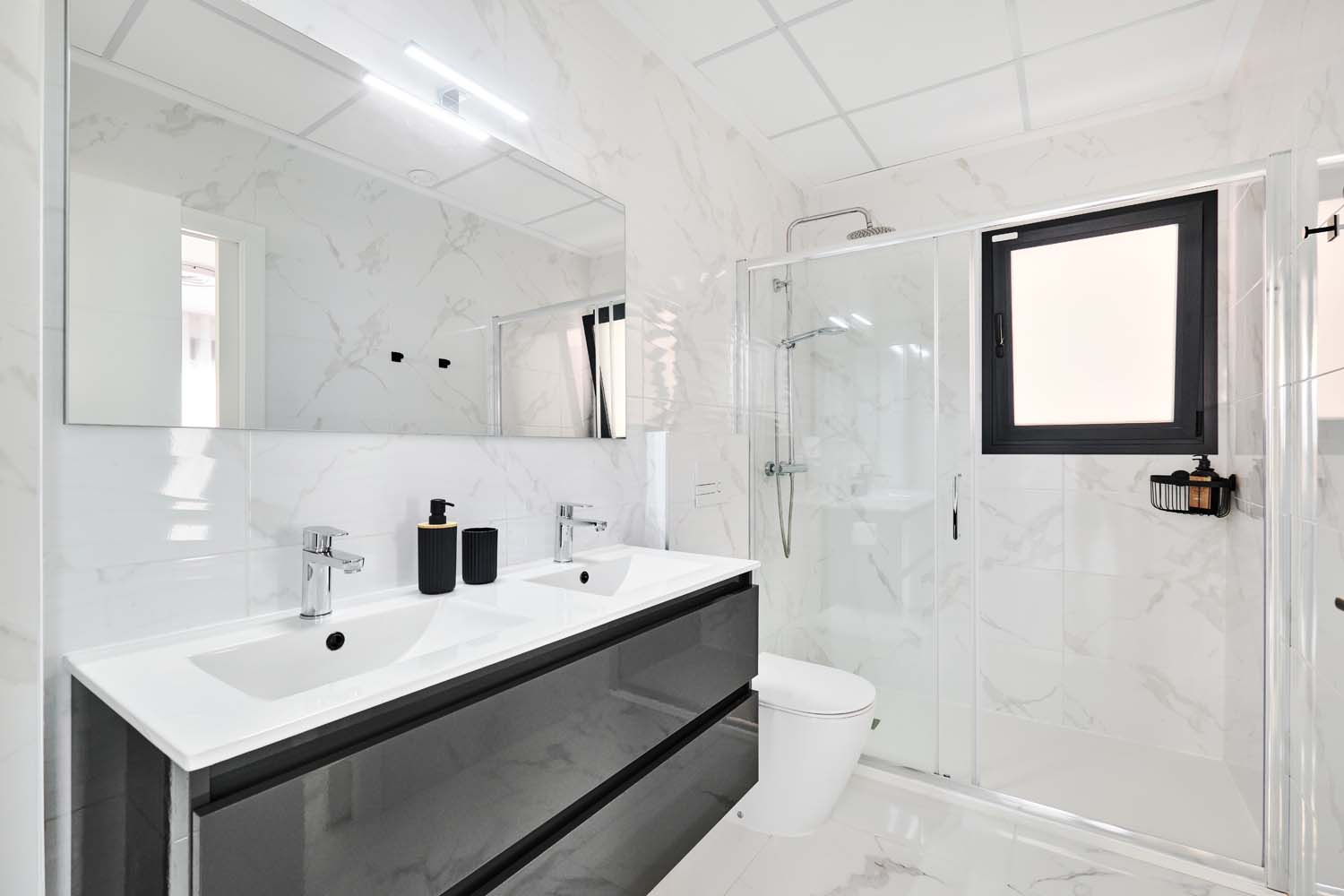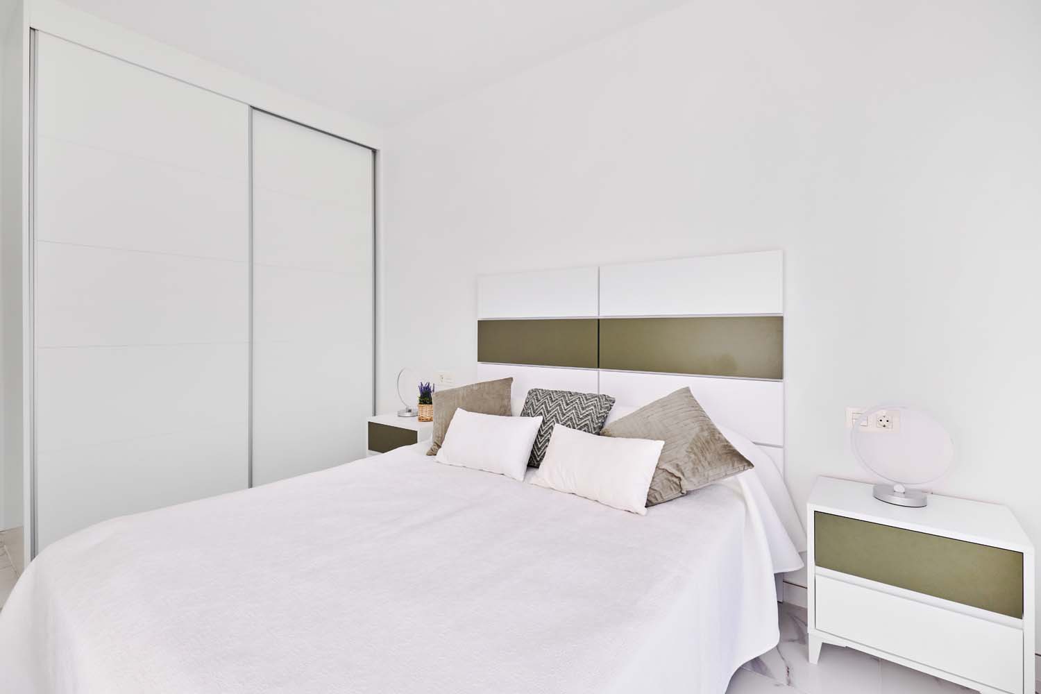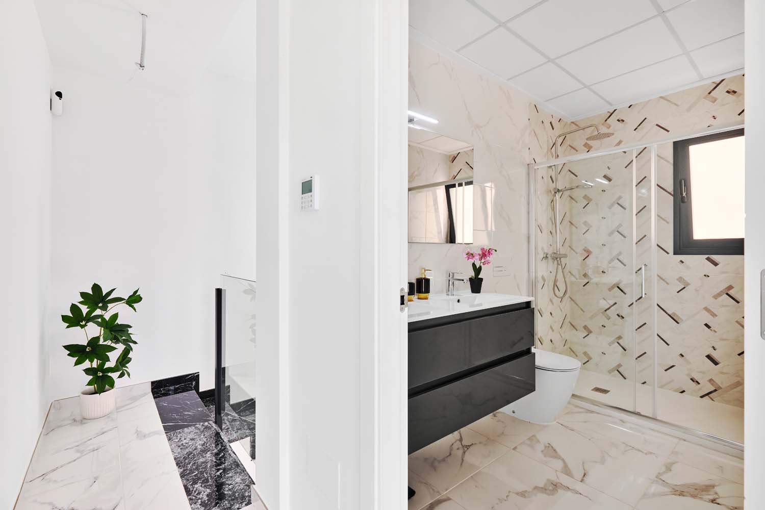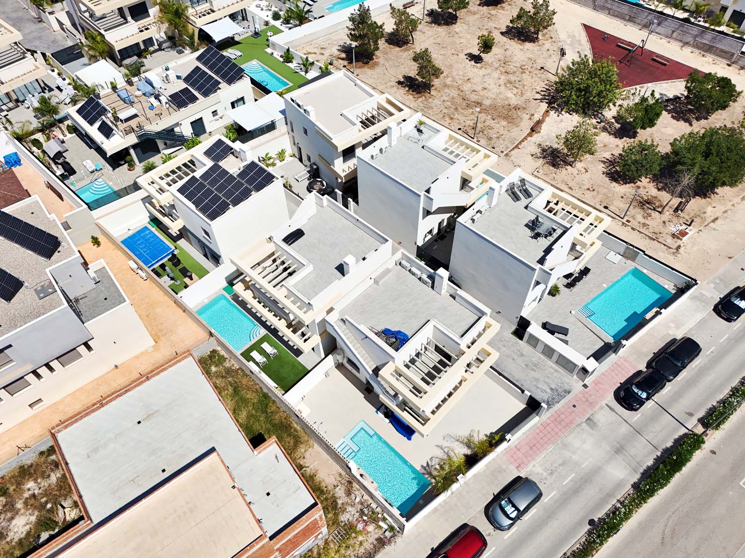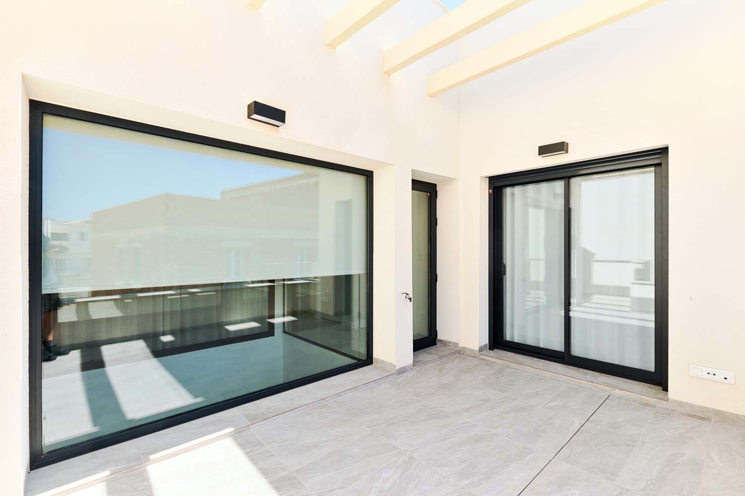 Fantastic opportunity to purchase a modern 3 bedroom, 2 bathroom detached villa with private swimming pool and off street parking, situated in a quiet cul de sac and small urbanisation on the edge of Los Montesinos town with an array of amenities and only 20 minutes drive to the beach. This beautiful villa is part of a community of only 6 detached villas in a small quiet cul de sac situated next to a green/park area and is only a few minutes walk to a large supermarket. To the outside of the villa is a spacious low maintenance plot with driveway accessible via a electric sliding gate, there is a private swimming pool with plenty of space for sunbathing and entertaining. The front door of the villa opens into a light and spacious open plan living/dining room with kitchen, the kitchen is a good size U shape with plenty of storage and there is a separate utility room next to the kitchen it is hidden and accessible by double white doors, in the living room there are patio doors which flood the room with natural light and give direct access out to the pool area. Also located on the ground floor is a bathroom with walk in shower and a large double bedroom with built in wardrobes and patio doors leading to the garden. A beautiful modern stone and glass staircase leads from the living area to the first floor of the villa, here there are two double bedrooms and a spacious family bathroom. Both bedrooms are light and good sized doubles with built in wardrobes, one of the bedrooms also benefits from direct access to the family bathroom and patio doors out to a terrace. The jack and jill bathroom has a large walk in shower and can also be accessed via a door from the hallway. There is another door in the hallway that leads onto the terrace where an external staircase leads to a large sunny roof terrace with lovely views, water and electric points should you wish to add a outside kitchen. This villa has a long list of added extras including ducted air conditioning, under floor heating in the bathrooms, private swimming pool, outside shower and electric gate. This property is immaculate, requires no work and is sold fully furnished, just pack your suitcase and enjoy! Viewing is highly recommended!