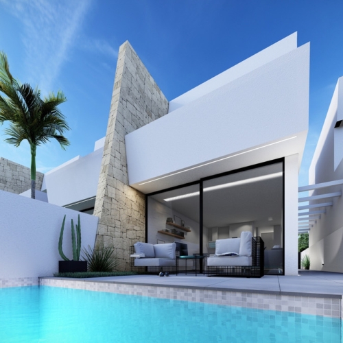 Both villas offer 3 generously sized bedrooms (first floor with en-suite), and a further bathroom on the ground floor with walk in shower. The ground floor living area features a fully fitted kitchen with drop down table open plan lounge / dining area, fully fitted kitchen zone with appliances, exterior storage room and terraced areas to the side of the villa, from master bedroom and from the lounge area.