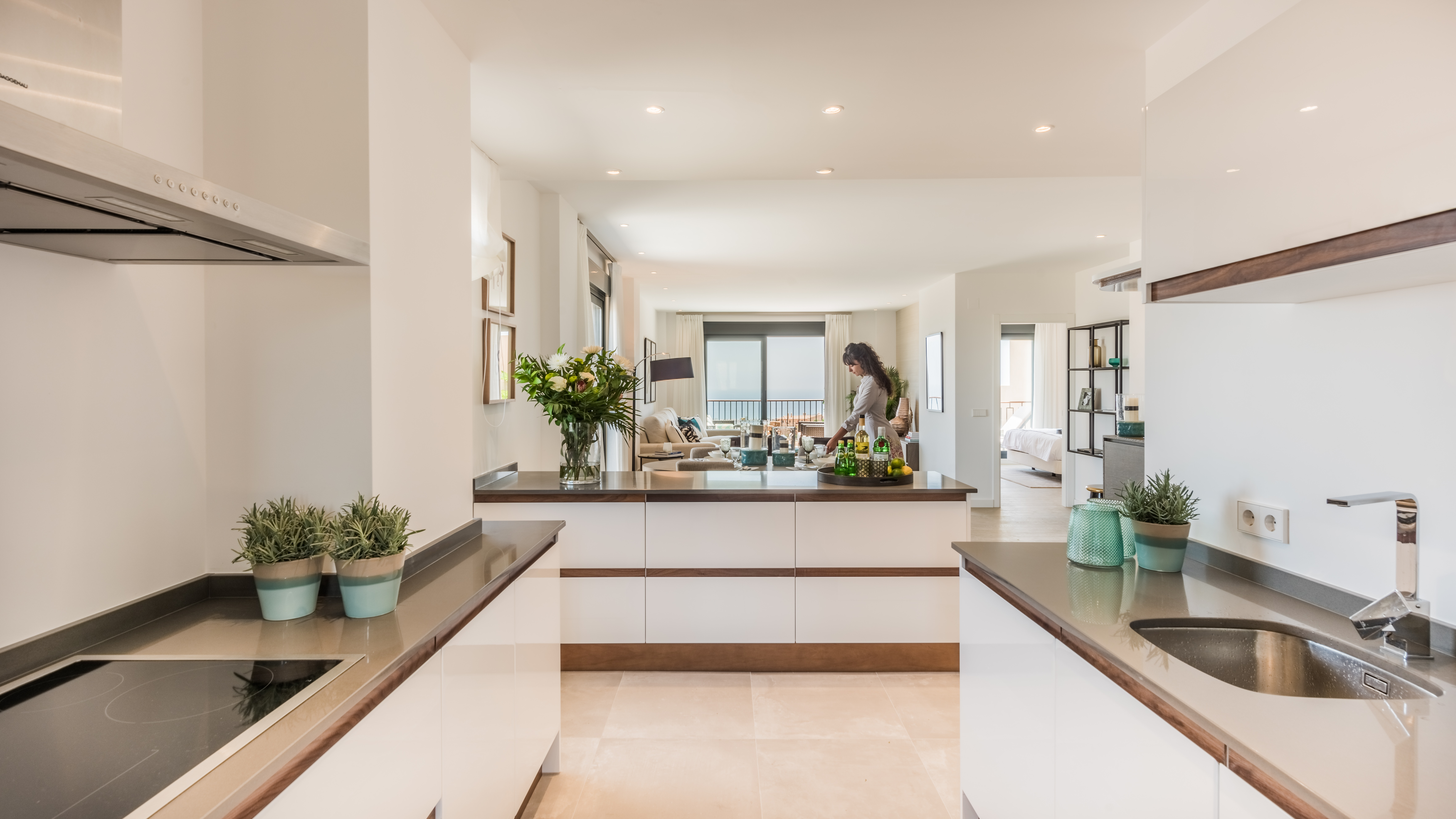 plan kitchen with a centre-island, serving as a breakfast area too. The kitchen is modern and light with practical storage and quality finishing in classic design.