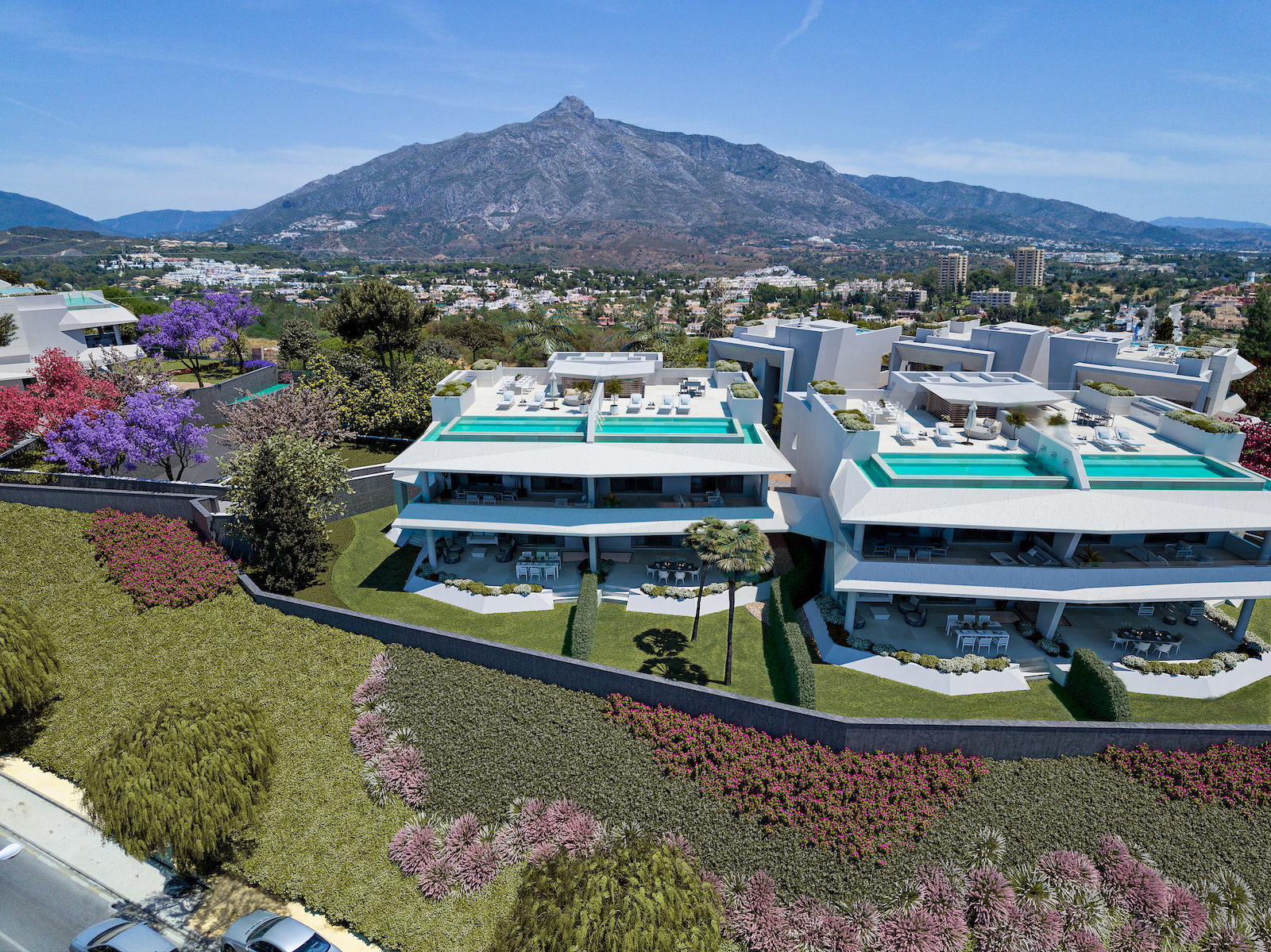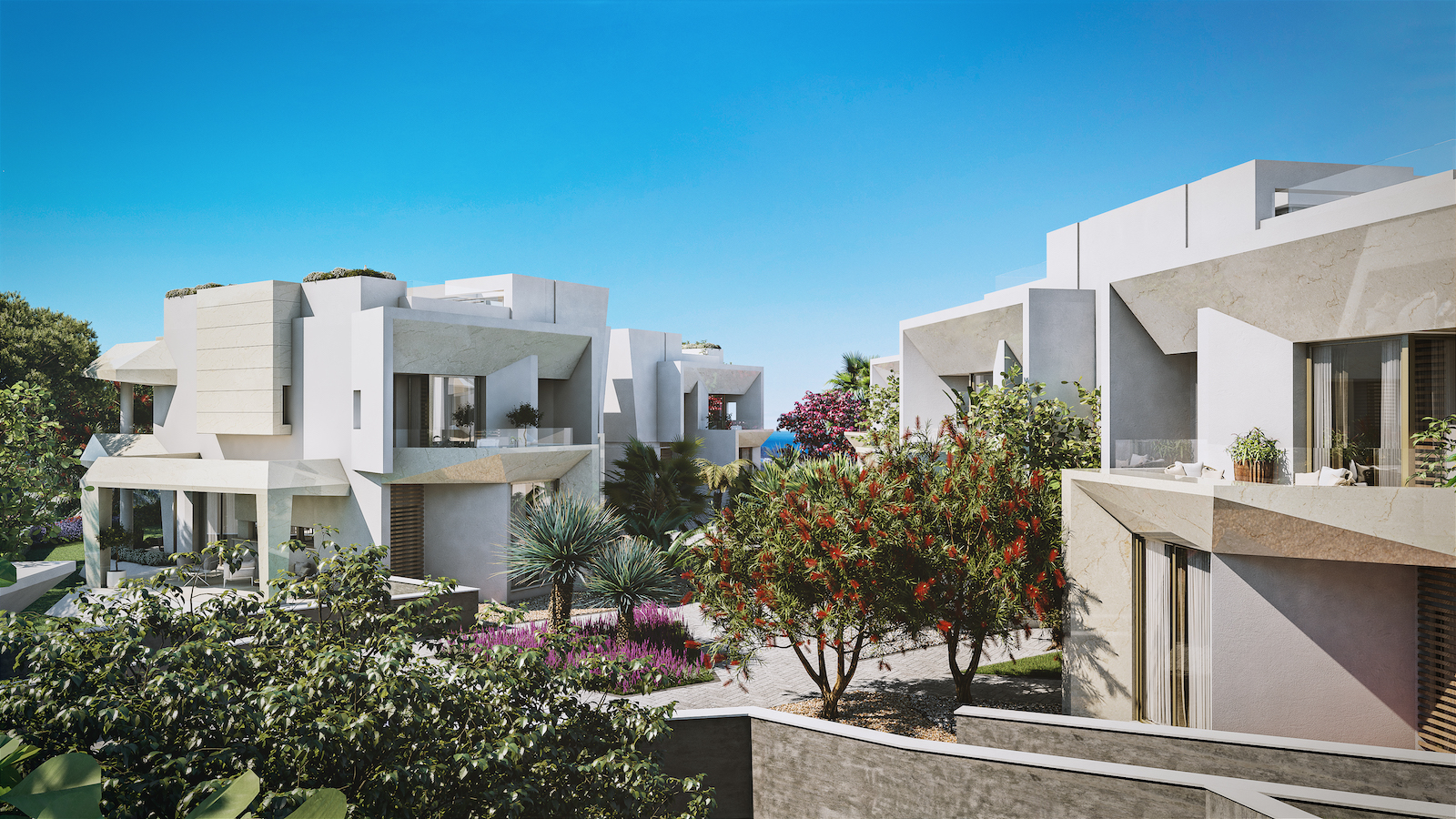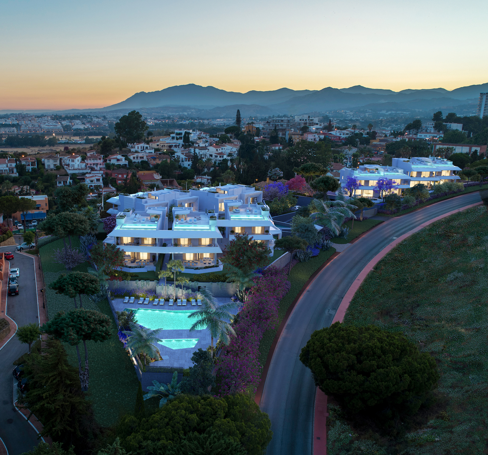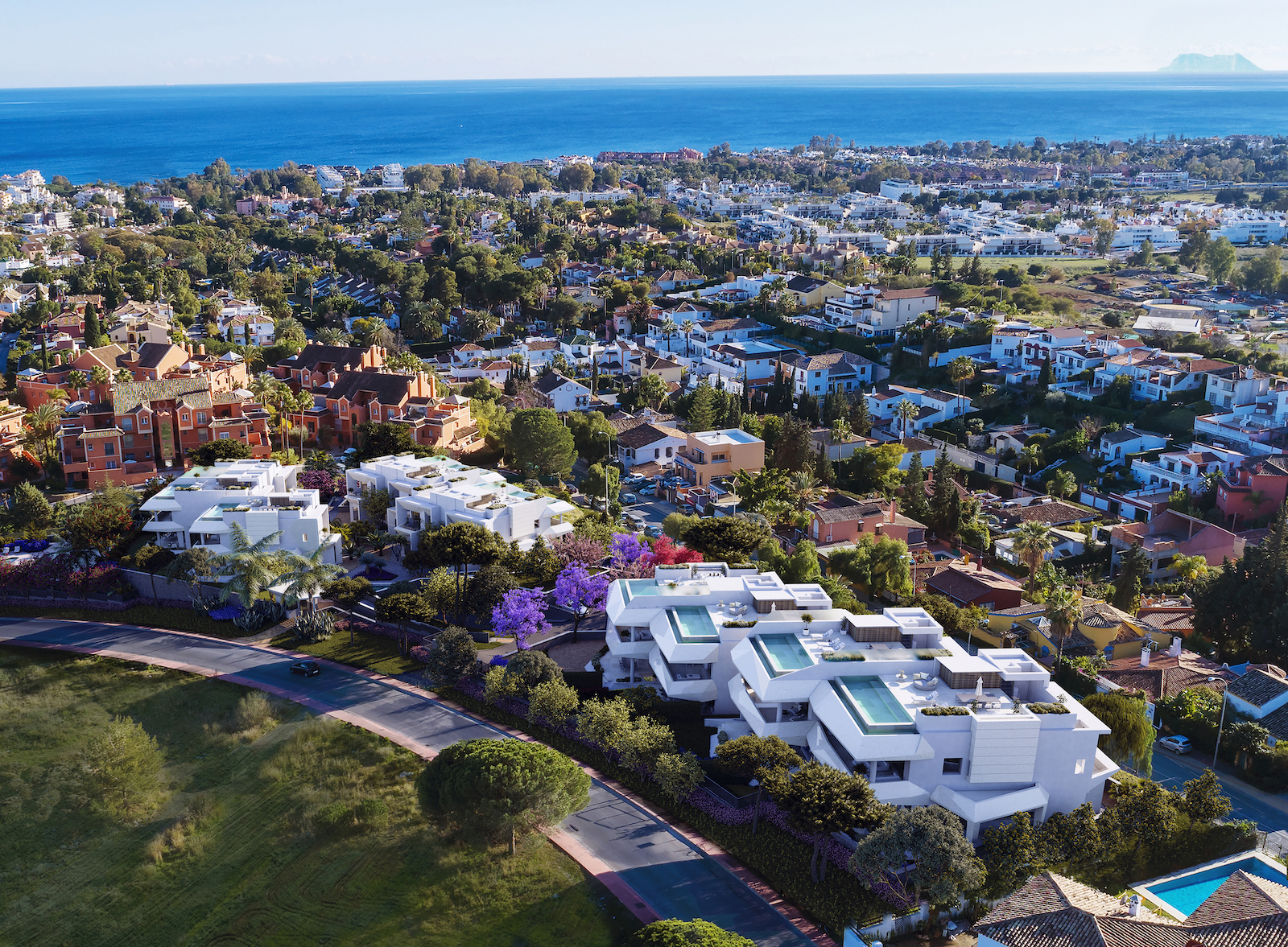 The 8 semi-detached houses are located in the middle of the plot, facing South-West with views to Africa and Gibraltar. You can choose from a variety of property types and proportions in spacious, beautifully finished homes with unique features such as stylish modern glass wine cellars – an outstanding design feature between kitchen and living room – and fantastic rooftop terraces with 8×3 metre infinity saltwater pools for the ultimate in Marbella lifestyle.