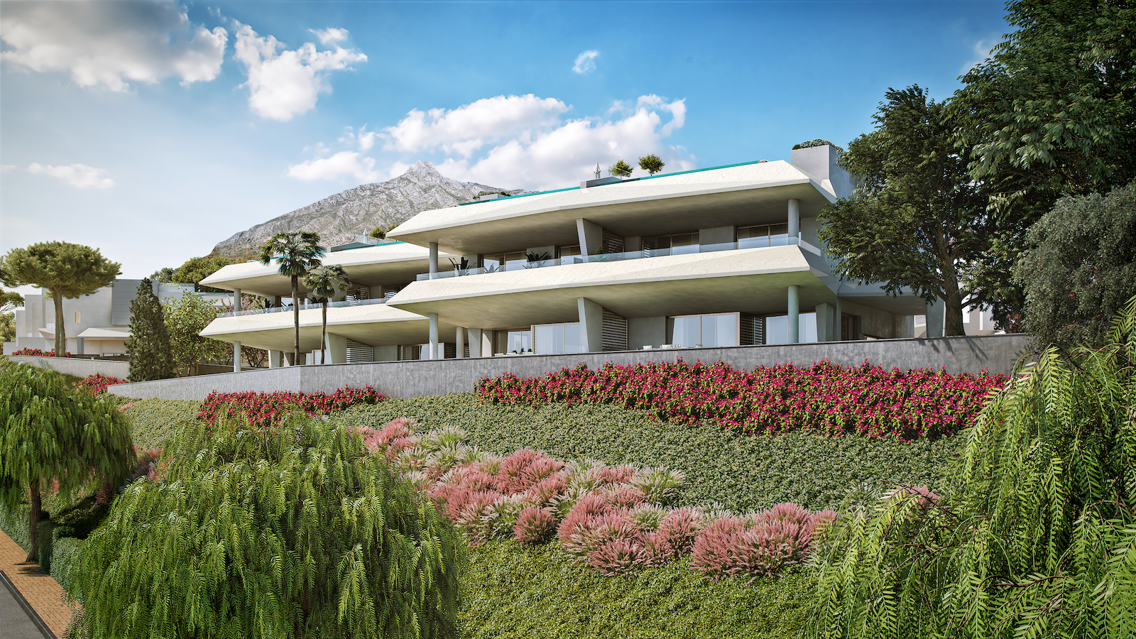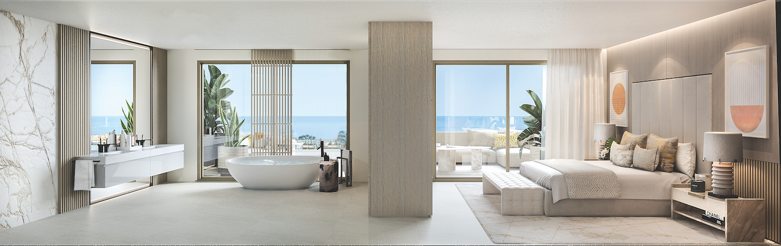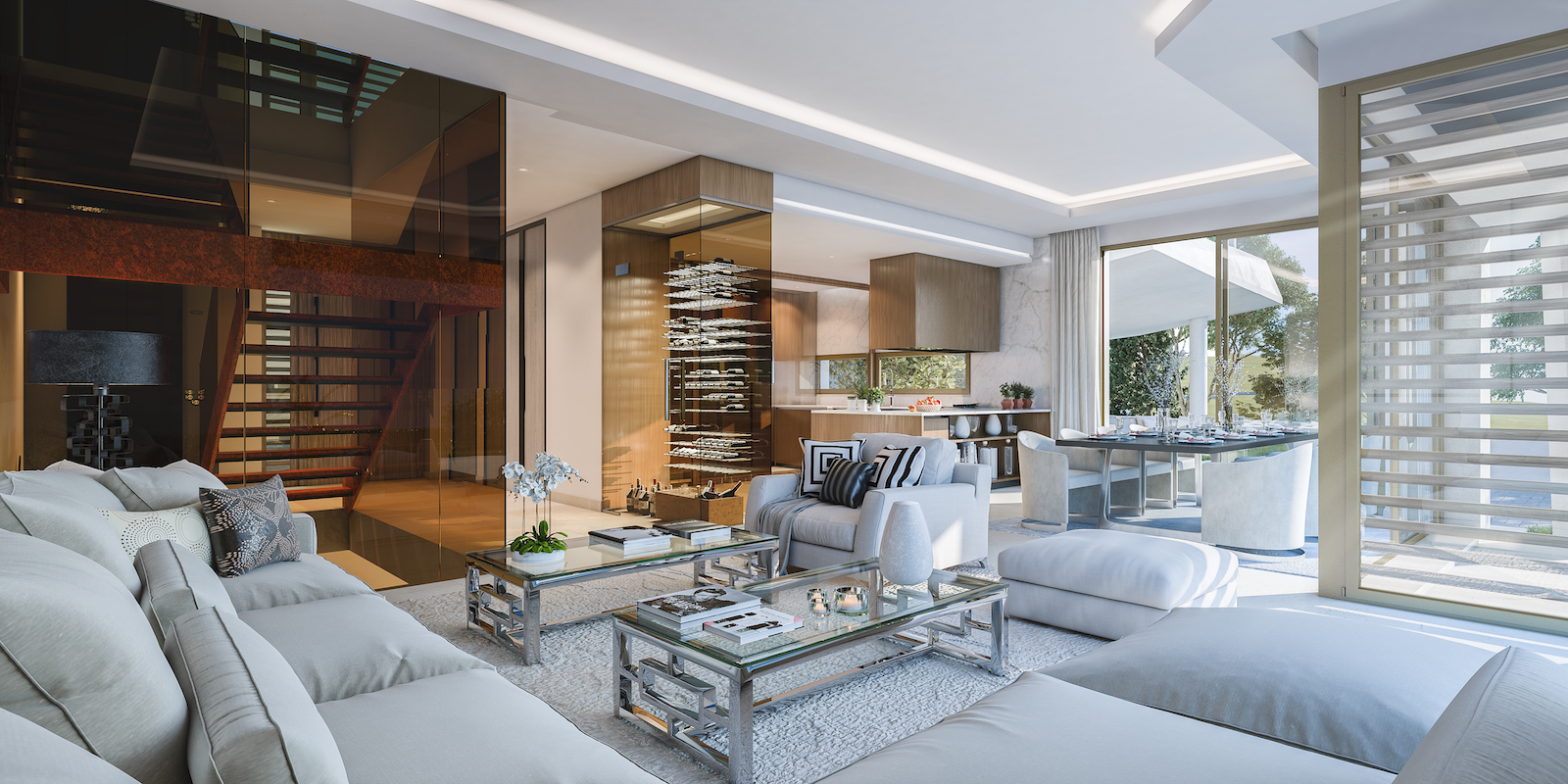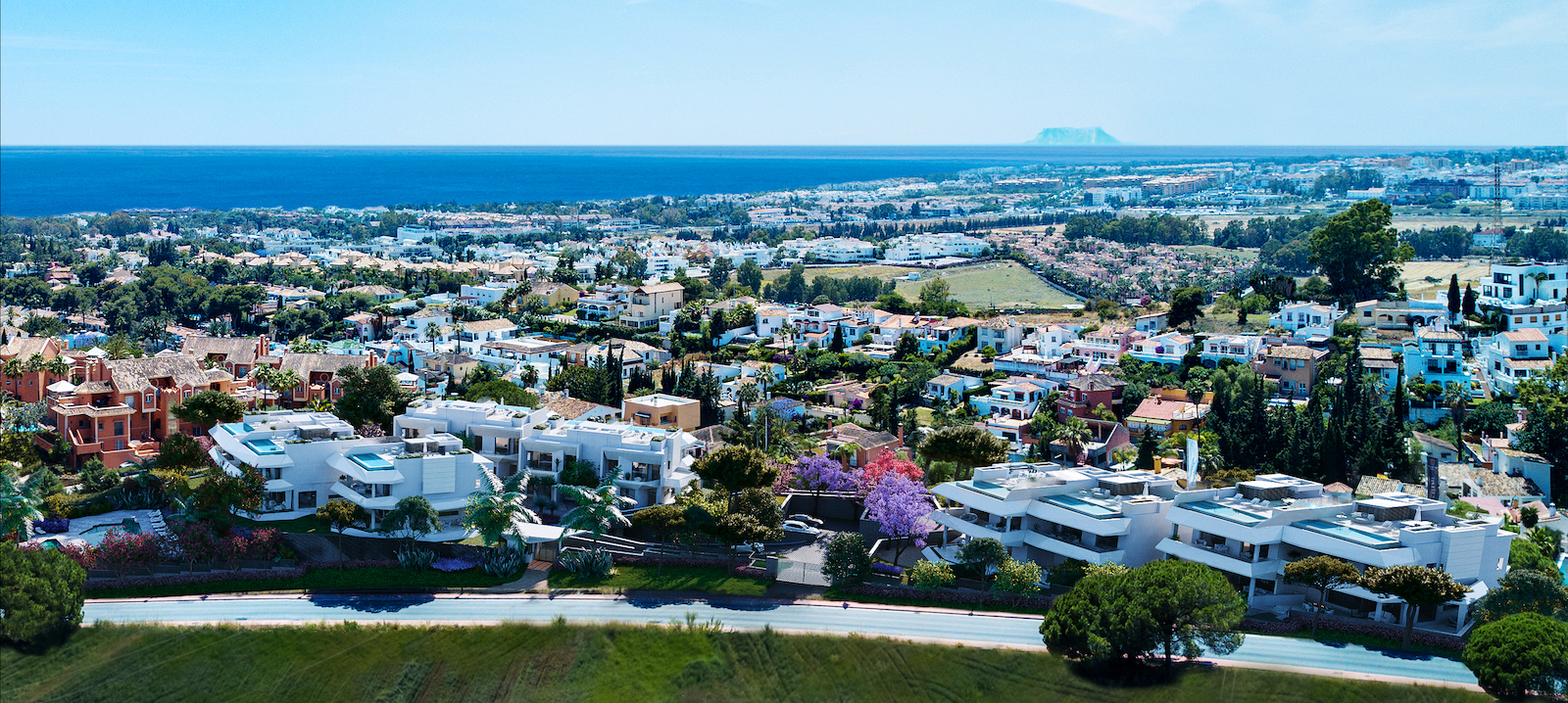 The 8 semi-detached houses are located in the middle of the plot, facing South-West with views to Africa and Gibraltar. You can choose from a variety of property types and proportions in spacious, beautifully finished homes with unique features such as stylish modern glass wine cellars – an outstanding design feature between kitchen and living room – and fantastic rooftop terraces with 8×3 metre infinity saltwater pools for the ultimate in Marbella lifestyle.