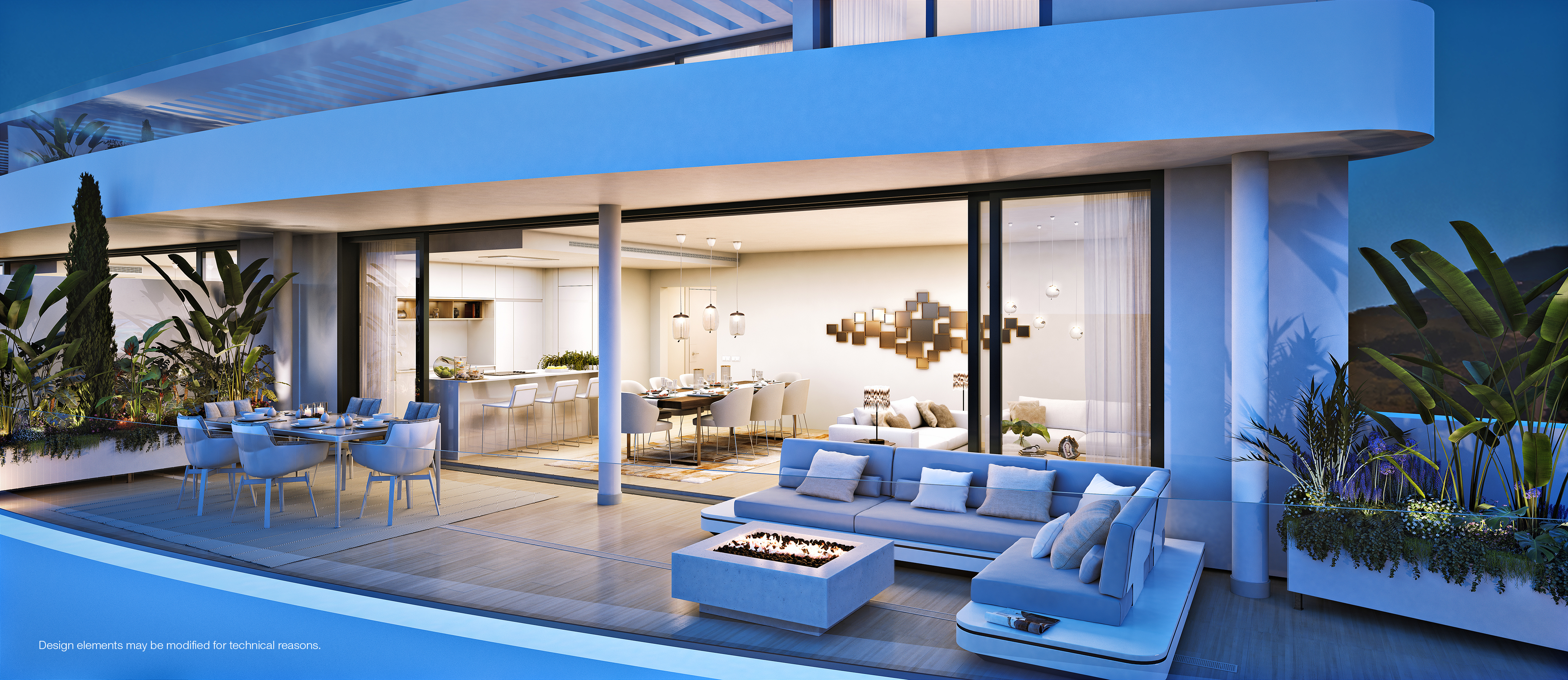 Luxury 2, 3, 4 bed apartments and garden or sky villas offer eco-friendly credentials and timeless style. The first 76 units are distributed over two and three floor configurations, the properties are located in small, intimate buildings that combine privacy with a perfect orientation and blend harmoniously into the beautiful surroundings. The apartments are open planned and spacious and have been designed to recreate the experience of residing in a villa. We achieve this by our unconventional approach where we move the sleeping area to the mountainside of the property and thus allowing for a third more living space, which combined with the oversized terraces effectively doubles the living area. This easy interaction between the living spaces creates a flexible, open area that is designed around the climate and lifestyle of southern Spain.