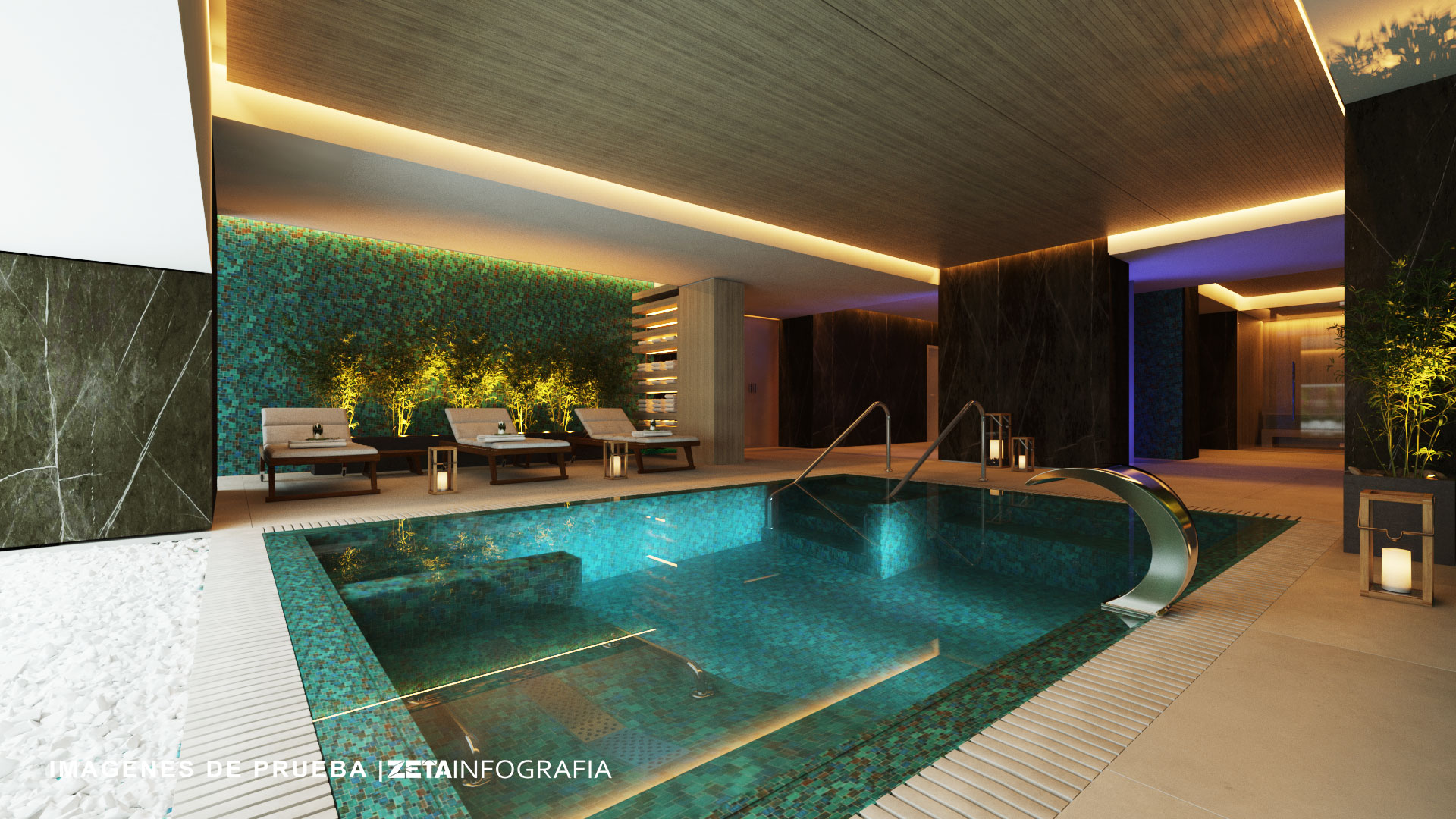 Common areas with three swimming pools, one heated and two outdoor, spa, gym, movie theater and playroom.