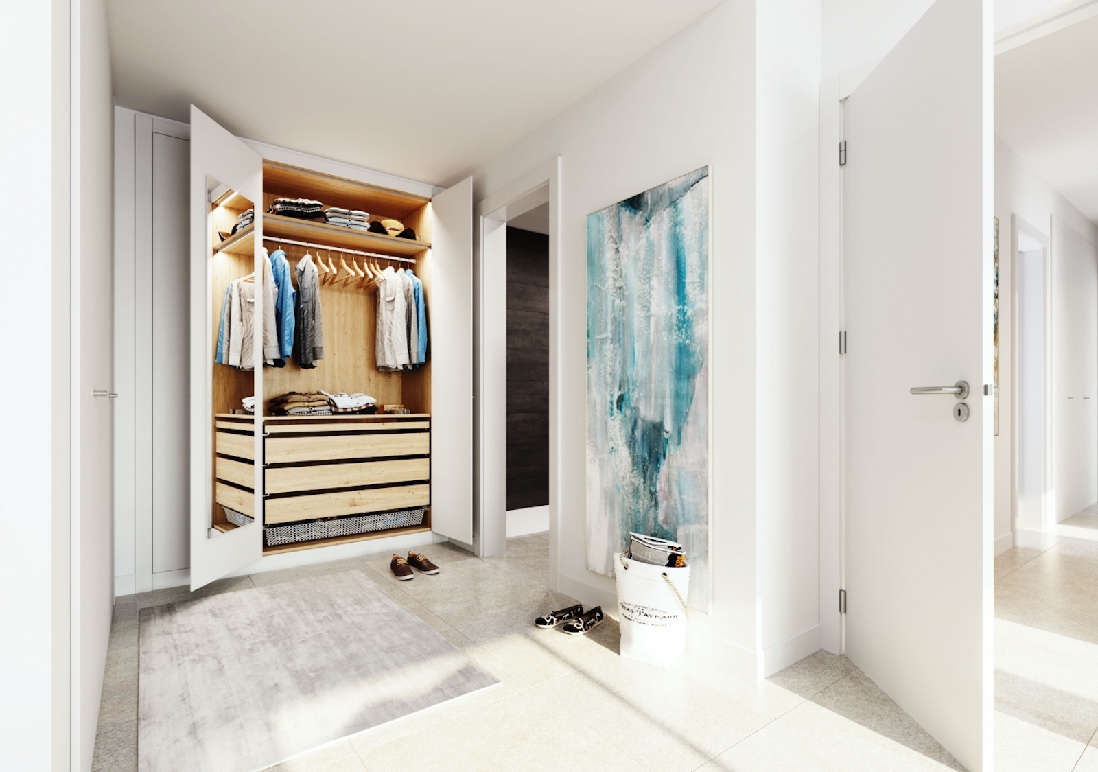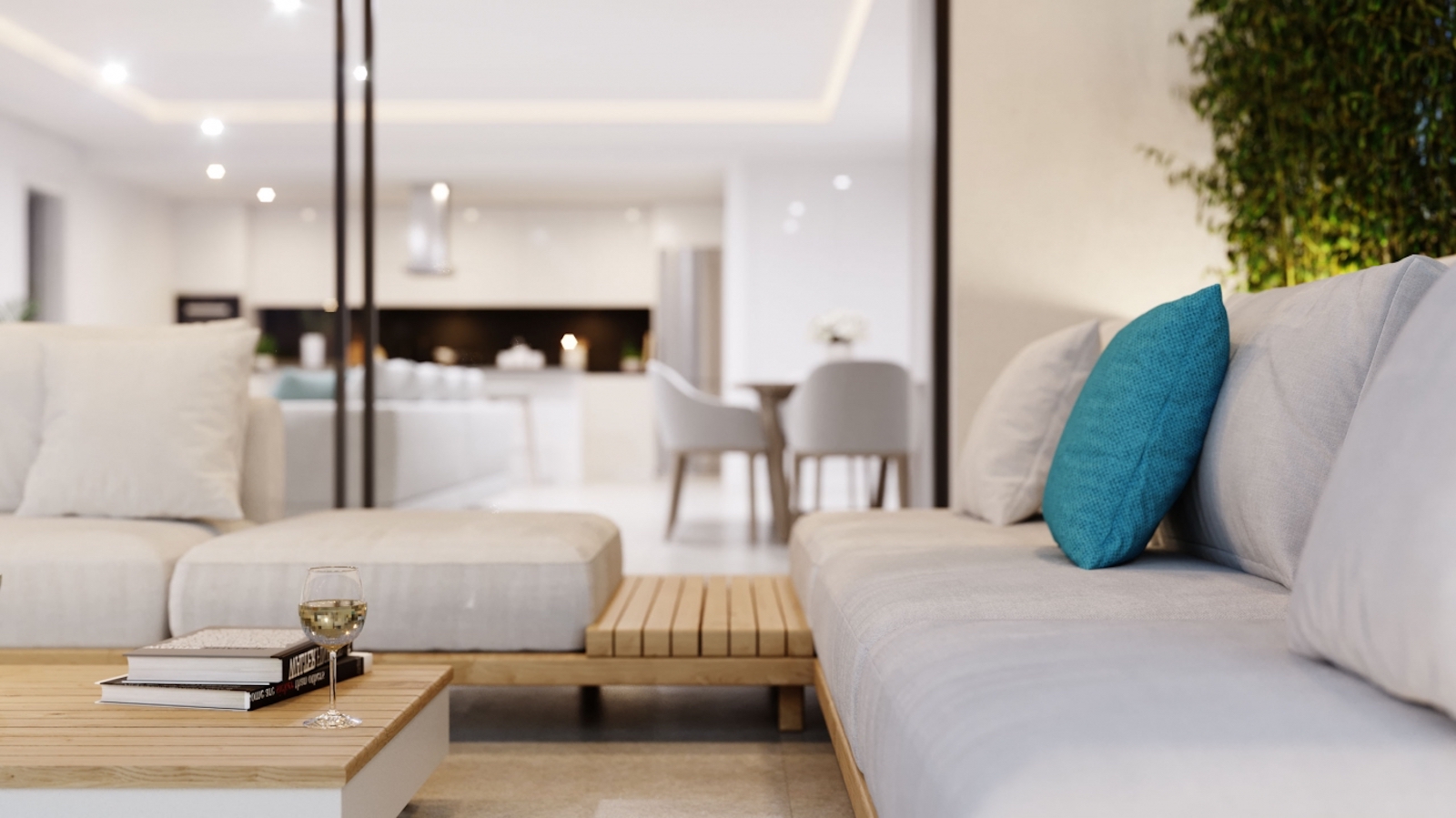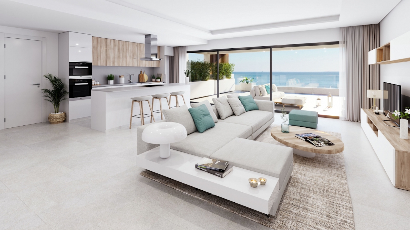 Apartments with south facing of 1, 2, 3 and 4 bedrooms and ground floor with private garden. All homes enjoy open furnished kitchens, designer bathrooms, spacious living rooms, high quality finishes, open spaces that allow the sea to flood all rooms and large terraces with panoramic views of the sea. In addition all the houses include a covered garage and storage room.
