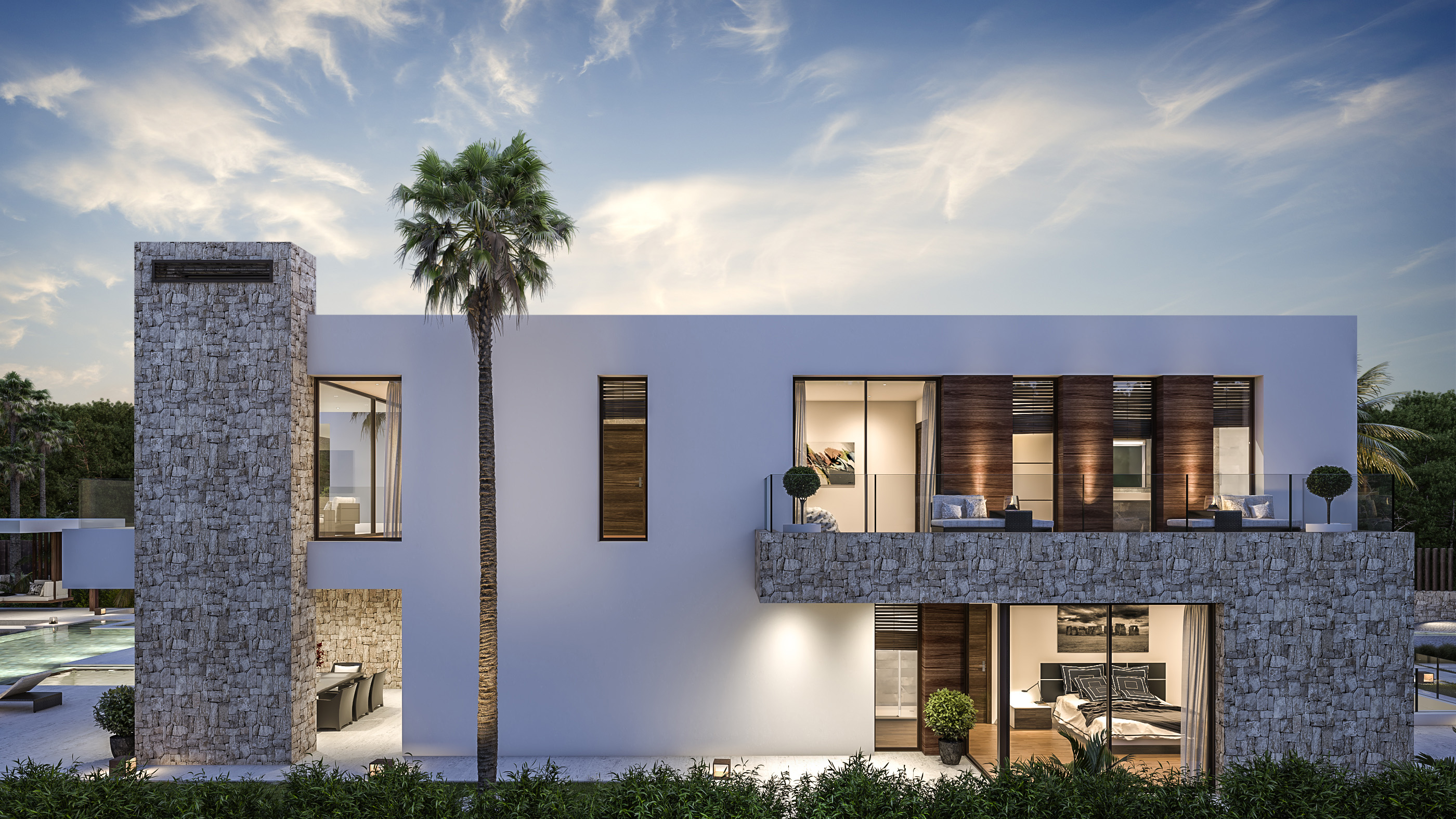 The main idea of the house is to generate a sequence of luminous spaces (interior and exterior) to the garden and pool open with a rotund geometry painted white but with some winks in stone that emphasize certain architectural elements. The access to the house is through a double height porch that overlooks the staircase. A large wooden door leads into a spectacular double-height hall crossed by the gallery that access the bedrooms upstairs. The large glass panels create transparency between the different spaces, simulating that all are connected, perspectives and garden view from anywhere in the house. The pond is the main protagonist, which overflows onto the pool and observe upon entering the house. Its base is made of glass and acts as a skylight introducing light into the spa area located in basement. Water is the protagonist of outdoor spaces. A second pond separates the access ramp to the basement of road access to covered parking near the entrance. In the infinity pool it has an integrated Jacuzzi and on the west corner of the plot is located a seating area from which to view the garden receiving the sunset. Transparencies, cross ventilation and light seeping into every corner, raise the sense of harmony in the set.