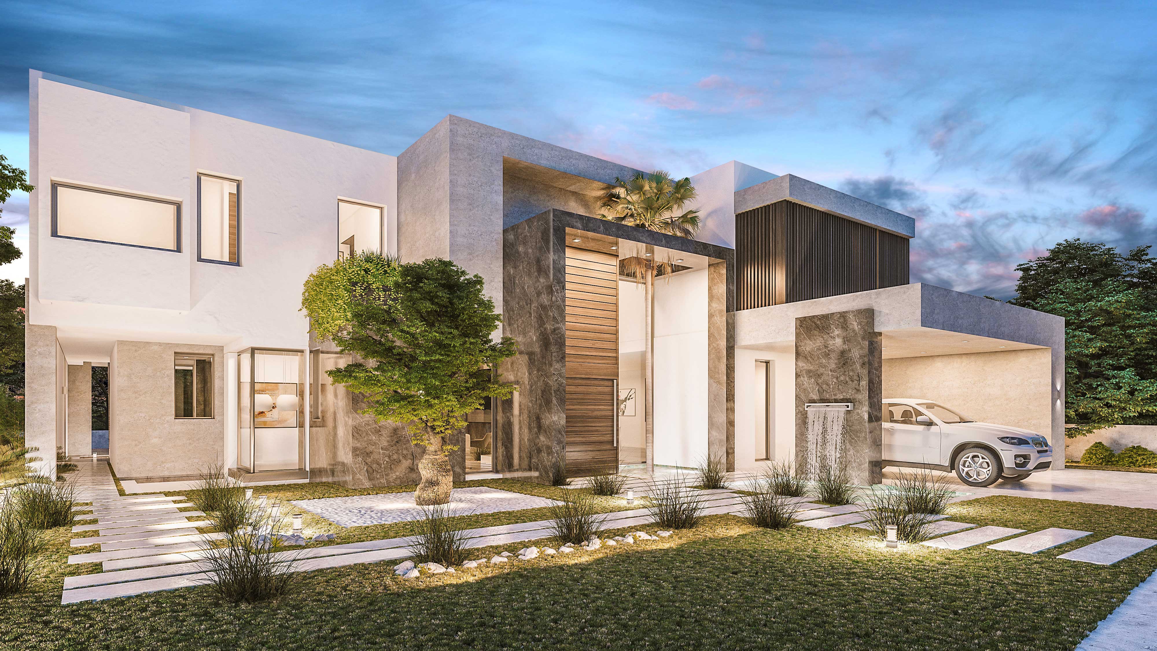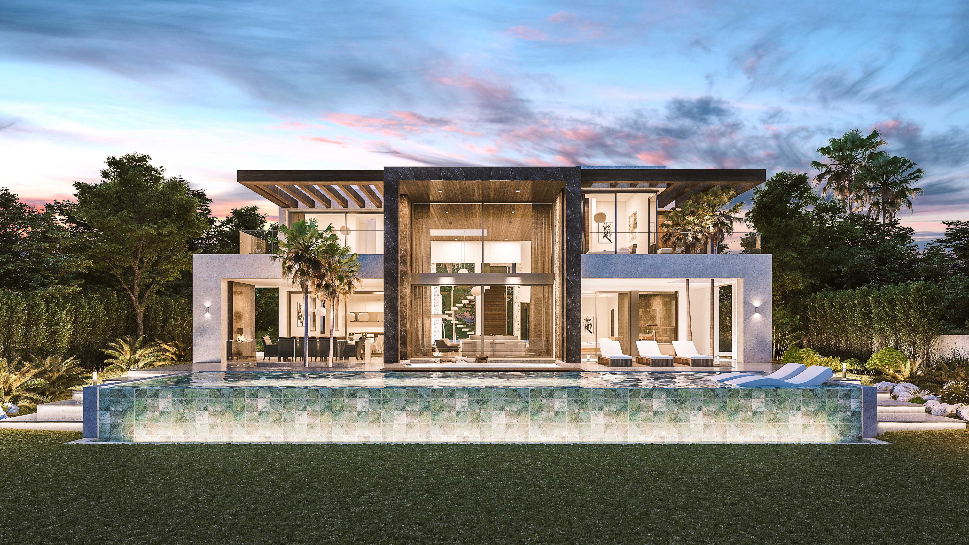 The design of this villa originates from a classical symmetry reinterpretation. Brings to life a double height porch that recalls of monumental buildings during classical Rome. This rotund element framed by natural black stone outlining a minimalist effect.
