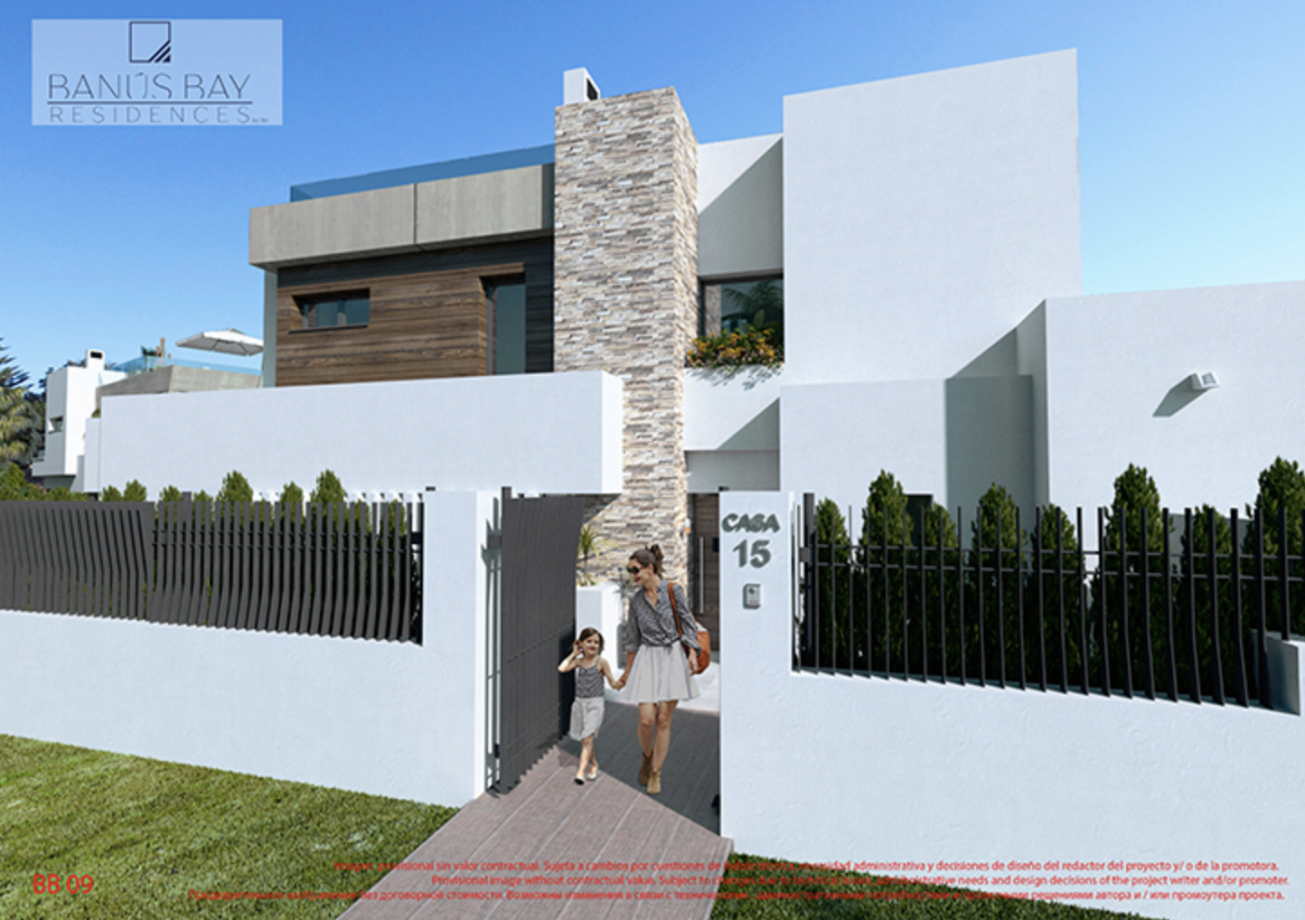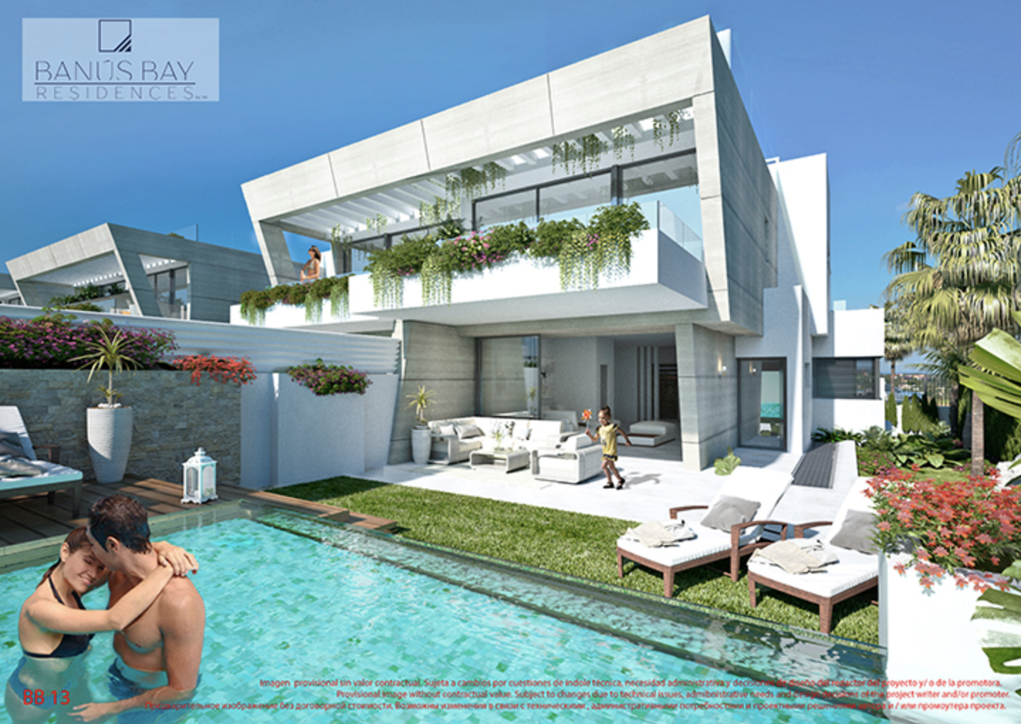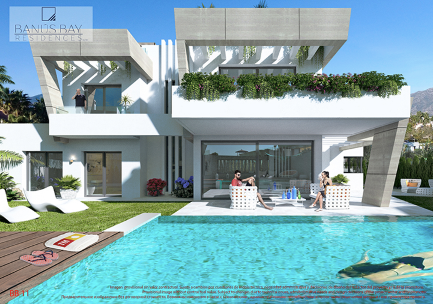 Banús Bay Residences is a residential of only 14 semi-detached villas and an independent villa, located in Puerto Banús, a privileged area of Marbella. The development has outdoor spaces with lush vegetation in line with its natural setting, a Malaga area that enjoys an enviable landscape quality. Its architecture, with large windows and bright rooms invites to enjoy the mediterranean lifestyle, specially from the private natural grass garden with swimming pool and solarium of the properties. Modern design homes built to maximize comfort and relaxation, and which layout focuses on detail, privacy and the views to the beautiful surroundings. The Residential Complex has video surveillance cameras and a maintenance and security service. Exclusive homes in a select enclave that boasts a great socio-cultural wealth, and is endowed with a wide variety of quality leisure options with infinite possibilities of enjoyment.