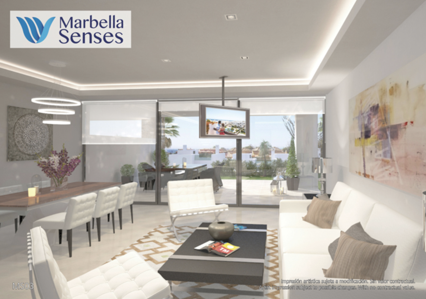 Marbella Senses comprises spacious townhouses on a privileged site on the famous Golden Mile of Marbella, in Costa del Sol, Spain. This fantastic residential estate has just 24 homes facing the sea, with large landscaped areas, grass lawns and beautiful walkways. There are three swimming pools on the estate: a children's pool, a heated pool for swimming, and another, recreational infinity pool of 100m2 with hydromassage. Due to its exceptional location, just a few metres from the Nägueles beach, and with direct links to the A7 motorway and the N-340 national route, as well as its modern, elegant and bright design, Marbella Senses is one of the most attractive projects to be found in the Lomas de Puente Romano area.