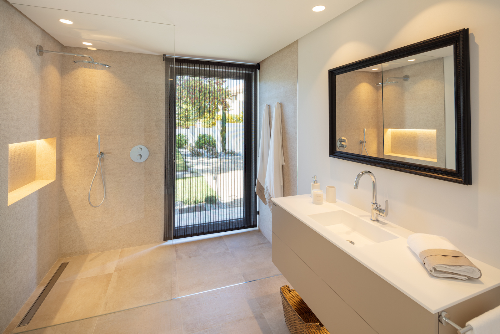 The main accommodation extends over two floors. It features five spacious en-suite bedrooms, five bathrooms, a guest toilet, open plan living room, with direct access to the outdoor terrace. The living room, with feature fireplace, leads you onto a large dining area, open plan kitchen and breakfast area.