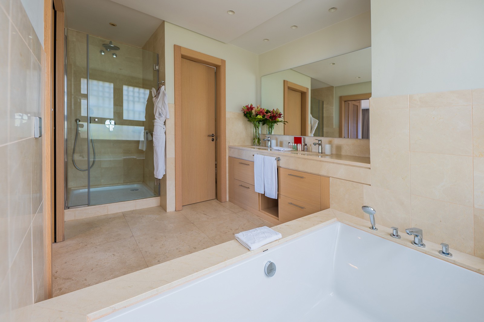 Walnut furniture, marble tiles, and natural silk and linen fibres give the rustic colonial decoration a sense of warmth and durability. As in all the Las Terrazas luxury apartments, the bathrooms include baths as well as showers.