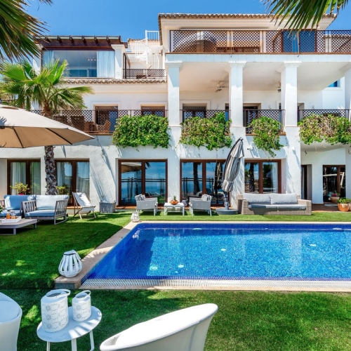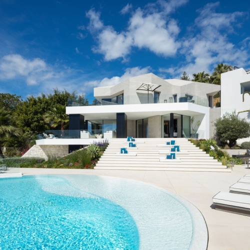 Situated on a gated community just a short walk from the beautiful village of Benahavis and all its famous restaurants, and just seven kilometres inland from the glamourous coastal hotspots of Puerto Banus and Marbella lies this contemporary south facing villa with absolutely stunning views out over the Mediterranean. This is a very spacious property with five large en-suite bedrooms distributed over three floors. The living & dining areas are open plan with lots of windows giving it a bright and airy feel throughout the day. Off the living room is a covered terrace which looks out to the heated pool and gardens, both maintained by the community and enjoy those amazing views out over the Mediterranean and La Concha mountain. The dining area is separated by the central fireplace and leads through to the large modern kitchen and breakfast area. The enormous lower level is currently used as a games room with bar, cinema and gym and enjoys natural light and views over the mountains. The standard of finish is high with underfloor heating in the bathrooms and good quality doors, windows and marble floors. The villa has private parking for two cars and plenty of storage rooms. The development is gated and has 24h security guards. This villa would make a fantastic low maintenance permanent residence or a perfect lock up and leave holiday home, which also has fantastic rental potential.
