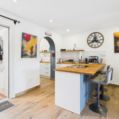 Villan är omgiven av en lummig trädgård med fruktträd, vilket ger en naturlig oas precis utanför dörren. Huset är helt ombyggt med utsökta material och har höga takbjälkar som ger en touch av rustik elegans. Det rymliga vardagsrummet med en mysig öppen spis övergår sömlöst i ett fullt utrustat kök, vilket gör det perfekt för både avkoppling och underhållning.