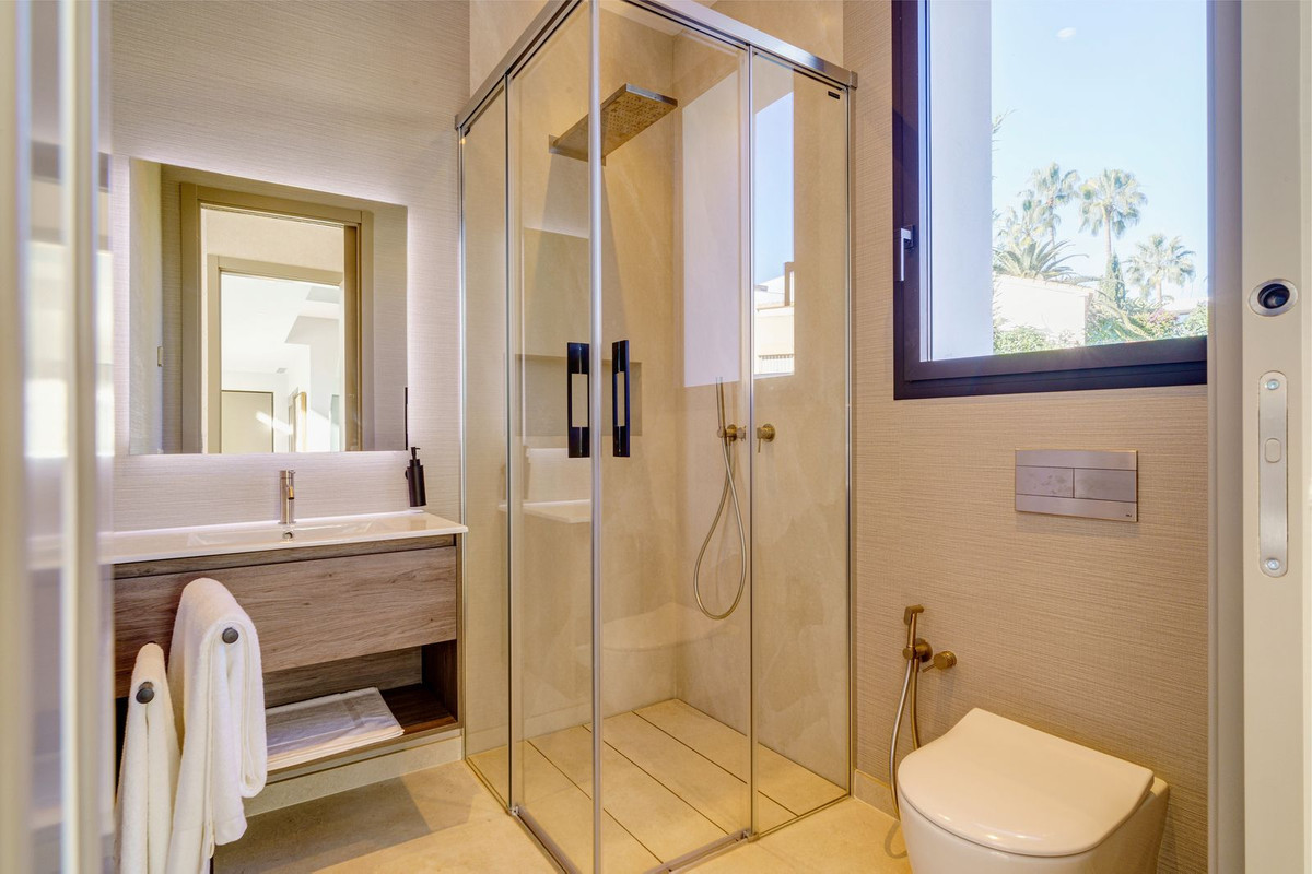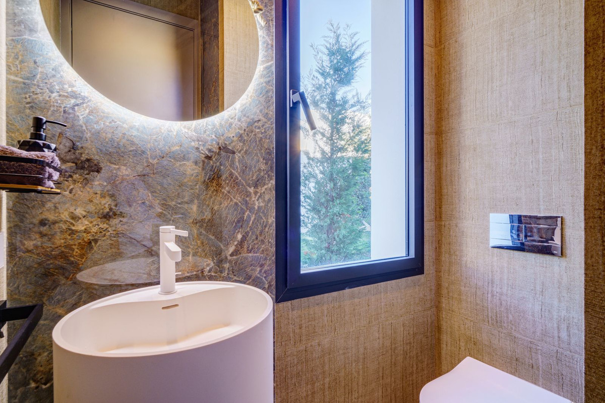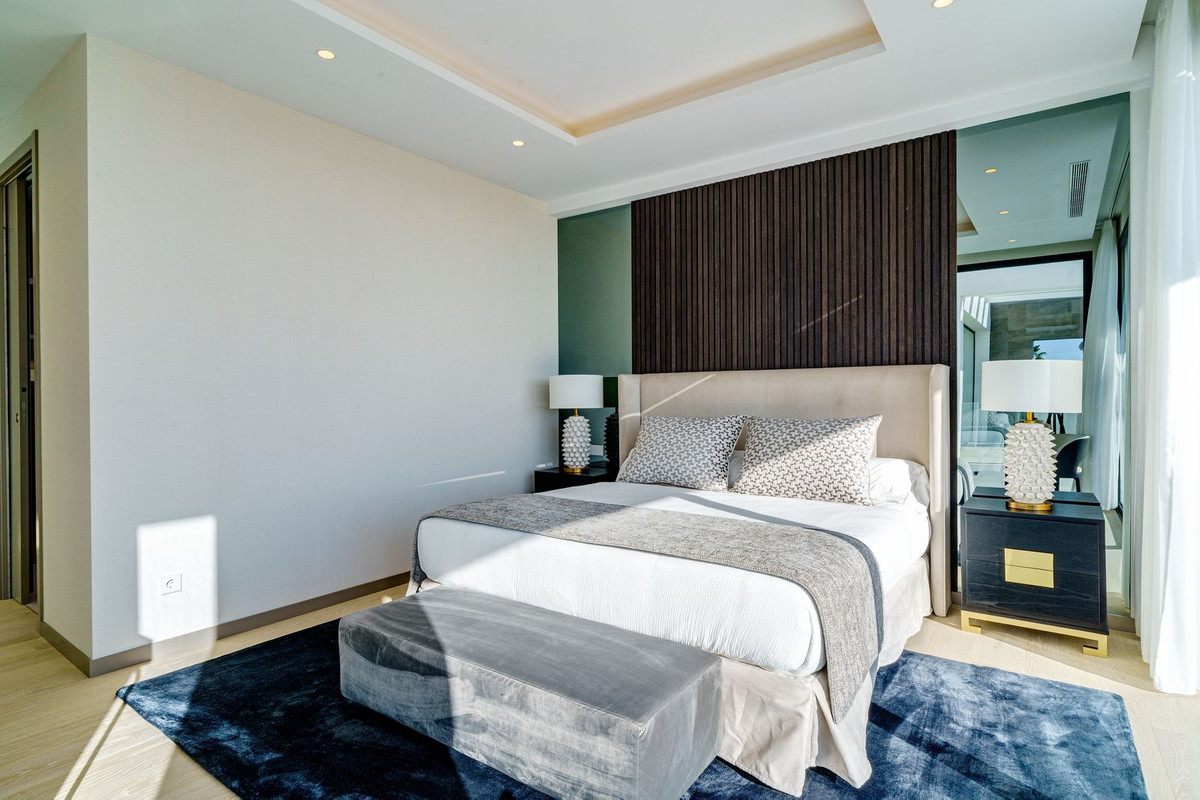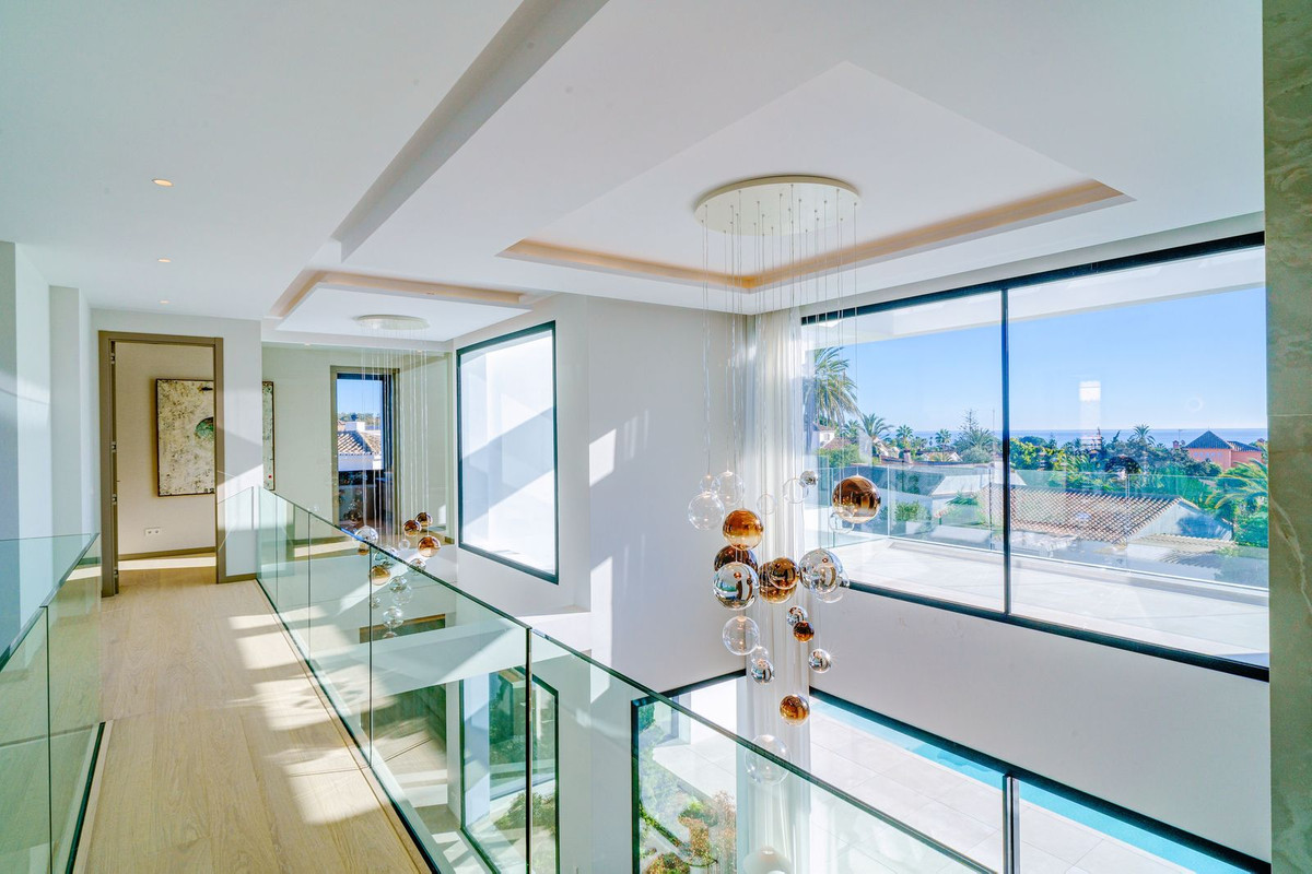 There is one large guest bedroom with en suite bathroom as well as a powder room on the same floor. The wide floating gallery staircase takes us to the first floor, where we find two fabulous bedrooms with en suite bathrooms and access to their own private terraces. One of the bedrooms belongs to the Master Bedroom suite with a spacious dressing room, full bathroom with a bathtub, walk-in shower and double sink. Both bedrooms enjoy lovely sea view from this level, which also leads us to an outside staircase up towards a 100m2 solarium on the top of the villa. Here we have amazing sea views and plenty of space for a chill out, jacuzzi, outdoor gym, a BBQ area, etc..