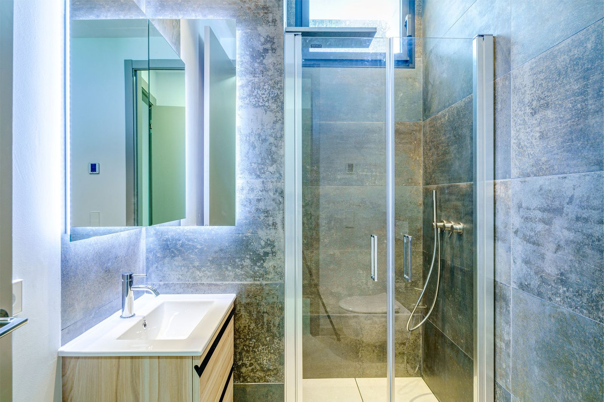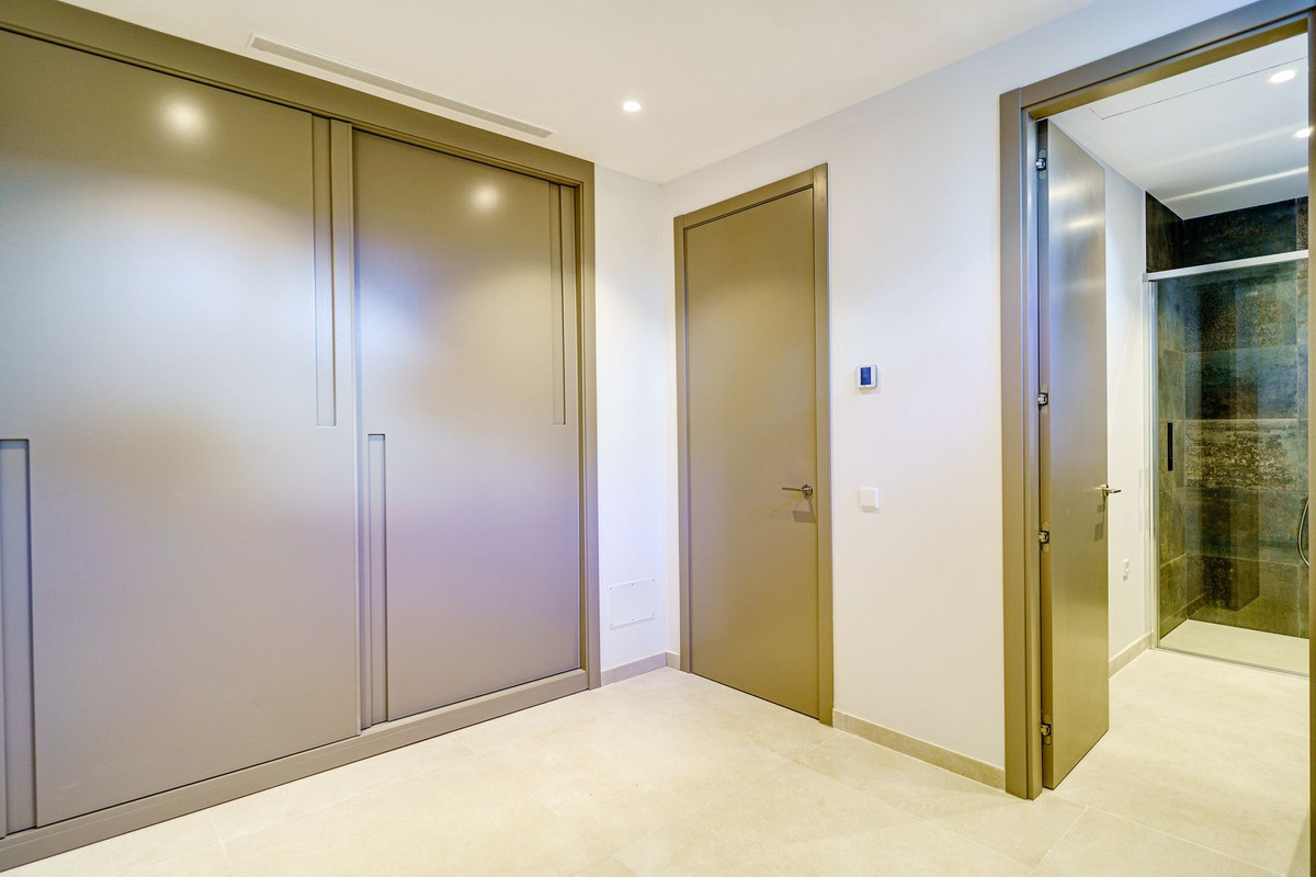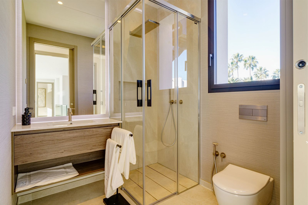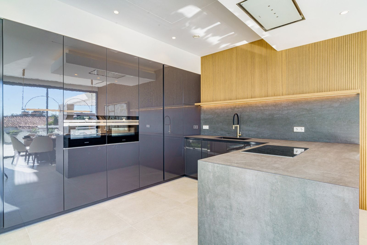 There is one large guest bedroom with en suite bathroom as well as a powder room on the same floor. The wide floating gallery staircase takes us to the first floor, where we find two fabulous bedrooms with en suite bathrooms and access to their own private terraces. One of the bedrooms belongs to the Master Bedroom suite with a spacious dressing room, full bathroom with a bathtub, walk-in shower and double sink. Both bedrooms enjoy lovely sea view from this level, which also leads us to an outside staircase up towards a 100m2 solarium on the top of the villa. Here we have amazing sea views and plenty of space for a chill out, jacuzzi, outdoor gym, a BBQ area, etc..