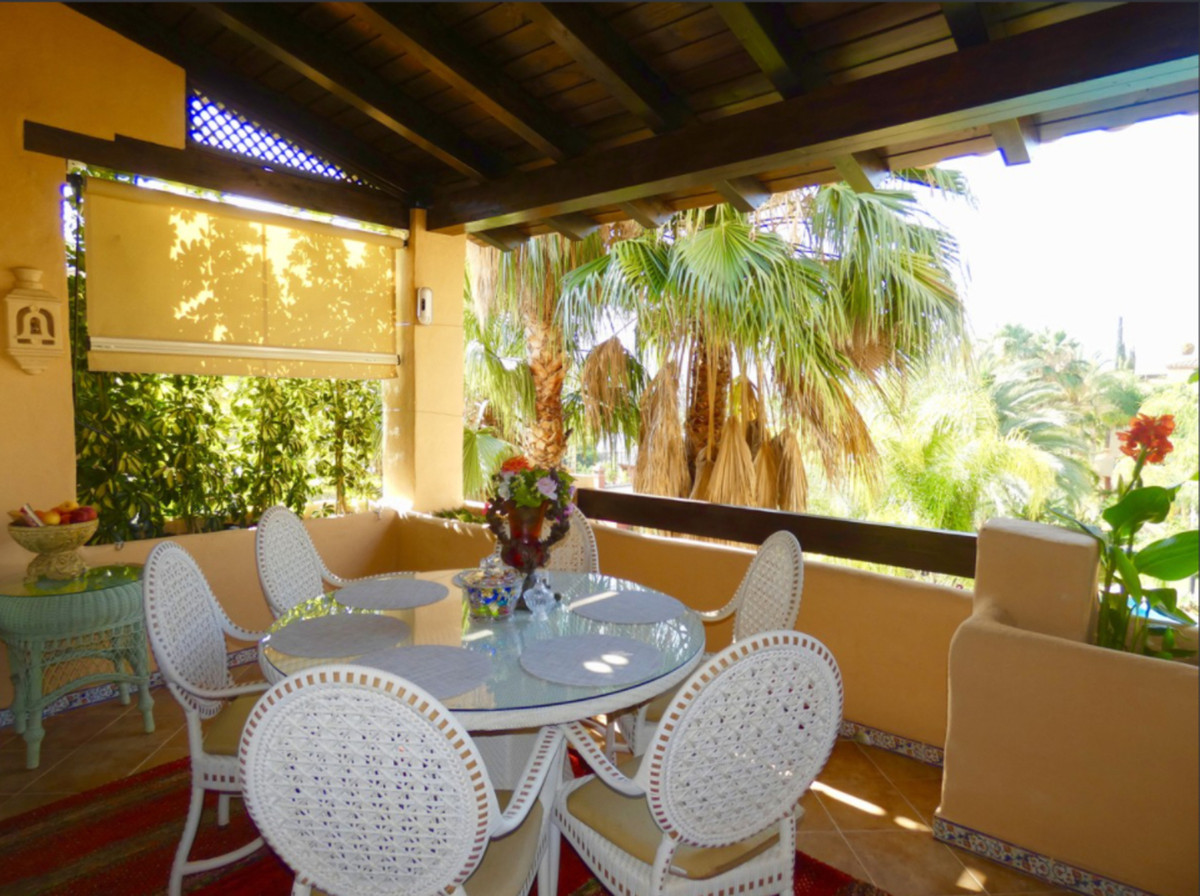 Denna terrass har söderläge med fantastisk utsikt över havet, bergen och de gemensamma trädgårdarna och poolen, matsalen och köket med grill.