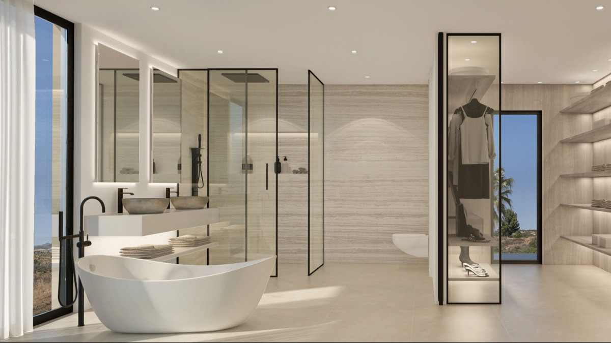 Övervåning: master bedroom med en-suite badrum, stor walk-in-garderob och terrass med utsikt över Mijas kullar och havet; extra gästrum med en-suite badrum och privat terrass.
