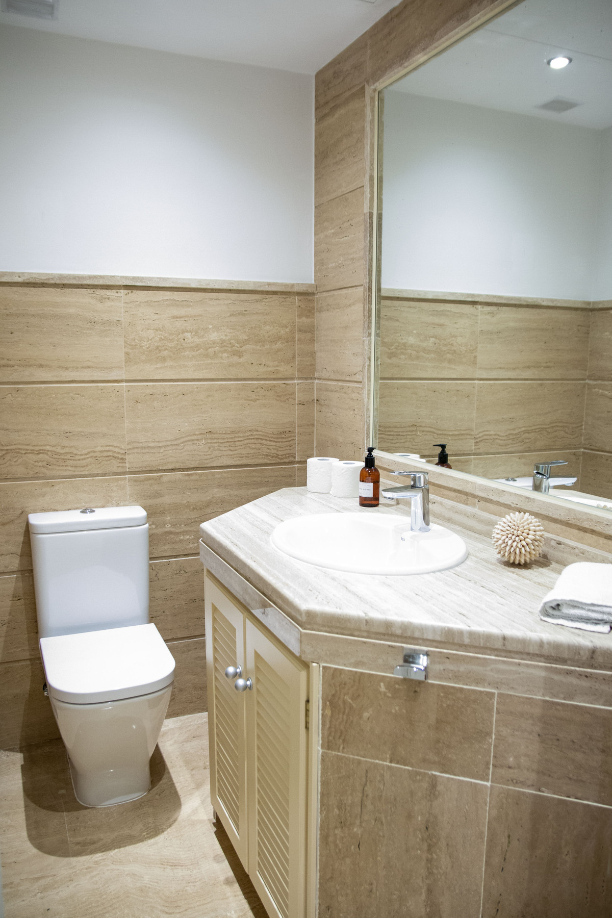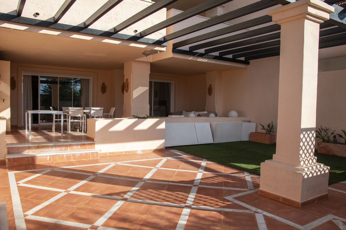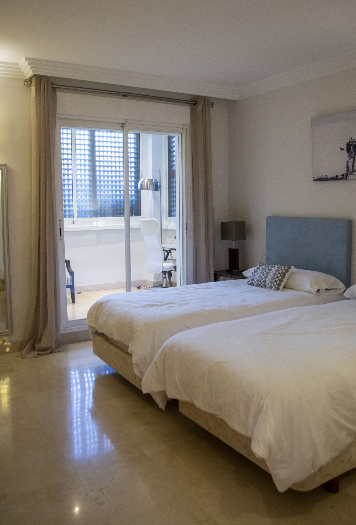 Gated and with 24 hr security we are offering this large 2 bedroom apartment with huge 2 level terrace. Entering the grand foyer immediately you get the sense of quality with an elevator to the garage area. The apartment has a large hallway when you enter, to the left a long kitchen with breakfast area and laundry room at the end. Living room is a really good size and comes with a real working fireplace. Plenty of room for a large dining table with 6 chairs. The 2 bedrooms are both en-suite with the 2nd bedroom also having its own small terrace. Guest toilet in the hallway. The double terrace to the back of the apartment is a great size with space for a jacuzzi, sunbeds and table and chairs.