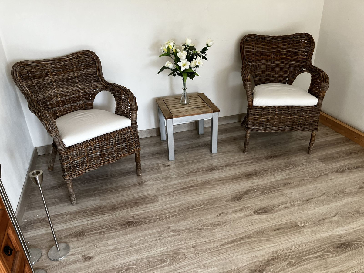 * Interiördetaljer: Köket och badrummet har klinkergolv, medan vardagsrummet har trägolv. Den täckta terrassen och huset tillsammans är på 50 kvm.