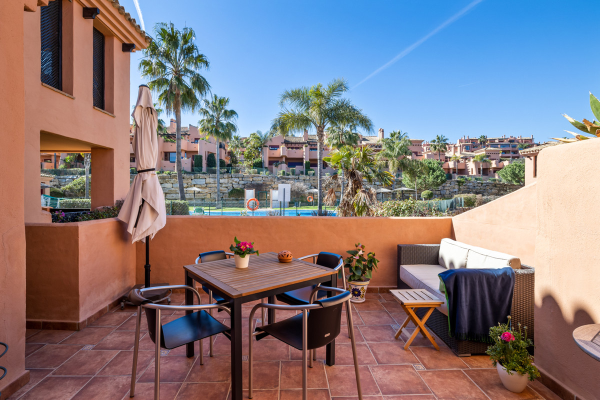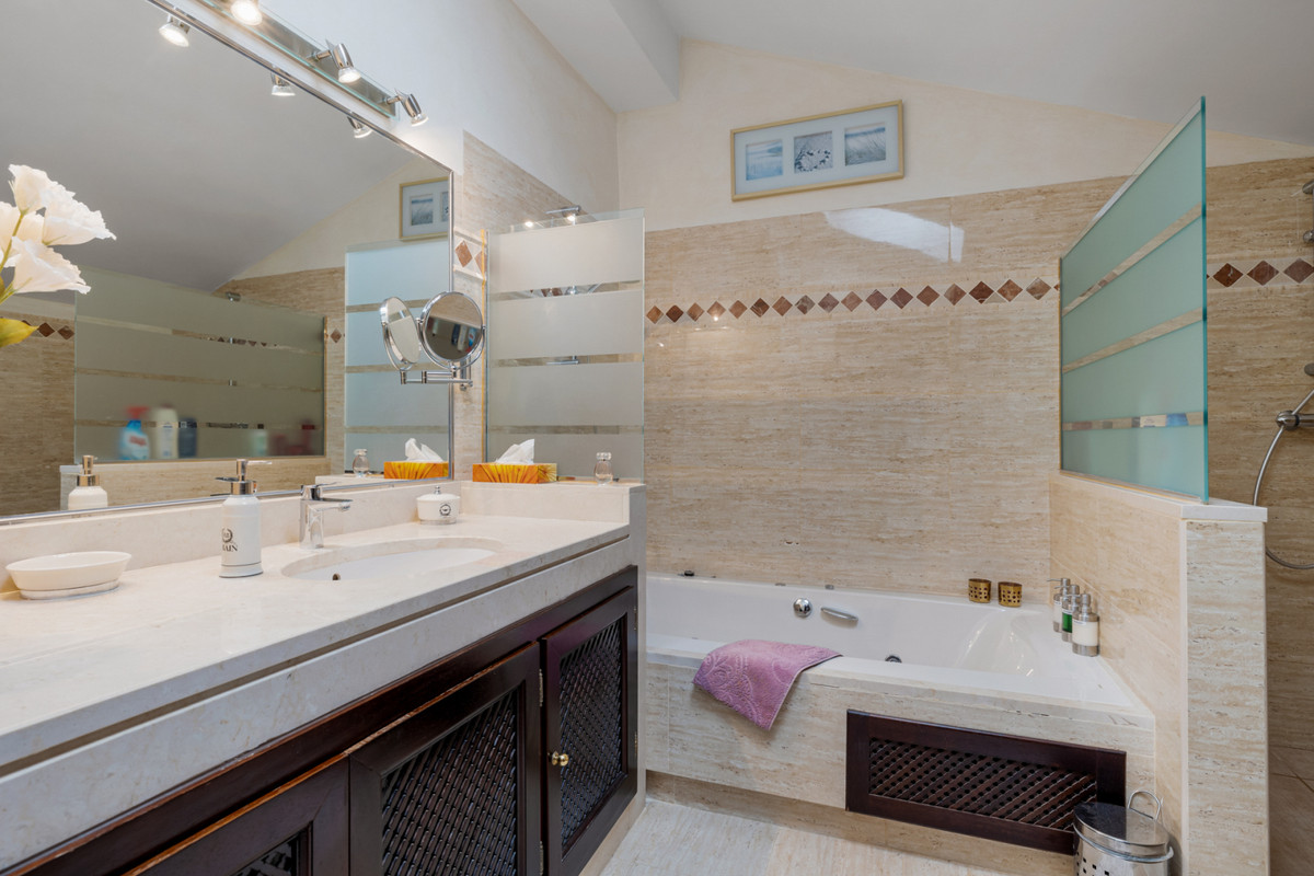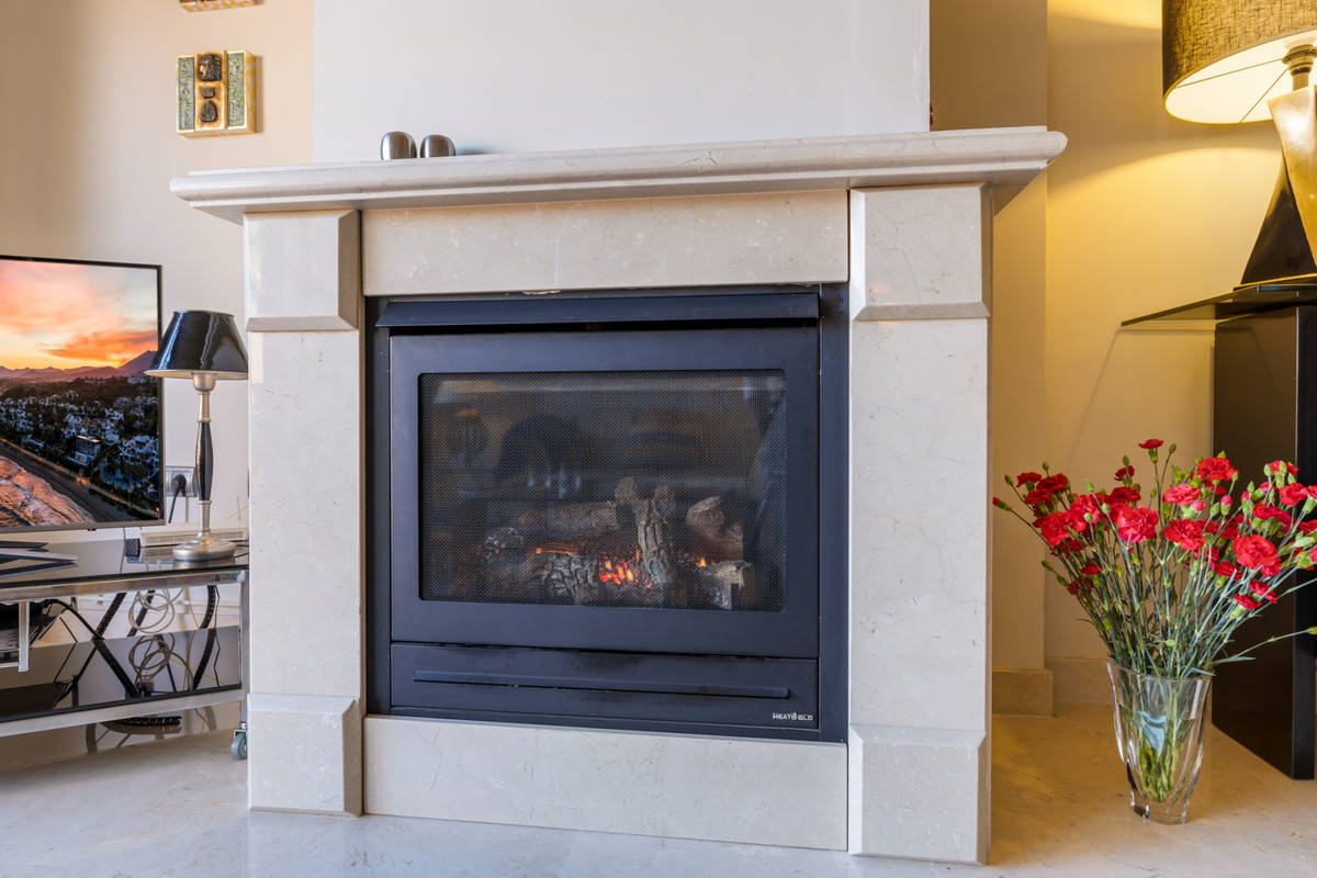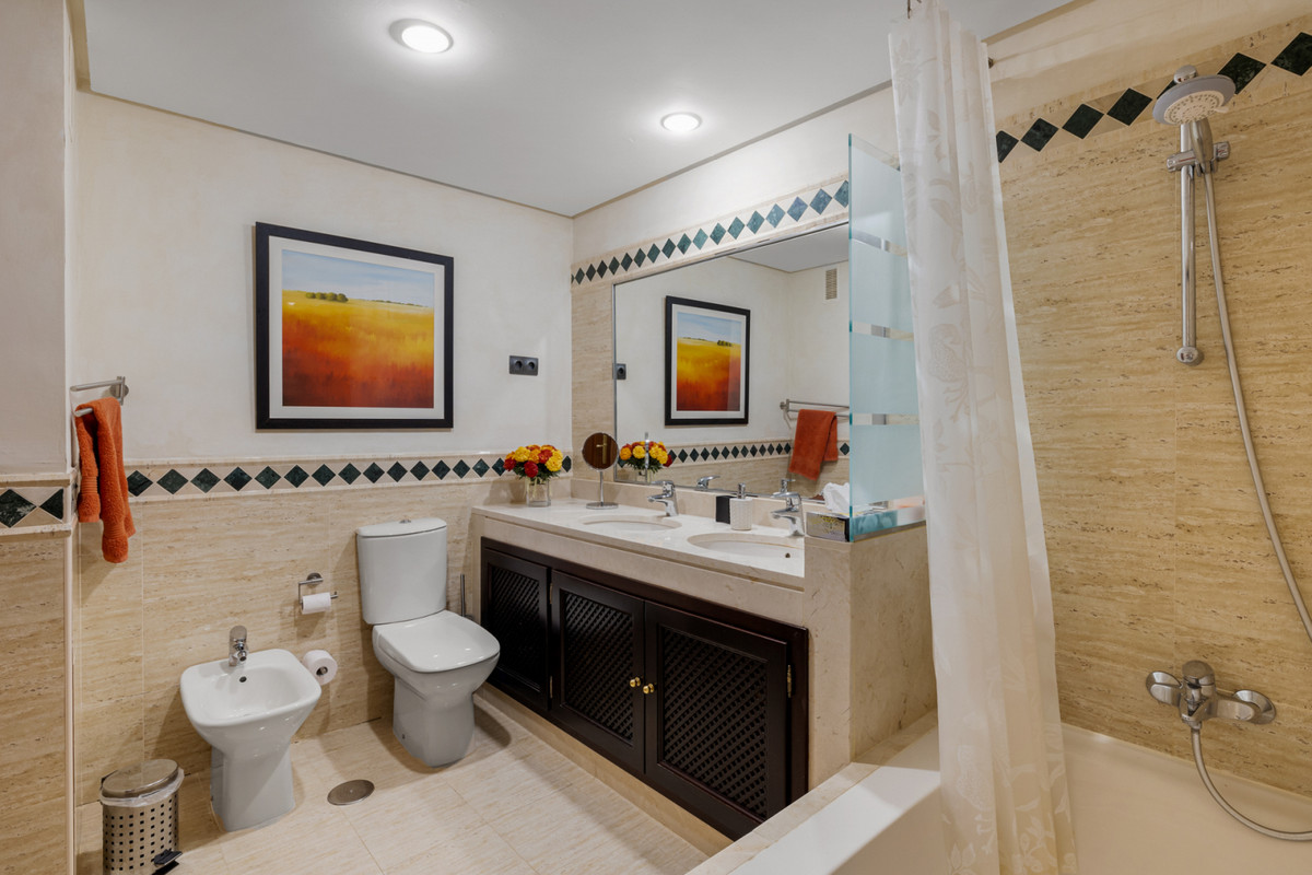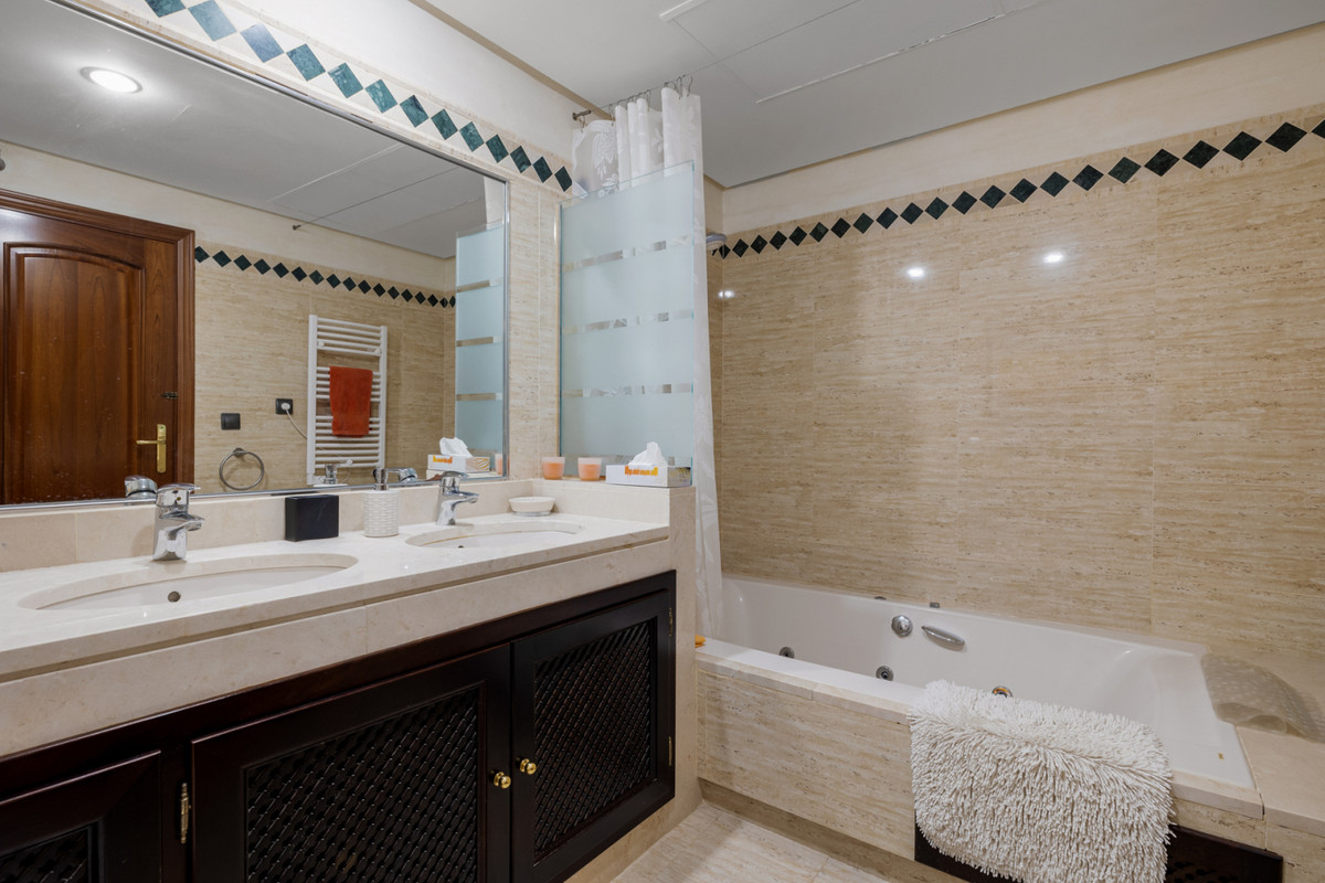 From the living room with high ceilings there is direct access to the residence's largest terrace, from which you have a view of the spectacular Mijas Sierra mountain range. It is one of the most amazing views on the coast! The apartment is a duplex apartment and on the ground floor you will find the living room, dining area and main terrace; kitchen and utility room; two bedrooms, a family bathroom and another terrace, which overlooks the pool area and the tropical garden. The entire top floor is a master suite complete with dressing area, ensuite bathroom and private patio.