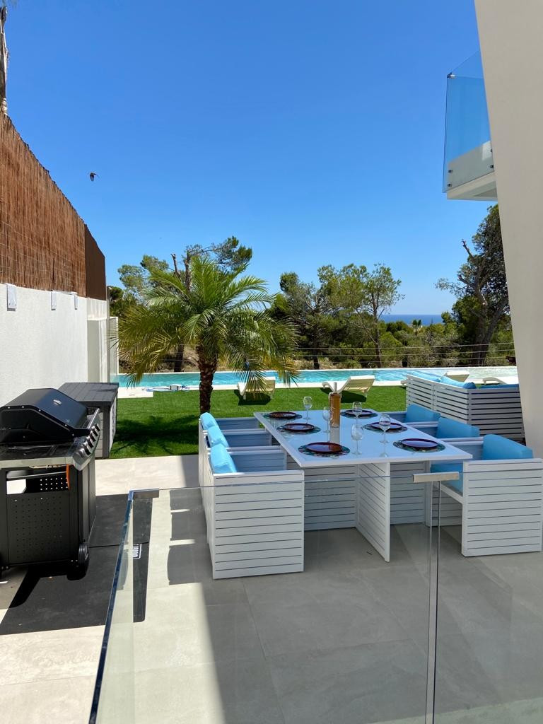 A spectacular villa built on a plot of 460 m2 and 268 m2 built with 3 bedrooms and 4 bathrooms, distributed over two floors and a large basement. This magnificent house close to the sea is west facing, with wonderful panoramic views of the sea and of a pine forest replenished with exuberant nature. \n