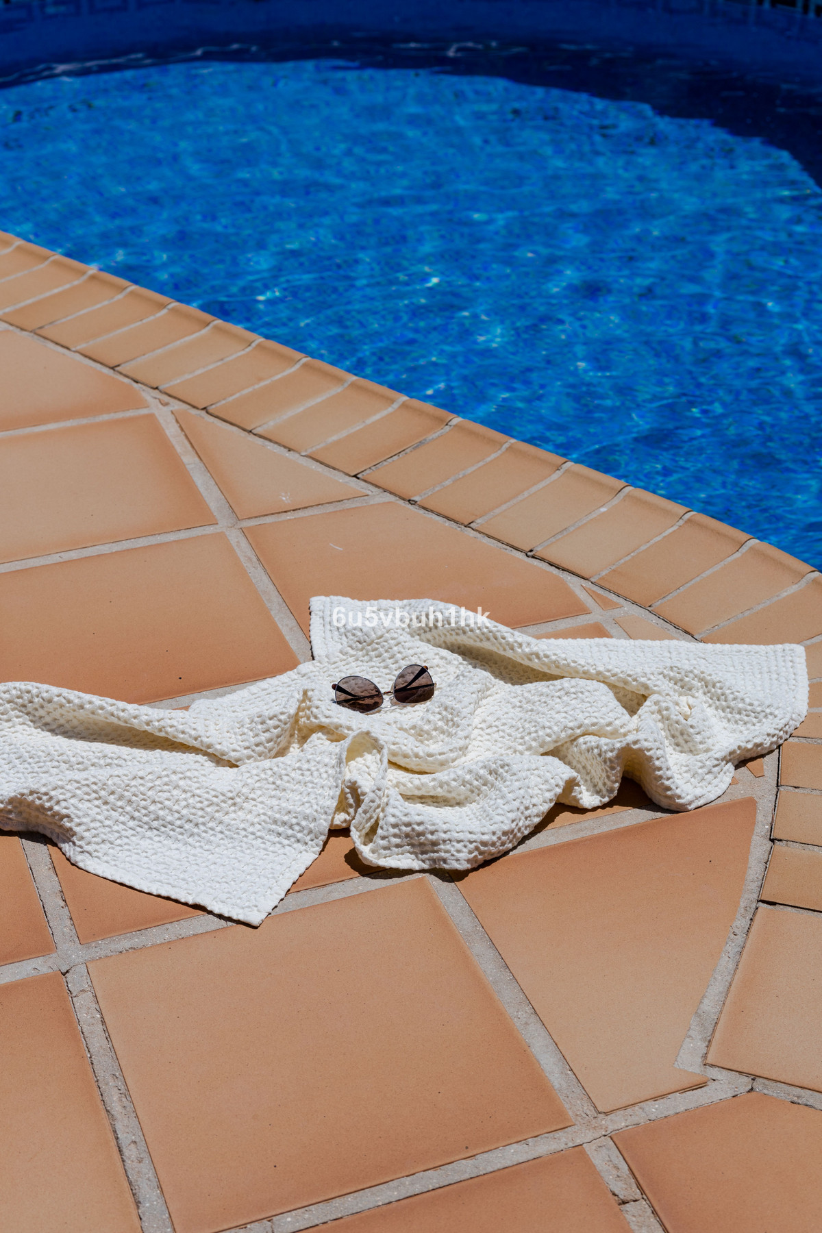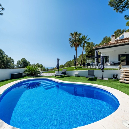 We access to the plot from the lowest level, so the house is reached through a ramp, under an impressive perspective. The image of the villa from the entrance is beautiful. A majestic wooden door leads us to a spacious double height hall and elegant staircase. The garden and pool are on the same level as the first floor. It is tastefully designed and combines grassy areas with gravel islands and some trees. The pool and the beach bar area are at the southernmost one.