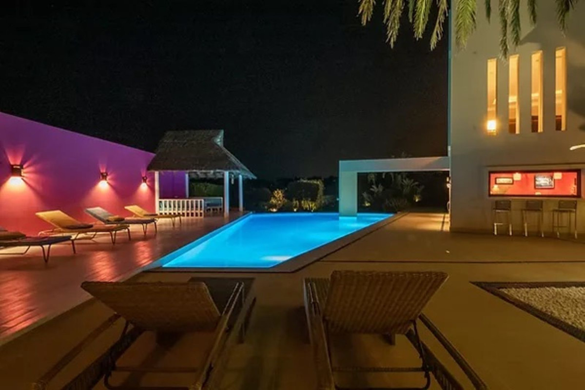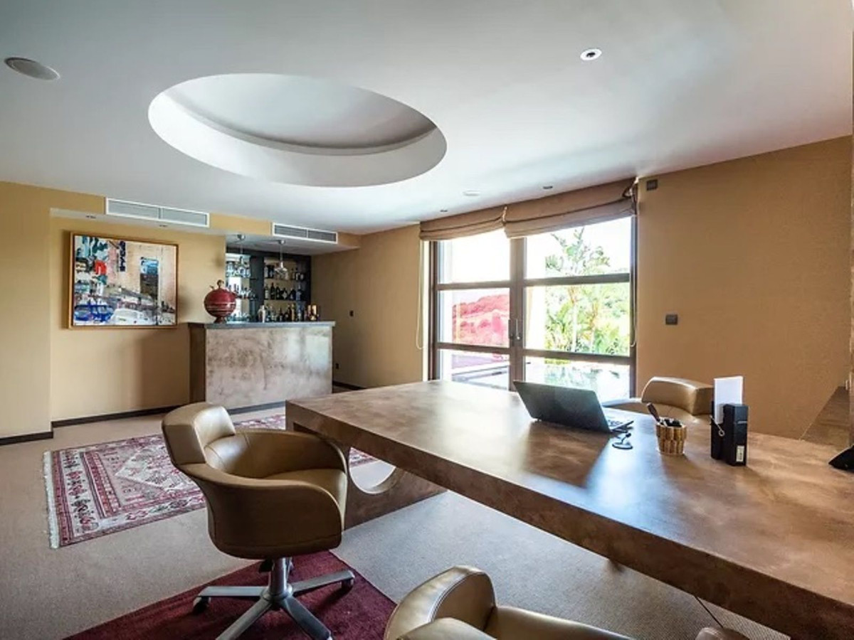 The main rooms, decorated with the nicest Georgetti furniture and kitchen all have access to the outdoor with certain areas having the Barragan-specific strong colours. Bright walls accentuate the space on the terraces near the Koi pond and the sun protected outside BBQ area, which connects to a split level garden with fountain and strong color wall surrounding, protected to wind and offering total privacy. The infinity swimming pool with stunning Siccis mosaic, IPE wooden terrace and Mexican style hut. On sunny periods the outside blends with the inside, the lights and shadows play like an artist canvas. The most dramatic style part of this mansion is the spacious outdoor living area with glass roof and electric sculpted lattice shutters which play with ever changing quality of light and shade from roof and front part separating the garden without taking away the sea view.