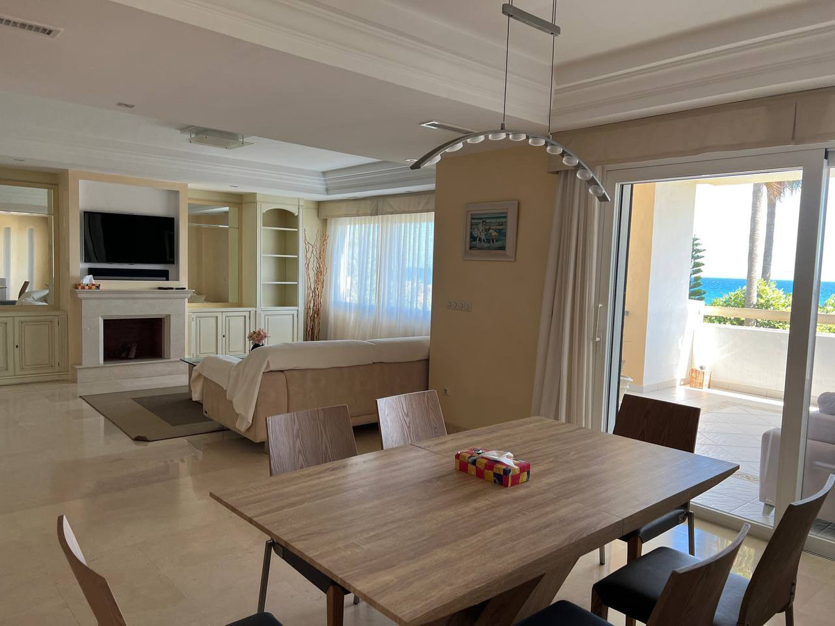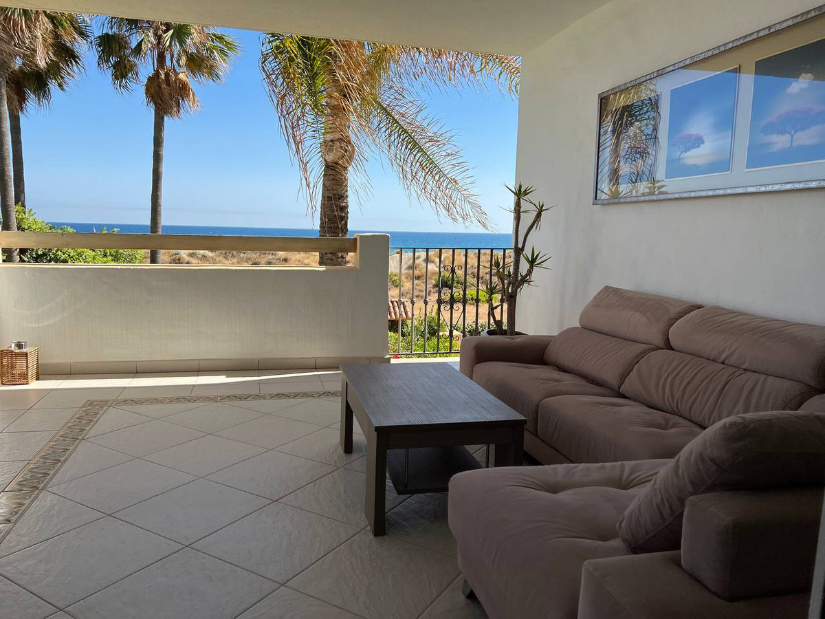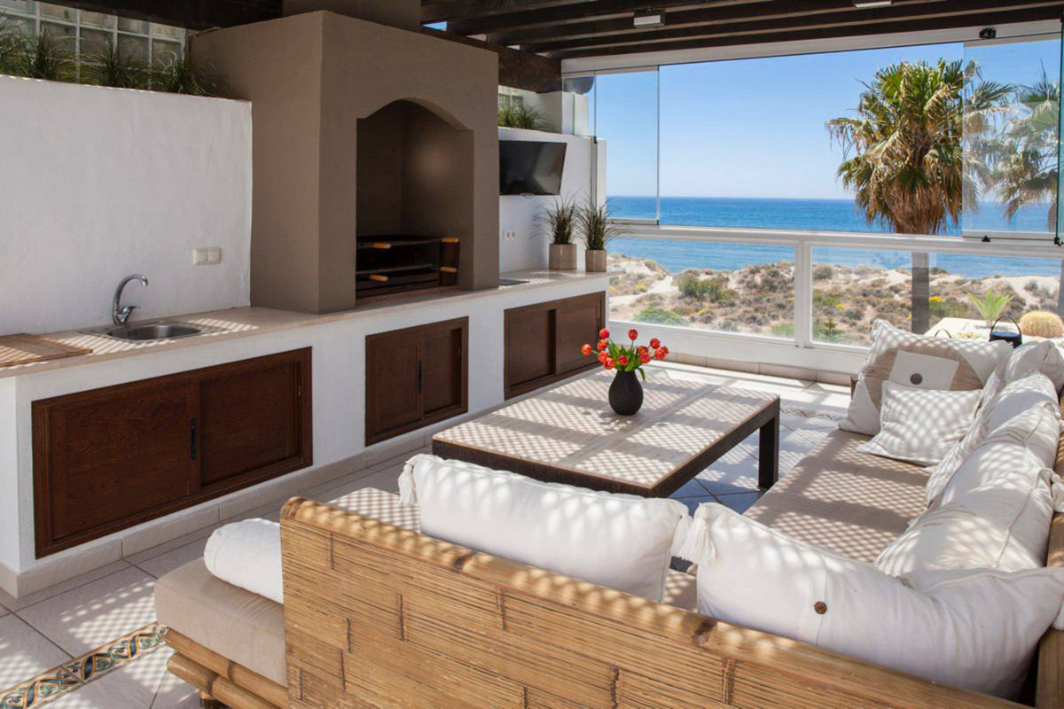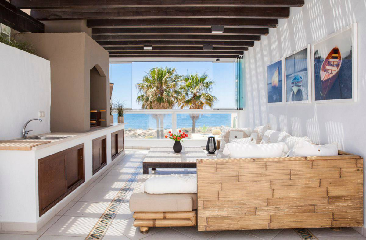 House for sale and for rent in Arenas de Bahia Marbella, Marbella with 4 bedrooms, 5 bathrooms, 4 en suite bathrooms and with orientation south, with communal swimming pool, private garage (2 parking spaces) and communal garden. Regarding property dimensions, it has 329 m² built, 350 m² plot, 229 m² interior and 100 m² terrace. Has the following facilities front line beach, amenities near, transport near, air conditioning, fully furnished, fully fitted kitchen, utility room, fireplace, marble floors, storage room, alarm, solarium, security entrance, dining room, barbeque, security service 24h, telephone, guest toilet, private terrace, kitchen equipped, living room, sea view, mountain view, laundry room, internet - wifi, covered terrace, 24h service, electric blinds, fitted wardrobes, gated community, garden view, pool view, panoramic view, beachside, doorman, underfloor heating (partial), close to sea / beach, close to golf, excellent condition, close to shops, close to town, close to schools, surveillance cameras, individual a/c units, ground floor patio, aerothermics and internet - fibre optic.