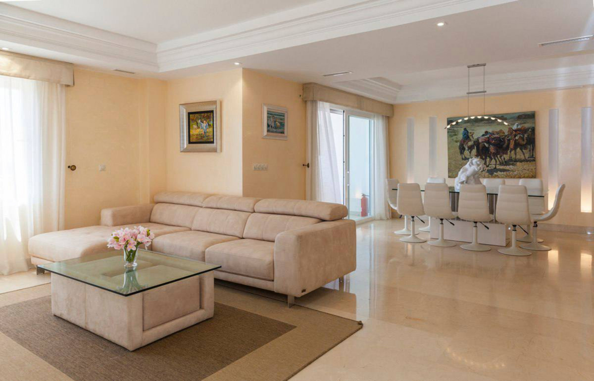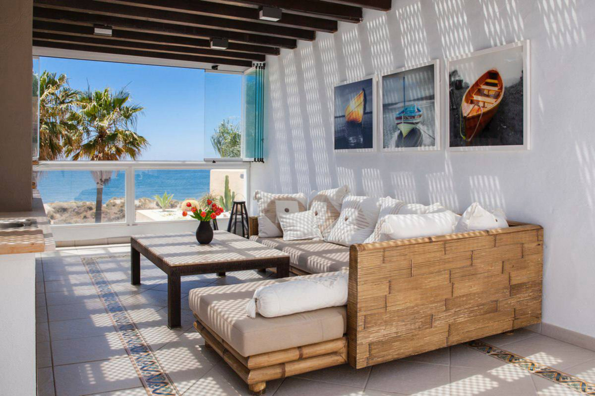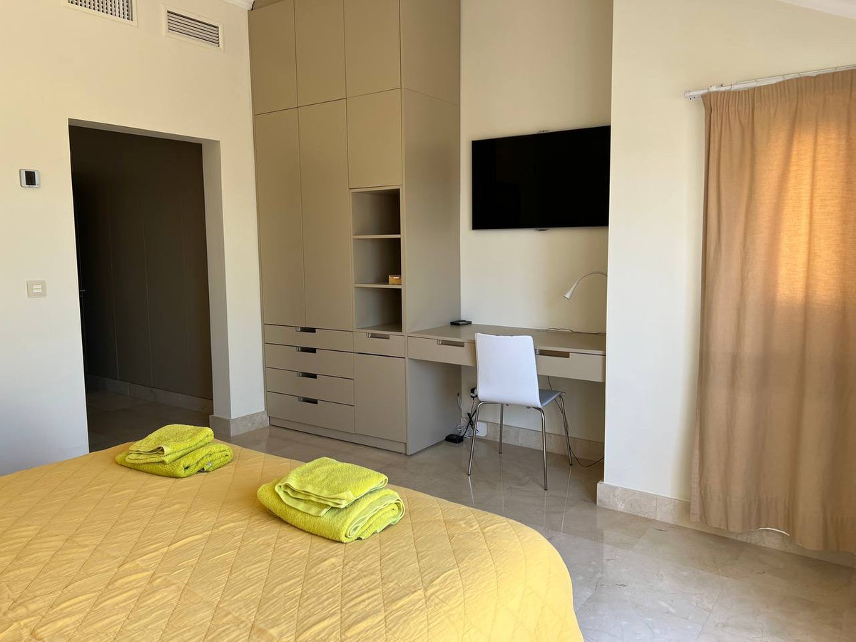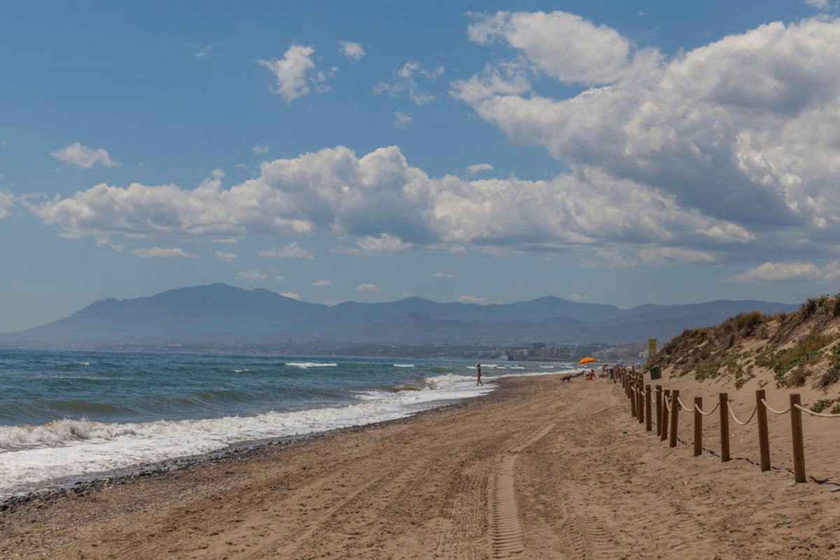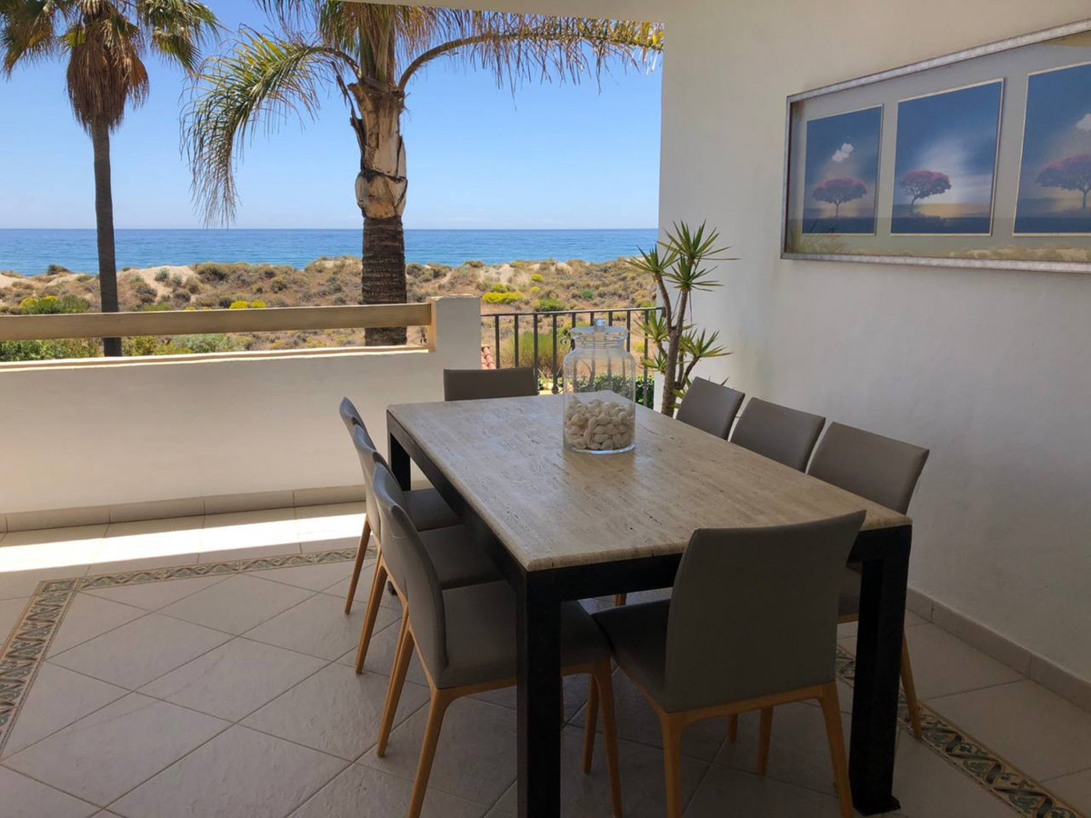 House for sale and for rent in Arenas de Bahia Marbella, Marbella with 4 bedrooms, 5 bathrooms, 4 en suite bathrooms and with orientation south, with communal swimming pool, private garage (2 parking spaces) and communal garden. Regarding property dimensions, it has 329 m² built, 350 m² plot, 229 m² interior and 100 m² terrace. Has the following facilities front line beach, amenities near, transport near, air conditioning, fully furnished, fully fitted kitchen, utility room, fireplace, marble floors, storage room, alarm, solarium, security entrance, dining room, barbeque, security service 24h, telephone, guest toilet, private terrace, kitchen equipped, living room, sea view, mountain view, laundry room, internet - wifi, covered terrace, 24h service, electric blinds, fitted wardrobes, gated community, garden view, pool view, panoramic view, beachside, doorman, underfloor heating (partial), close to sea / beach, close to golf, excellent condition, close to shops, close to town, close to schools, surveillance cameras, individual a/c units, ground floor patio, aerothermics and internet - fibre optic.