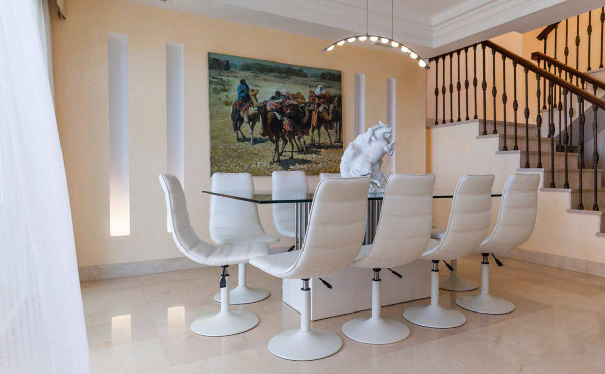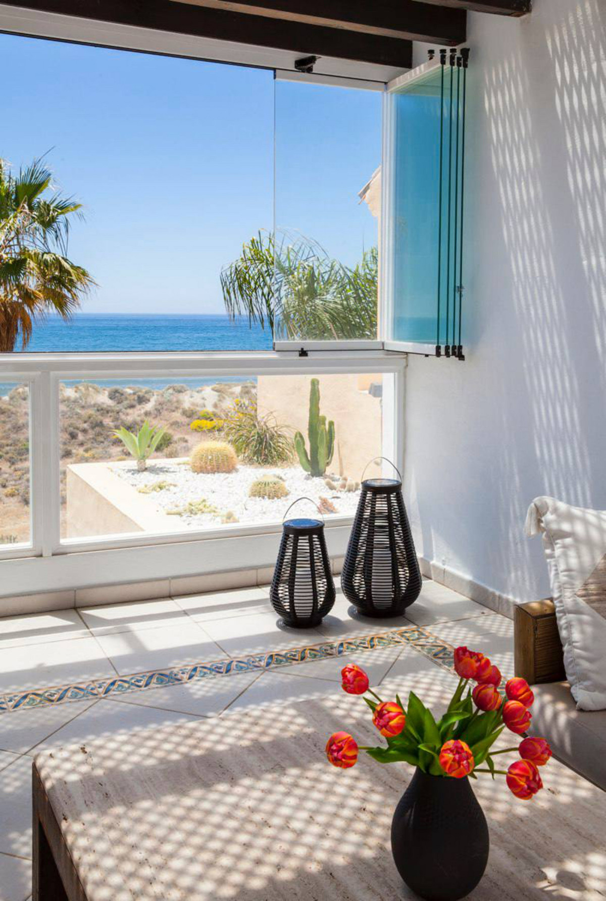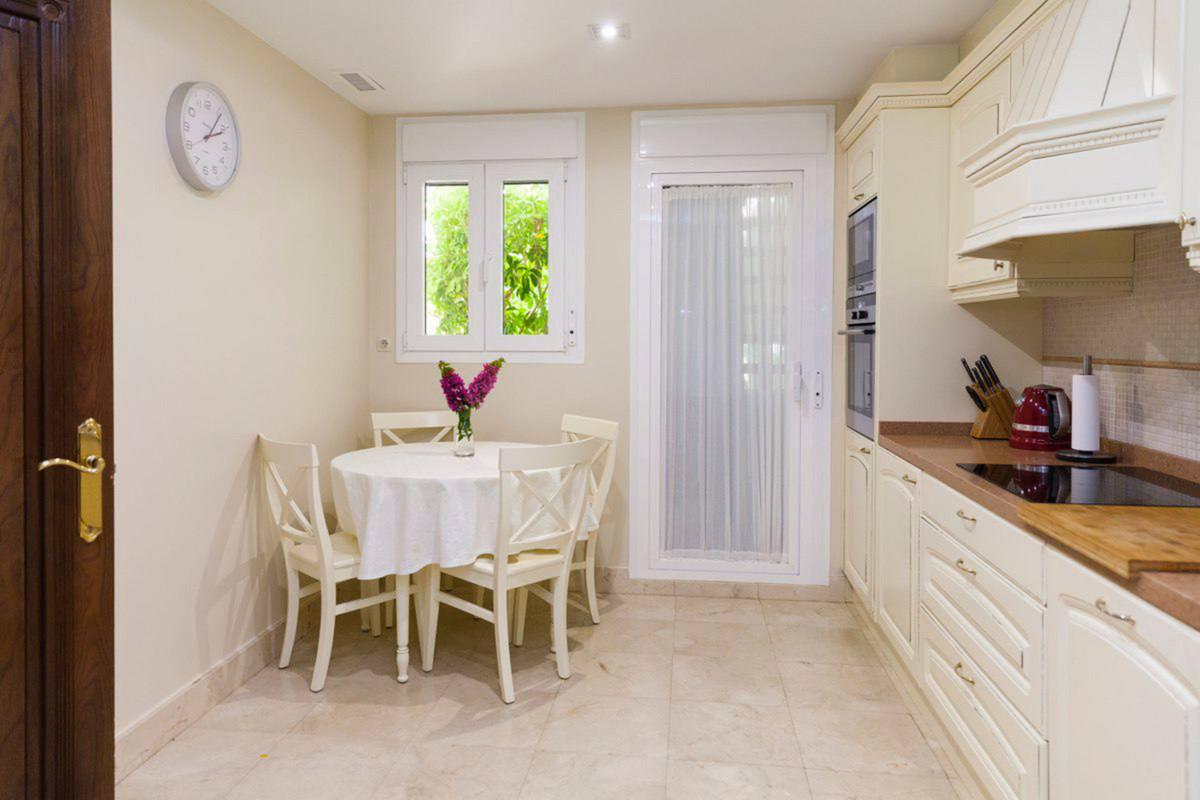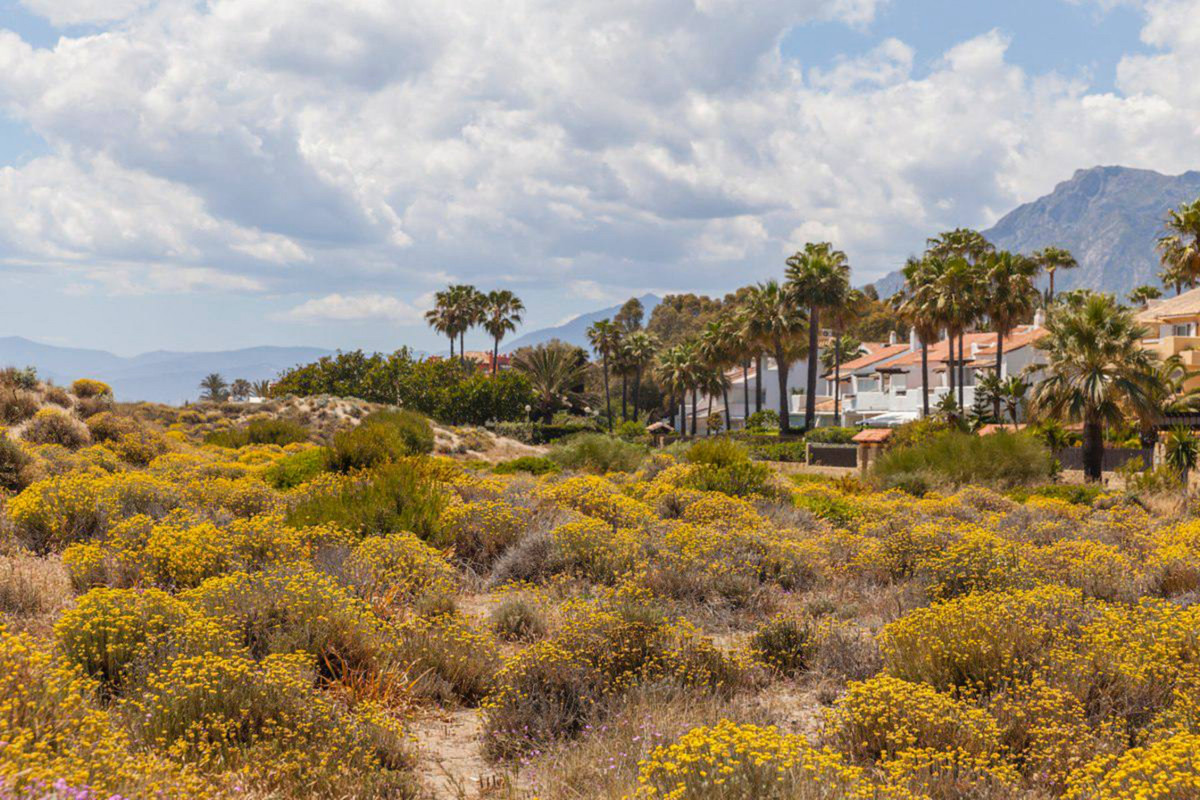 House for sale and for rent in Arenas de Bahia Marbella, Marbella with 4 bedrooms, 5 bathrooms, 4 en suite bathrooms and with orientation south, with communal swimming pool, private garage (2 parking spaces) and communal garden. Regarding property dimensions, it has 329 m² built, 350 m² plot, 229 m² interior and 100 m² terrace. Has the following facilities front line beach, amenities near, transport near, air conditioning, fully furnished, fully fitted kitchen, utility room, fireplace, marble floors, storage room, alarm, solarium, security entrance, dining room, barbeque, security service 24h, telephone, guest toilet, private terrace, kitchen equipped, living room, sea view, mountain view, laundry room, internet - wifi, covered terrace, 24h service, electric blinds, fitted wardrobes, gated community, garden view, pool view, panoramic view, beachside, doorman, underfloor heating (partial), close to sea / beach, close to golf, excellent condition, close to shops, close to town, close to schools, surveillance cameras, individual a/c units, ground floor patio, aerothermics and internet - fibre optic.