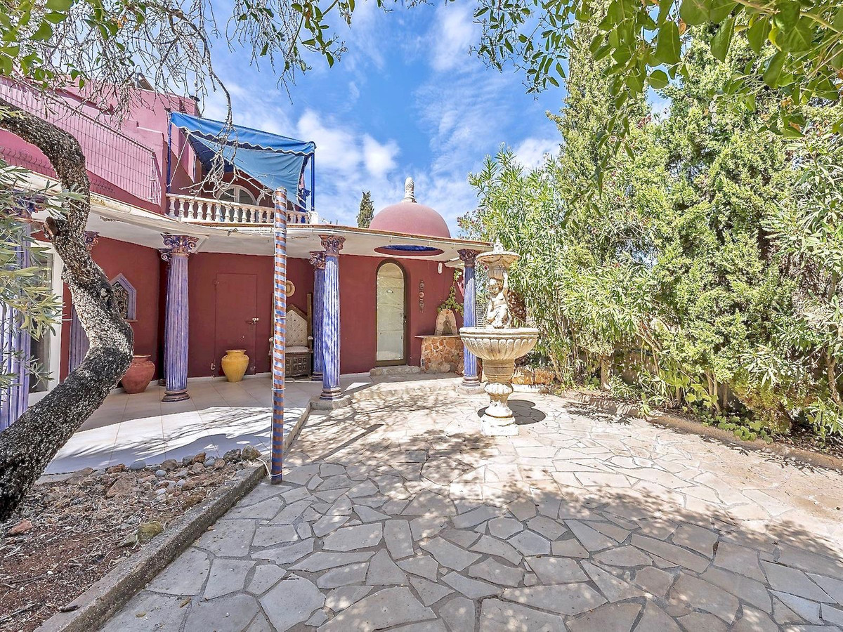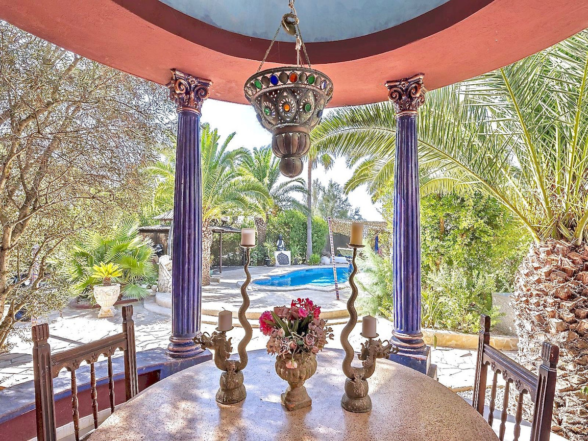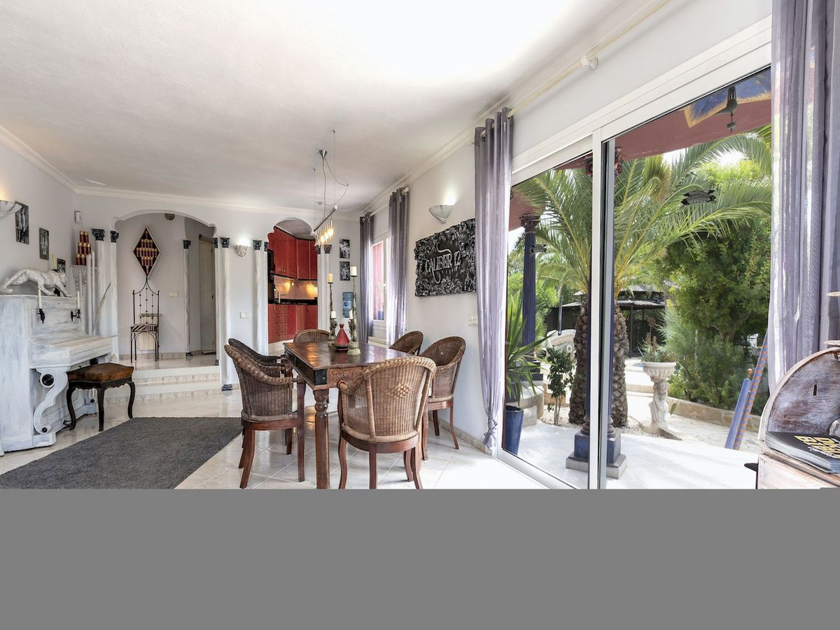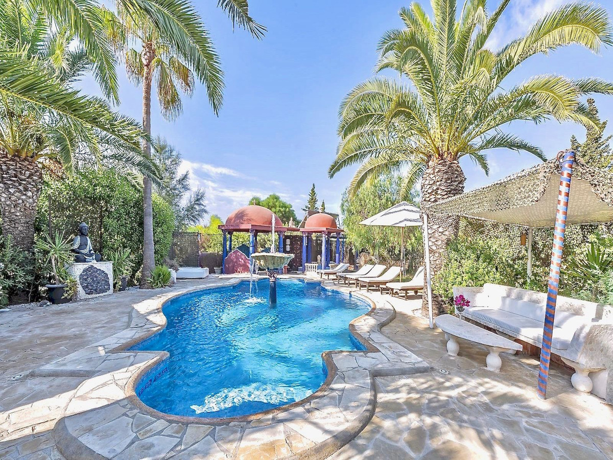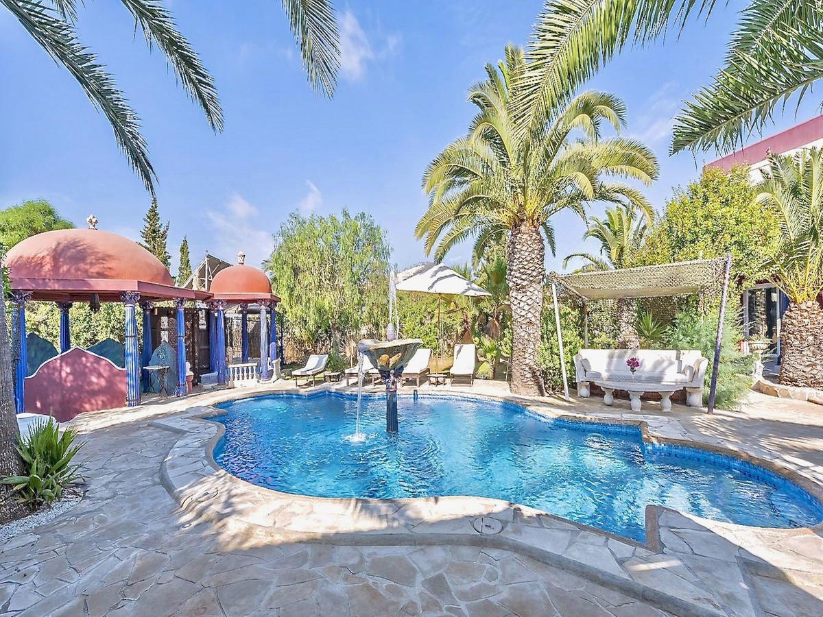 MG Villas Luxury Property - Offers you this Exclusive Villa located in Ibiza just 5 km from the capital and very close to the best beaches of the Island, such as Las Salinas, Playa d 'en Bossa, Cala Yondal, Cala D'Hort etc. . If you are looking for a unique, spectacular and exclusive property located in the middle of the wonderful countryside of Ibiza, this will be your best choice. Large Mediterranean garden of 2,030 m2 with  palm trees, subtropical plants, shrubs and fruit trees such as almond and olive trees. Idyllic spaces with flowers and plants, a pond with fish and aquatic flowers, everything is created to relax . The beautiful chill out areas in the middle of a green oasis invite you to enjoy your well-deserved break time. And don't forget the large Arabian-style pool with its spectacular shell-shaped fountain. The fantastic barbecue area with its covered gazebo offers enough space for your family and friends. Main entrance that impresses with a large dome. The 337 m2 are distributed over 2 floors and on the ground floor we find the spacious living-dining room, a double bedroom with an en-suite bathroom, the other two double bedrooms share another bathroom, the kitchen with access to a covered terrace with an Arabic dome, to eat. The internal staircase leads to the first floor where there are two more bedrooms, each with its own bathroom en suite and a private terrace with views of the sea, the famous salt flats of Ibiza and the beautiful garden. Attached to the house there is an office and a machine room, both with their own entrance. Large garage of 55 m2 for 2 cars, motorcycles and with storage room.