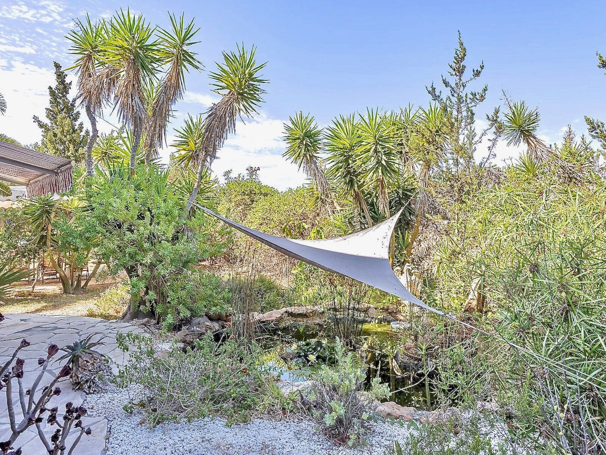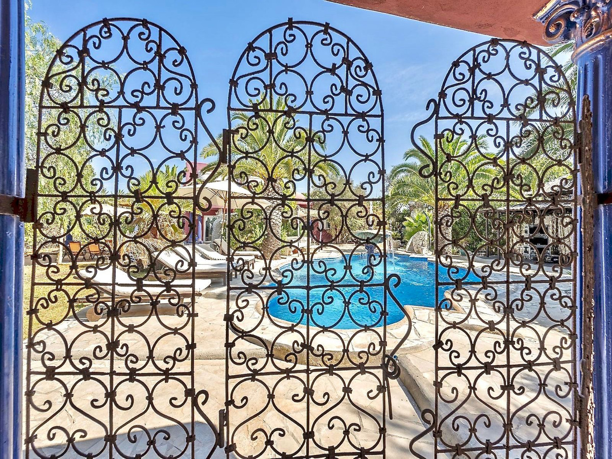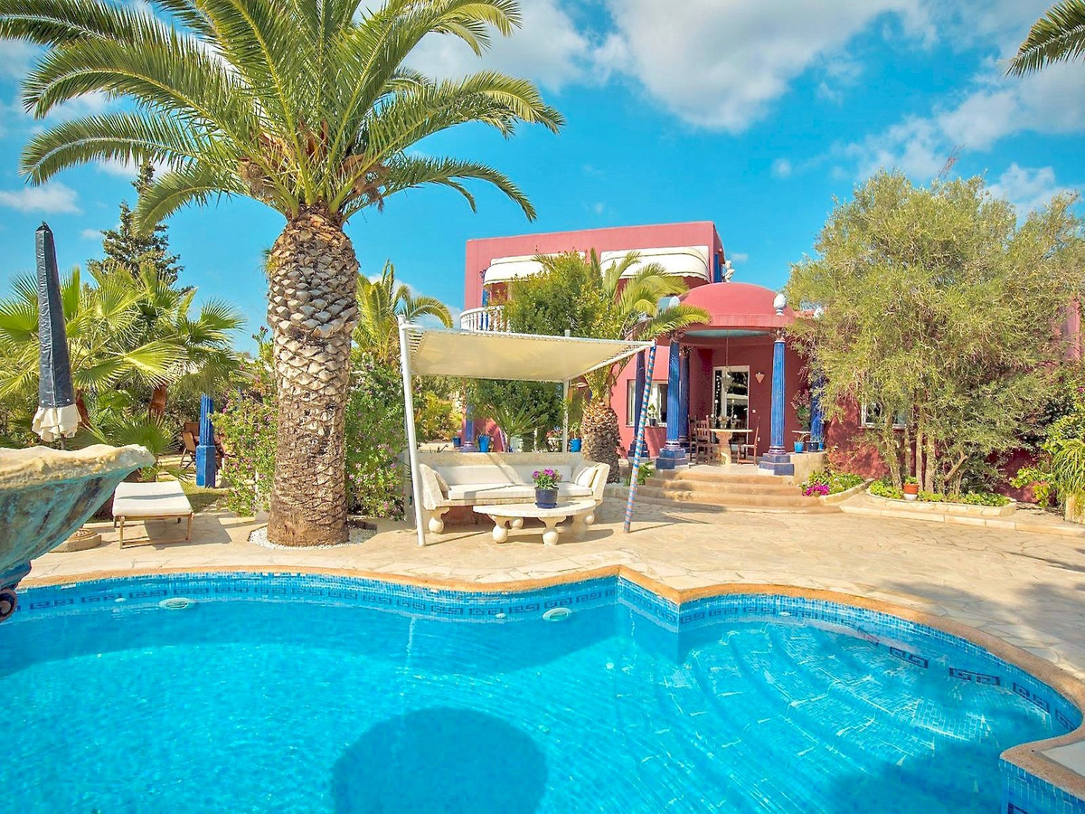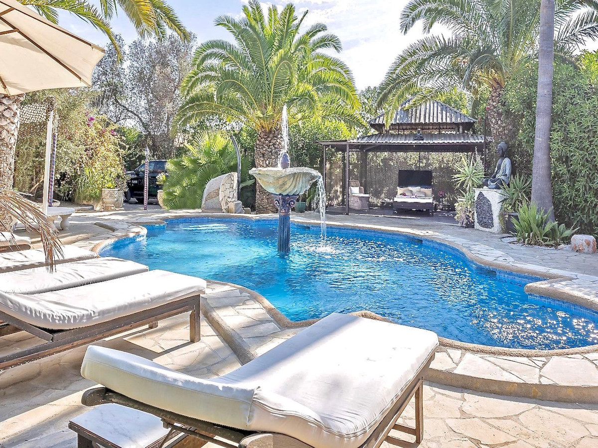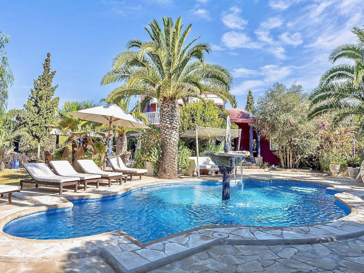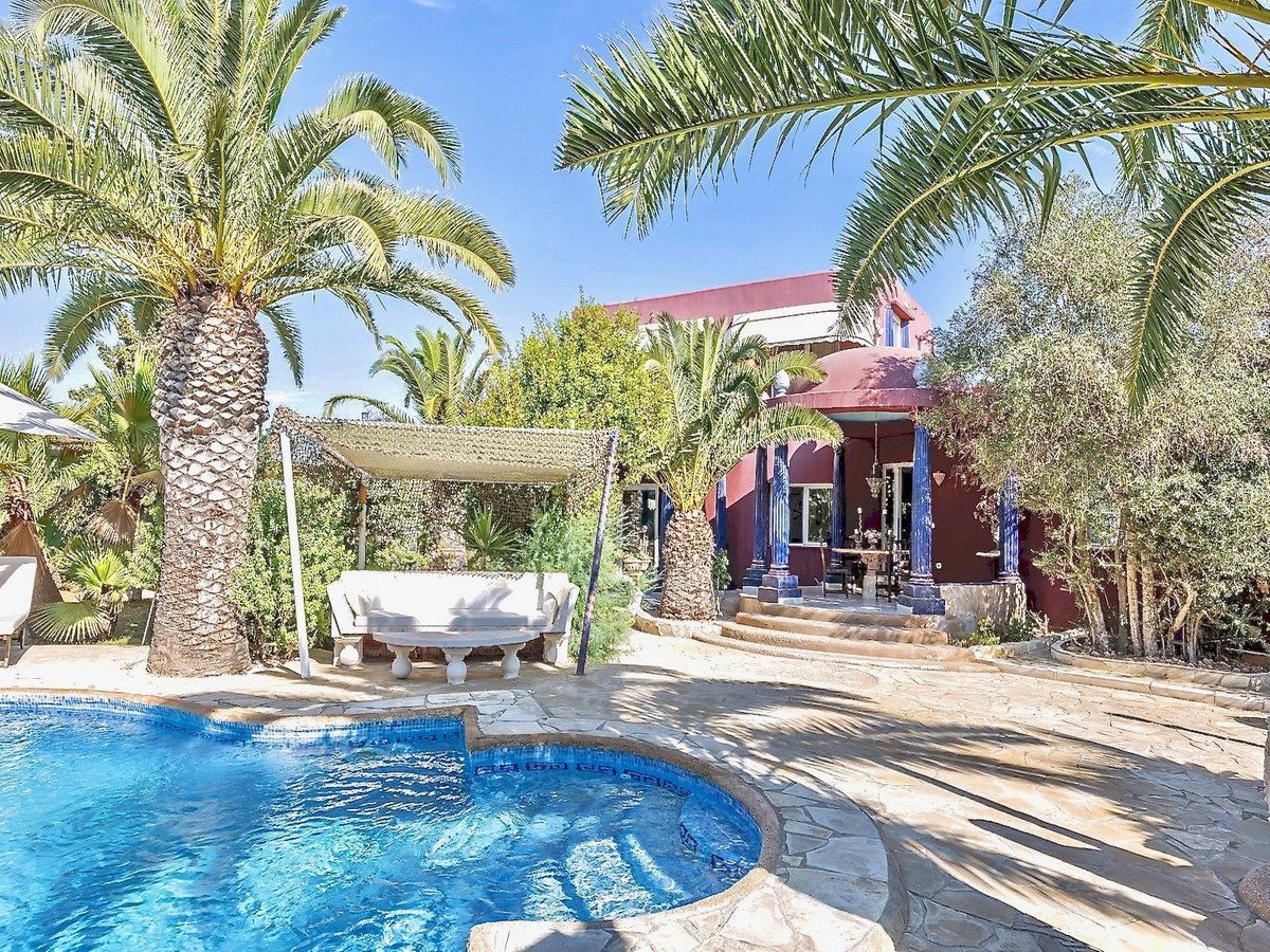 MG Villas Luxury Property - Offers you this Exclusive Villa located in Ibiza just 5 km from the capital and very close to the best beaches of the Island, such as Las Salinas, Playa d 'en Bossa, Cala Yondal, Cala D'Hort etc. . If you are looking for a unique, spectacular and exclusive property located in the middle of the wonderful countryside of Ibiza, this will be your best choice. Large Mediterranean garden of 2,030 m2 with  palm trees, subtropical plants, shrubs and fruit trees such as almond and olive trees. Idyllic spaces with flowers and plants, a pond with fish and aquatic flowers, everything is created to relax . The beautiful chill out areas in the middle of a green oasis invite you to enjoy your well-deserved break time. And don't forget the large Arabian-style pool with its spectacular shell-shaped fountain. The fantastic barbecue area with its covered gazebo offers enough space for your family and friends. Main entrance that impresses with a large dome. The 337 m2 are distributed over 2 floors and on the ground floor we find the spacious living-dining room, a double bedroom with an en-suite bathroom, the other two double bedrooms share another bathroom, the kitchen with access to a covered terrace with an Arabic dome, to eat. The internal staircase leads to the first floor where there are two more bedrooms, each with its own bathroom en suite and a private terrace with views of the sea, the famous salt flats of Ibiza and the beautiful garden. Attached to the house there is an office and a machine room, both with their own entrance. Large garage of 55 m2 for 2 cars, motorcycles and with storage room.