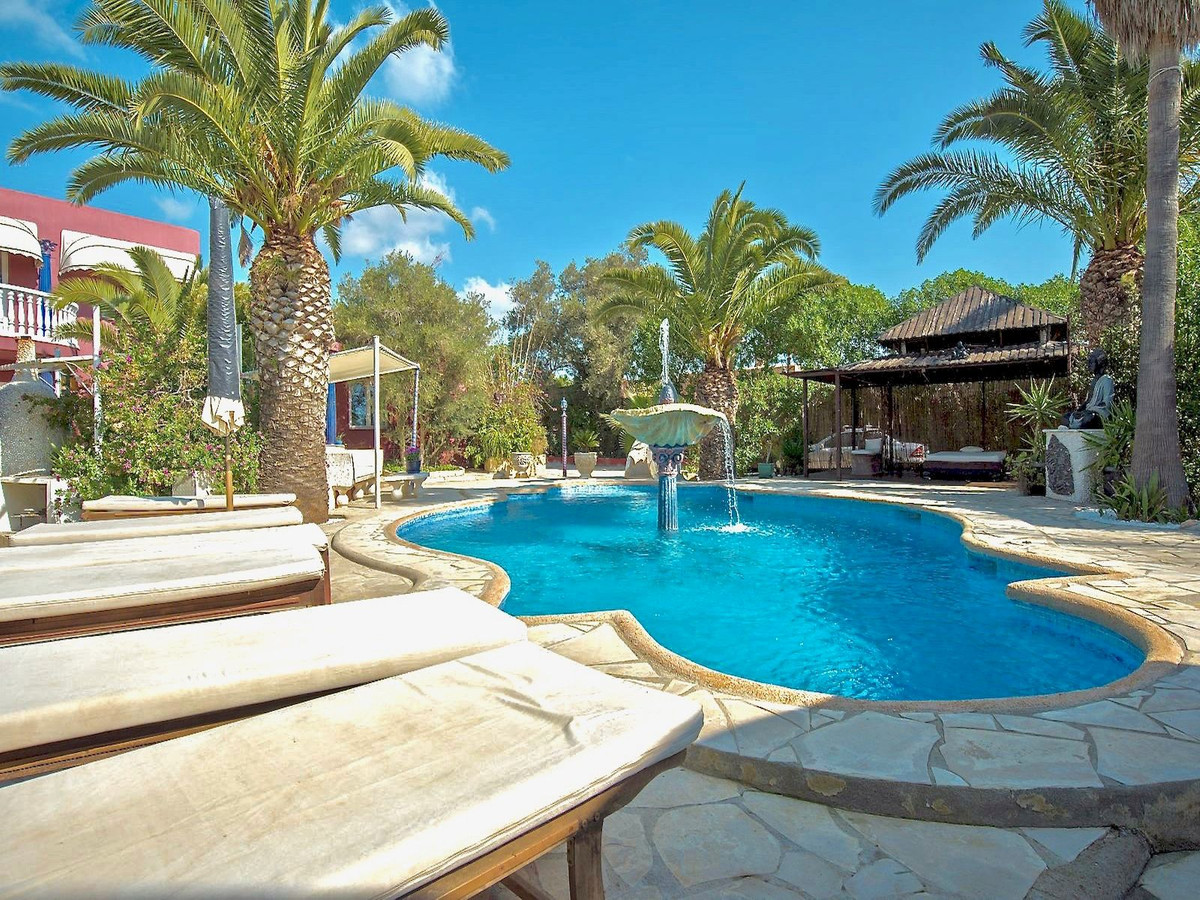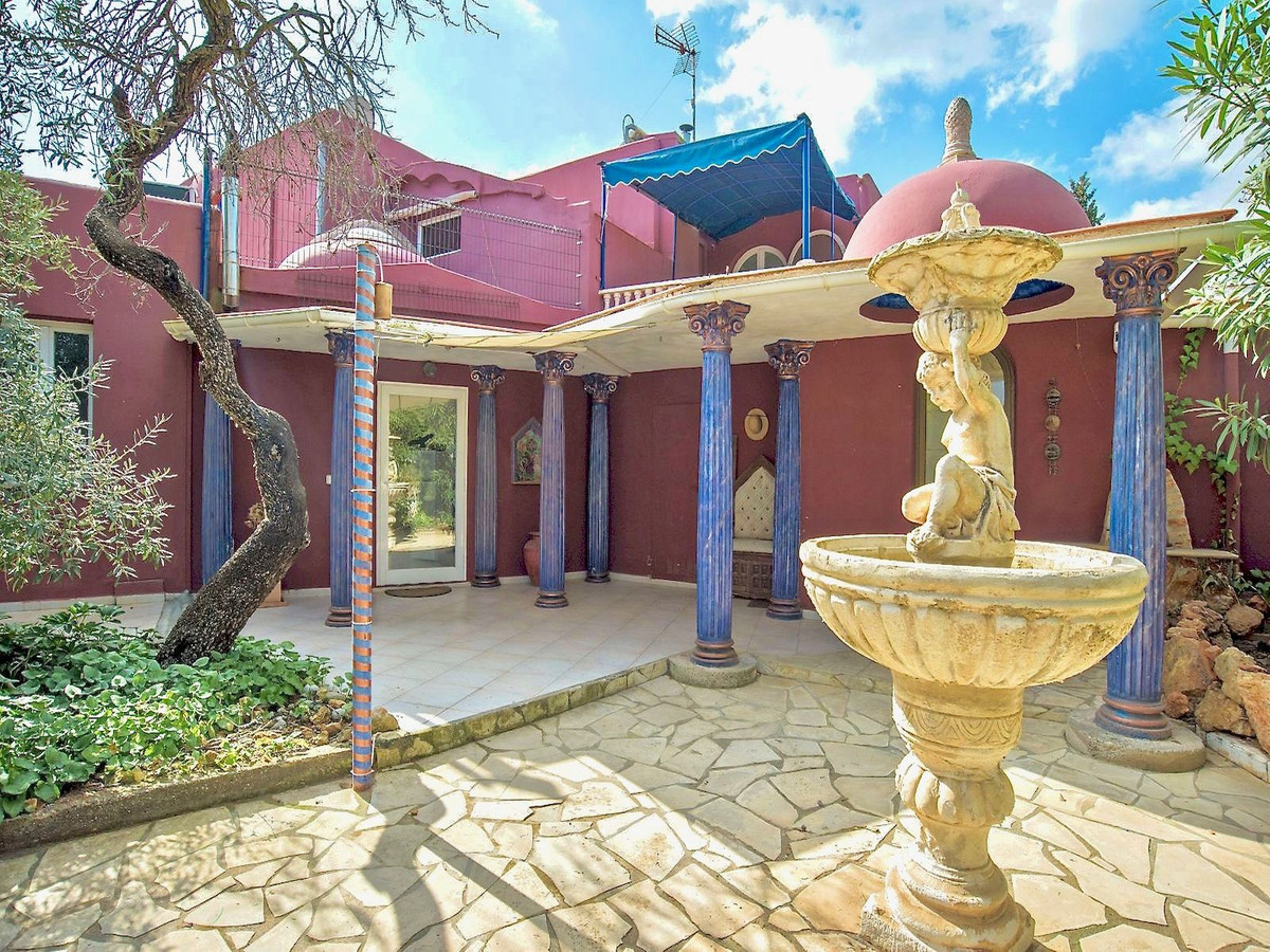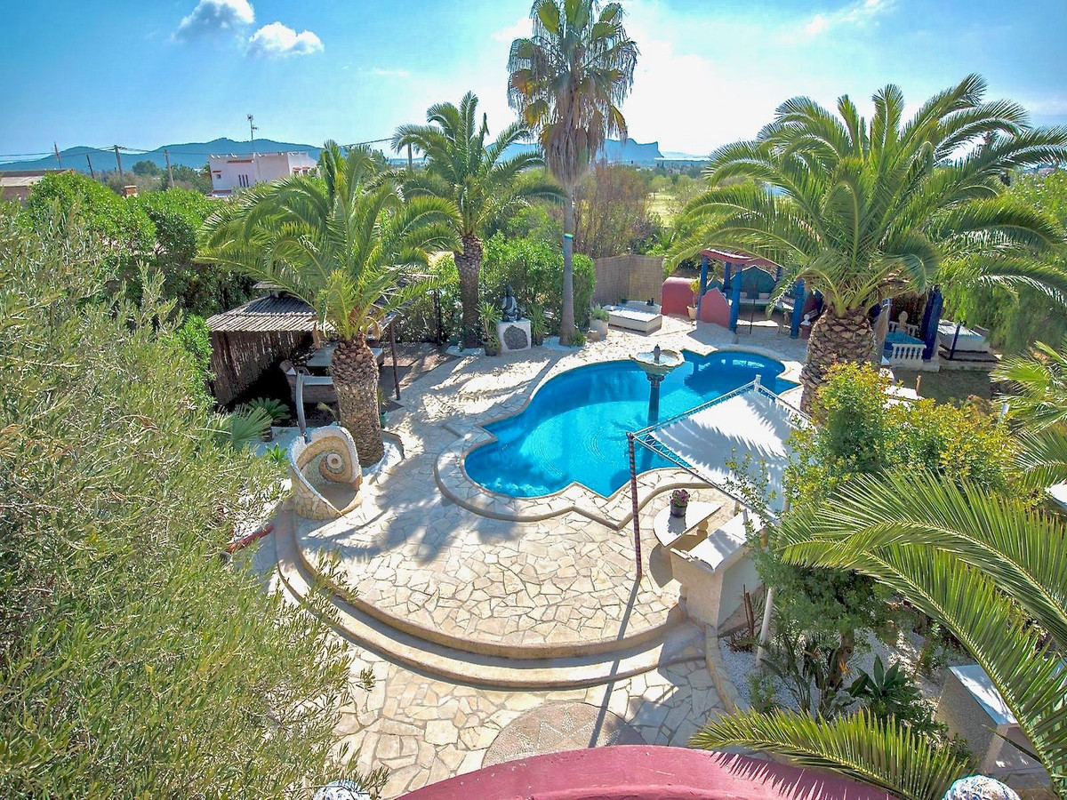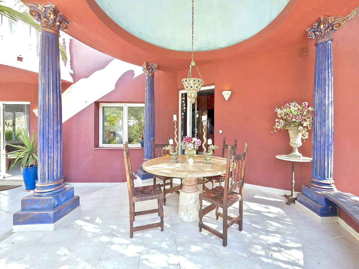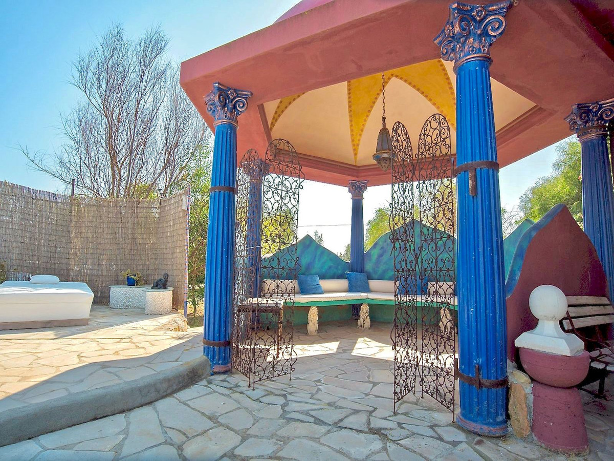 MG Villas Luxury Property - Offers you this Exclusive Villa located in Ibiza just 5 km from the capital and very close to the best beaches of the Island, such as Las Salinas, Playa d 'en Bossa, Cala Yondal, Cala D'Hort etc. . If you are looking for a unique, spectacular and exclusive property located in the middle of the wonderful countryside of Ibiza, this will be your best choice. Large Mediterranean garden of 2,030 m2 with  palm trees, subtropical plants, shrubs and fruit trees such as almond and olive trees. Idyllic spaces with flowers and plants, a pond with fish and aquatic flowers, everything is created to relax . The beautiful chill out areas in the middle of a green oasis invite you to enjoy your well-deserved break time. And don't forget the large Arabian-style pool with its spectacular shell-shaped fountain. The fantastic barbecue area with its covered gazebo offers enough space for your family and friends. Main entrance that impresses with a large dome. The 337 m2 are distributed over 2 floors and on the ground floor we find the spacious living-dining room, a double bedroom with an en-suite bathroom, the other two double bedrooms share another bathroom, the kitchen with access to a covered terrace with an Arabic dome, to eat. The internal staircase leads to the first floor where there are two more bedrooms, each with its own bathroom en suite and a private terrace with views of the sea, the famous salt flats of Ibiza and the beautiful garden. Attached to the house there is an office and a machine room, both with their own entrance. Large garage of 55 m2 for 2 cars, motorcycles and with storage room.