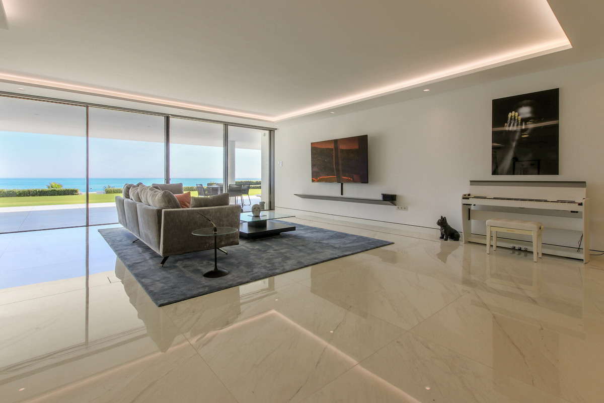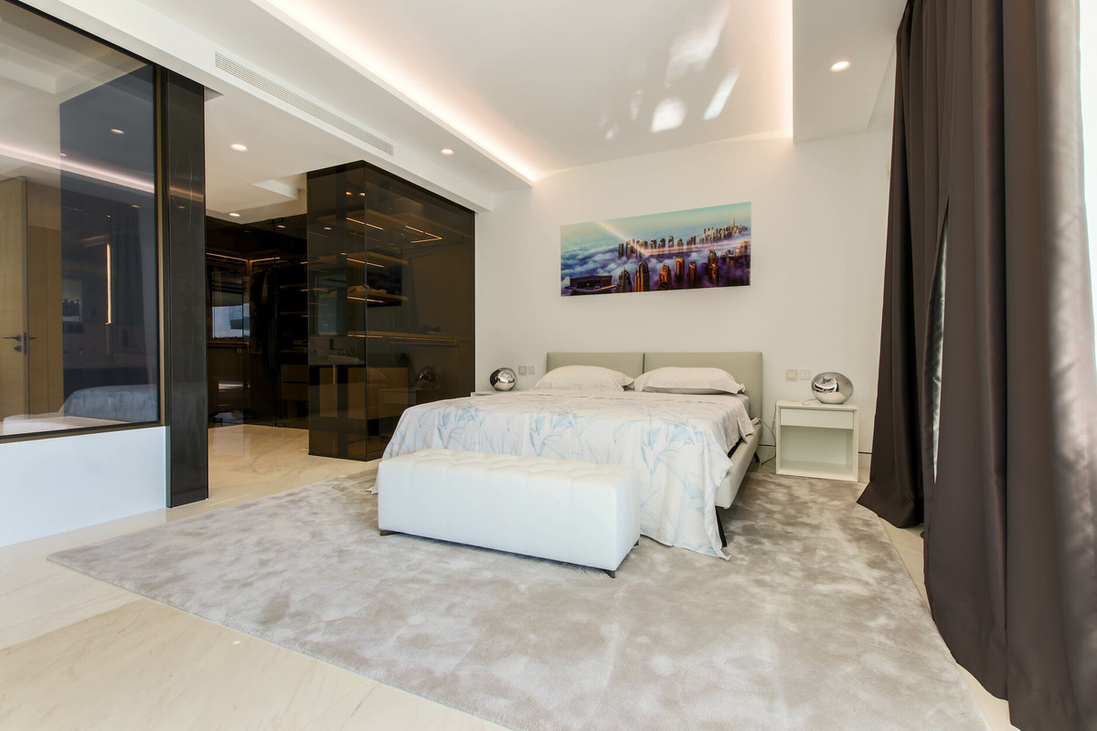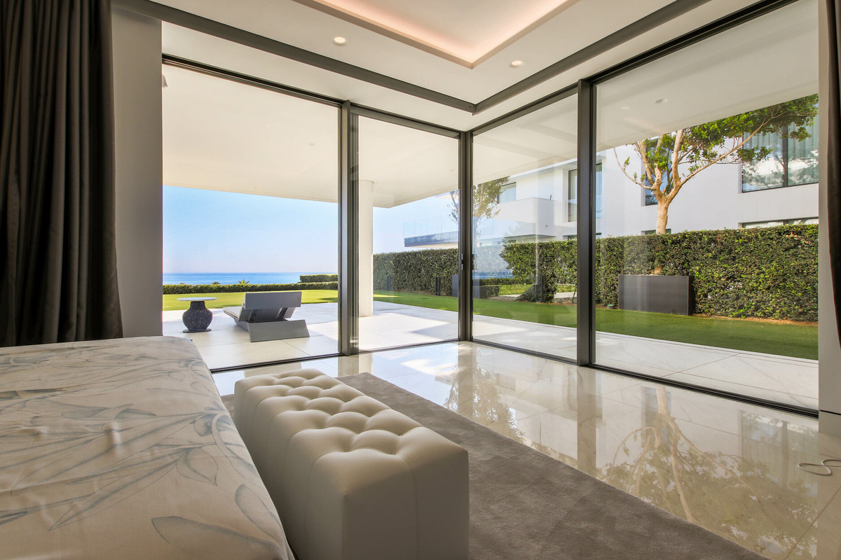 Ground Floor Duplex for sale in Emare, Estepona with 4 bedrooms and 4 bathrooms, with communal swimming pool, private garage (4 parking spaces) and private garden. Regarding property dimensions, it has 526 m² built, 415 m² plot, 306 m² interior and 146 m² terrace. Has the following facilities garden view, panoramic view, pool view, sea view, amenities near, beachside, close to children playground, close to port, close to sea / beach, front line beach, air conditioning, ceiling heating system, brand new, excellent condition, 24h service, bars, basement, electric blinds, fitted wardrobes, glass doors, guest toilet, heated pool, home automation system, internet – wifi, private terrace, turkish bath, kitchenette, fully fitted kitchen, fully furnished, cinema room, dining room, game room, laundry room, living room, storage room, armored door, doorman, double glazing, gated community, security entrance, security service 24h, security shutters, surveillance cameras and video entrance.