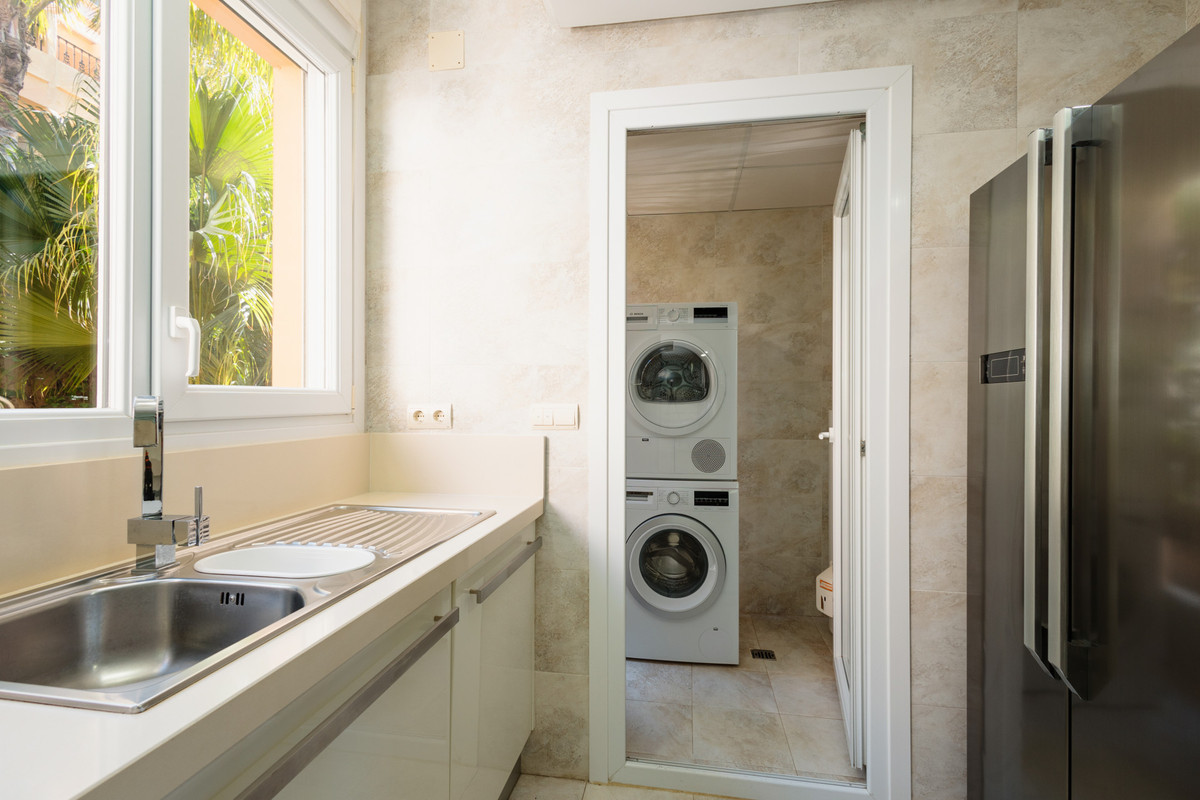 The kitchen is fully equipped with microwave, two-door refrigerator, oven, dishwasher, kettle and toaster. Adjacent to the kitchen is the laundry room with a washing machine and a large space for the iron.