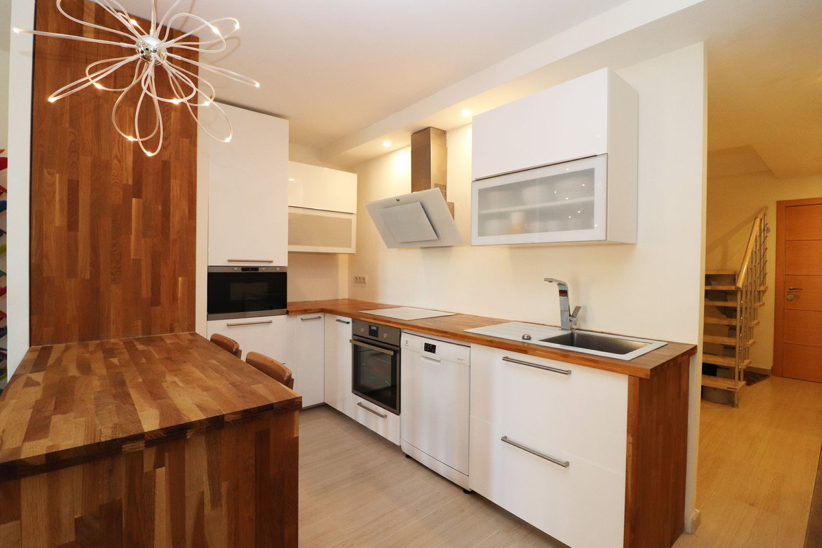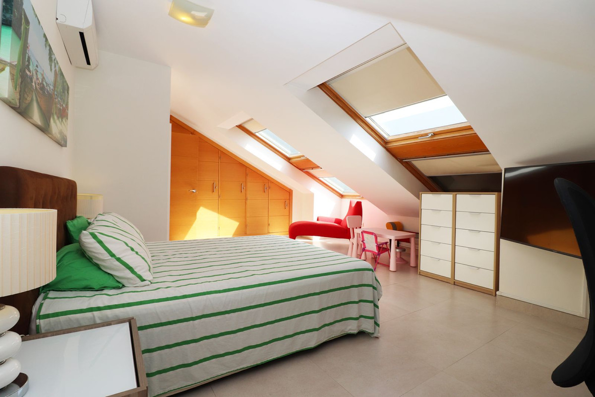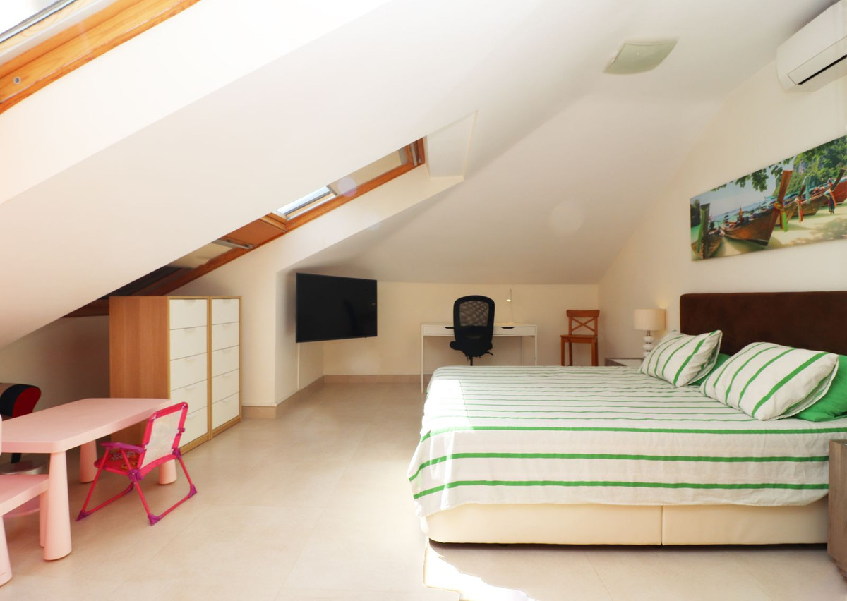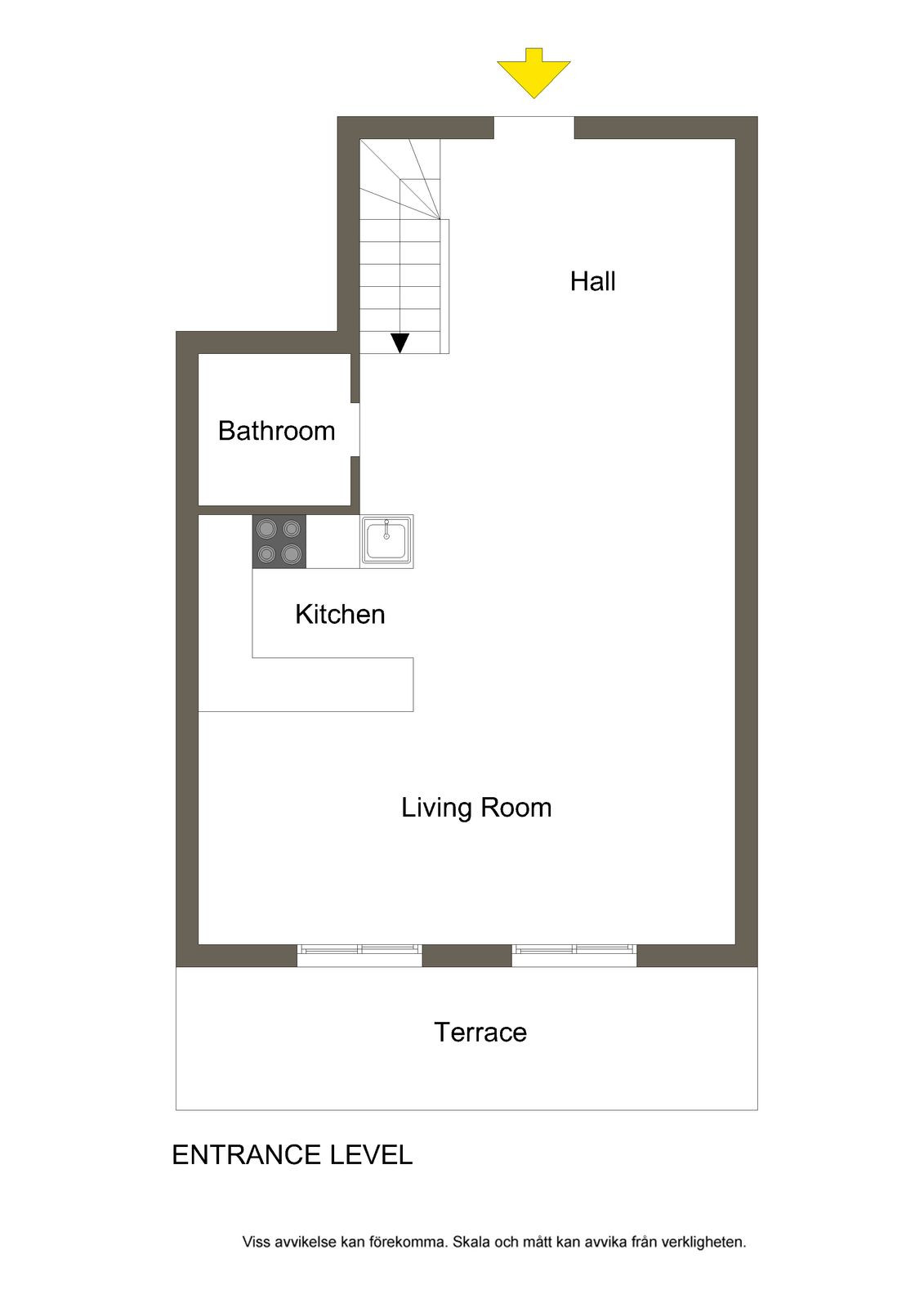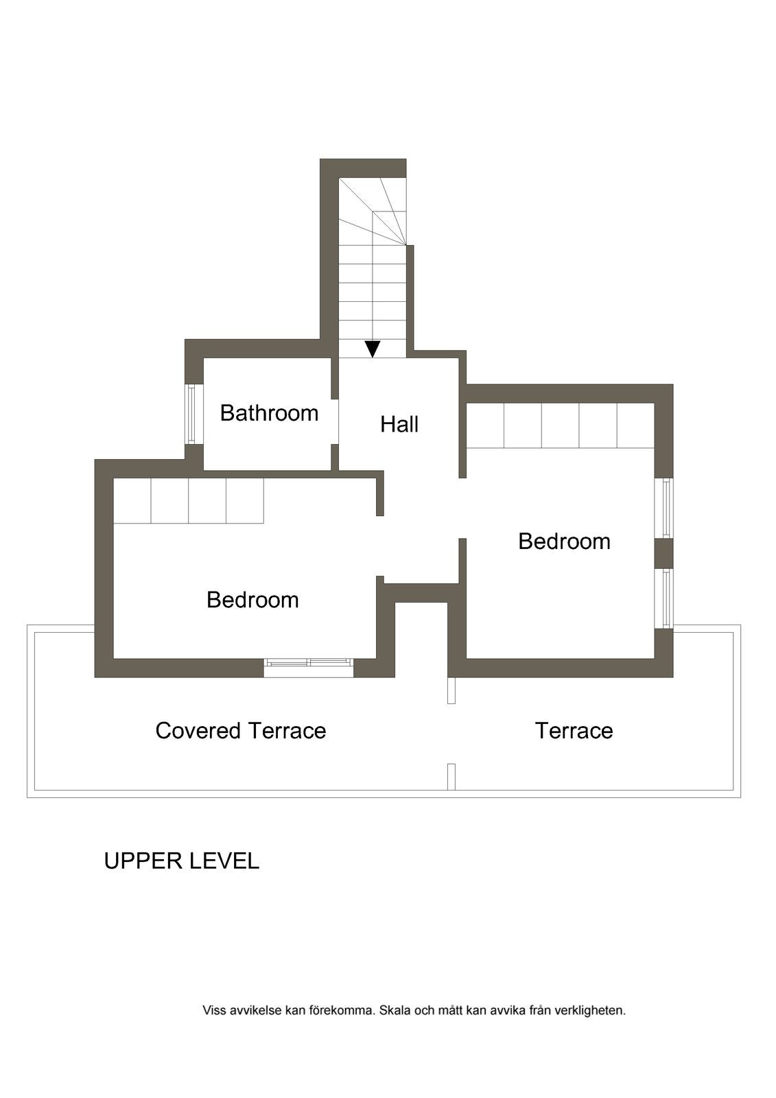 Bostaden är på två plan där entréplan har en inbjudande hall med badrum, ett kök som har praktiskt förvaring med öppen planlösning mot vardagsrummet. Från vardagsrummet når man terrassen med sol hela dagen. På övre plan finner du ytterligare ett badrum med dusch, de två sovrummen där den ena har snedtak med stora takfönster och inbyggda garderober. Det andra sovrummet leder ut mot ytterligare en terrass som är delvis inglasad och har utrymme för stora utemöbler samt lounge area.