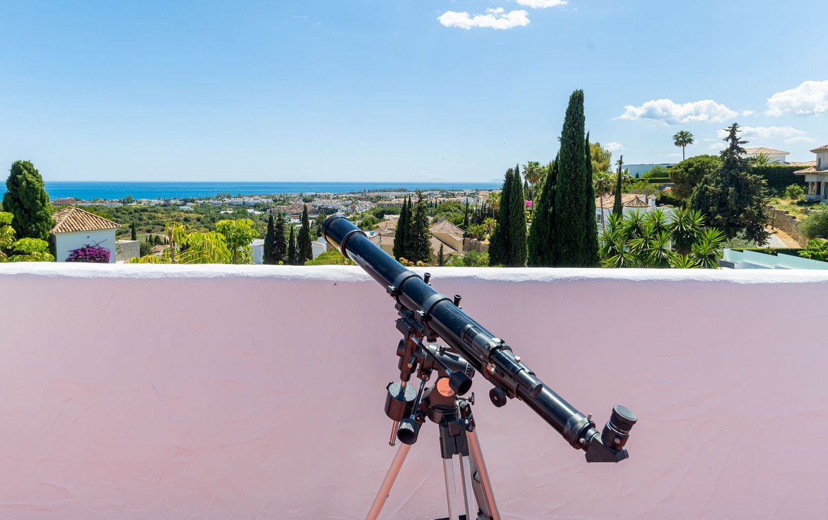 Imponerande söderläge traditionellt andalusiskt designat hus med magnifik utsikt över Medelhavet från alla nivåer med Gibraltar och Afrikas norra kust hisnande synlig dag eller natt.