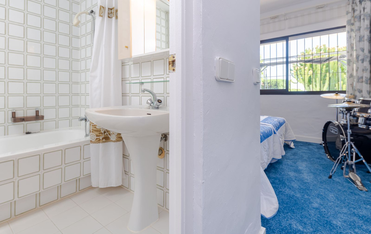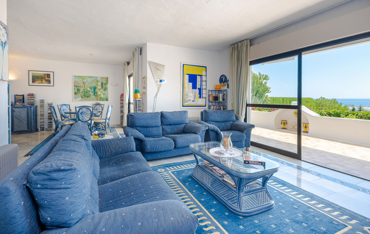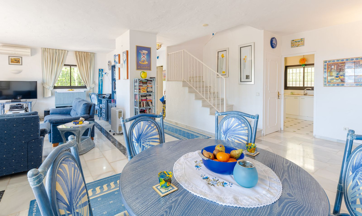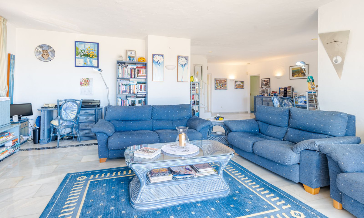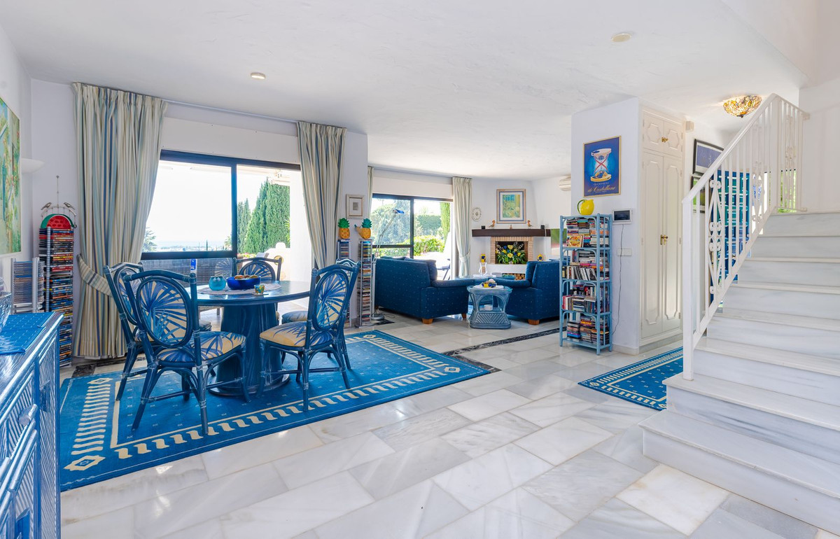 När man går in i huset kompromissar första våningen med ett exceptionellt välutrustat vardagsrum och matsal med öppen planlösning kompletterat med en traditionell andalusisk förhöjd öppen spis på framsidan av fönster med dubbla aspekter från vägg till vägg som erbjuder oändlig utsikt över havet och trädgården med tillgång till en långbågig mat- och relaxterrass dekorerad med färgglad bougainvillea.