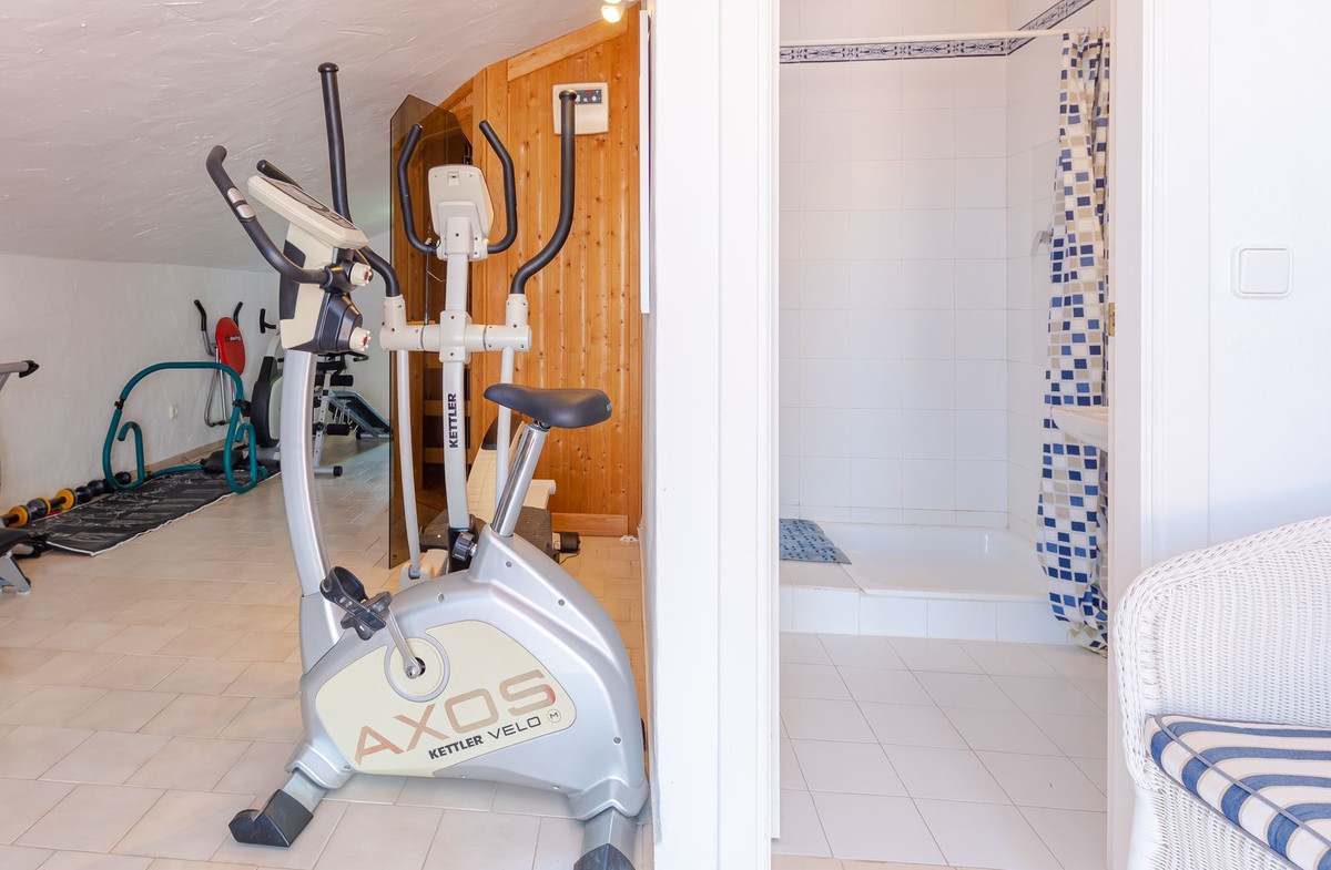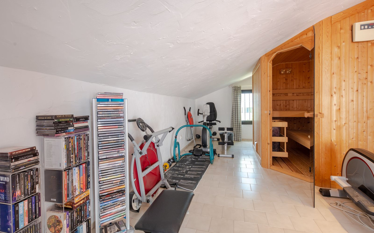 Ytterligare ett dubbelrum i loftstil omvandlat till ett gym med ett lyxigt specialbyggt basturum erbjuder ett bekvämt duschrum och privat tillgång till terrassen.