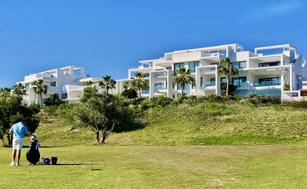 Den eleganta mastersviten har en rymlig inbyggd garderob och ett lyxigt badrum designat av Porcelanosa med ett avkopplande massagebadkar. Det ljusa vardagsrummet imponerar med höga tak och stora skjutdörrar från golv till tak som leder till den generösa 28 m² stora terrassen i söderläge, perfekt för att umgås eller koppla av med lugn utsikt över golfbanan och trädgården. Denna 102 m² stora lägenhet är byggd med förstklassig värme- och ljudisolering och garanterar ultimat komfort året runt.