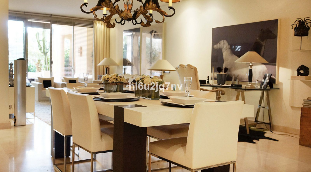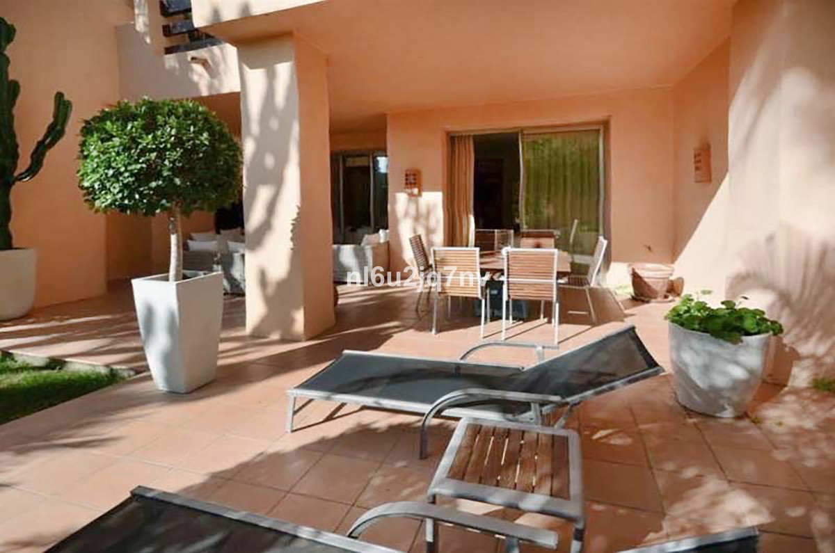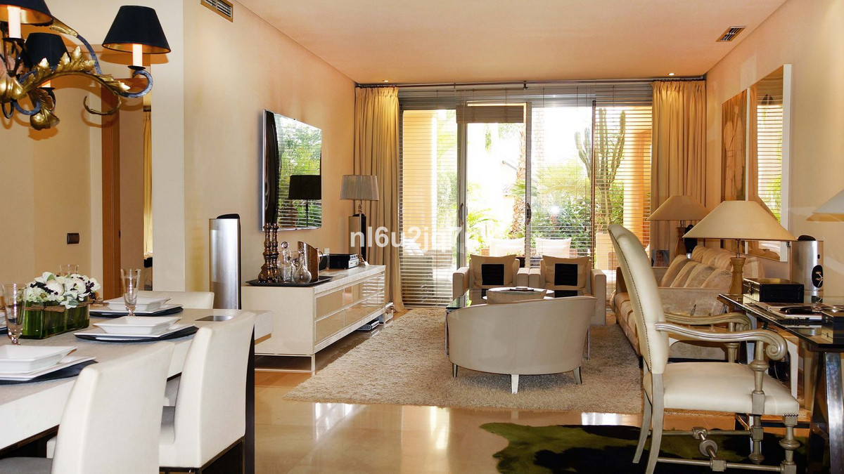 A stunning, south-facing, three-bedroom corner, and very private ground-floor apartment in the renowned Mansion Club, an exclusive gated community nestling in the foothills of Sierra Blanca. This development designed by leading architect, Melvin Villarroel is set in landscaped tropical gardens with walkways; lakes, pergolas, mosaics, and other exquisite features which give this development a marked Andalucian flavour. The accommodation comprises of an entrance lobby; spacious lounge and dining room with French windows leading out to a covered terrace; open plan fitted kitchen; utility room; two guest bedrooms sharing a bathroom; master bedroom with en-suite Jacuzzi bathroom. High-quality finishes and design, with underfloor heating throughout, hot and cold A/C and a video entry system. The complex is just a 20 minute walk to the Copper Tower on the Golden Mile and Marbella town.