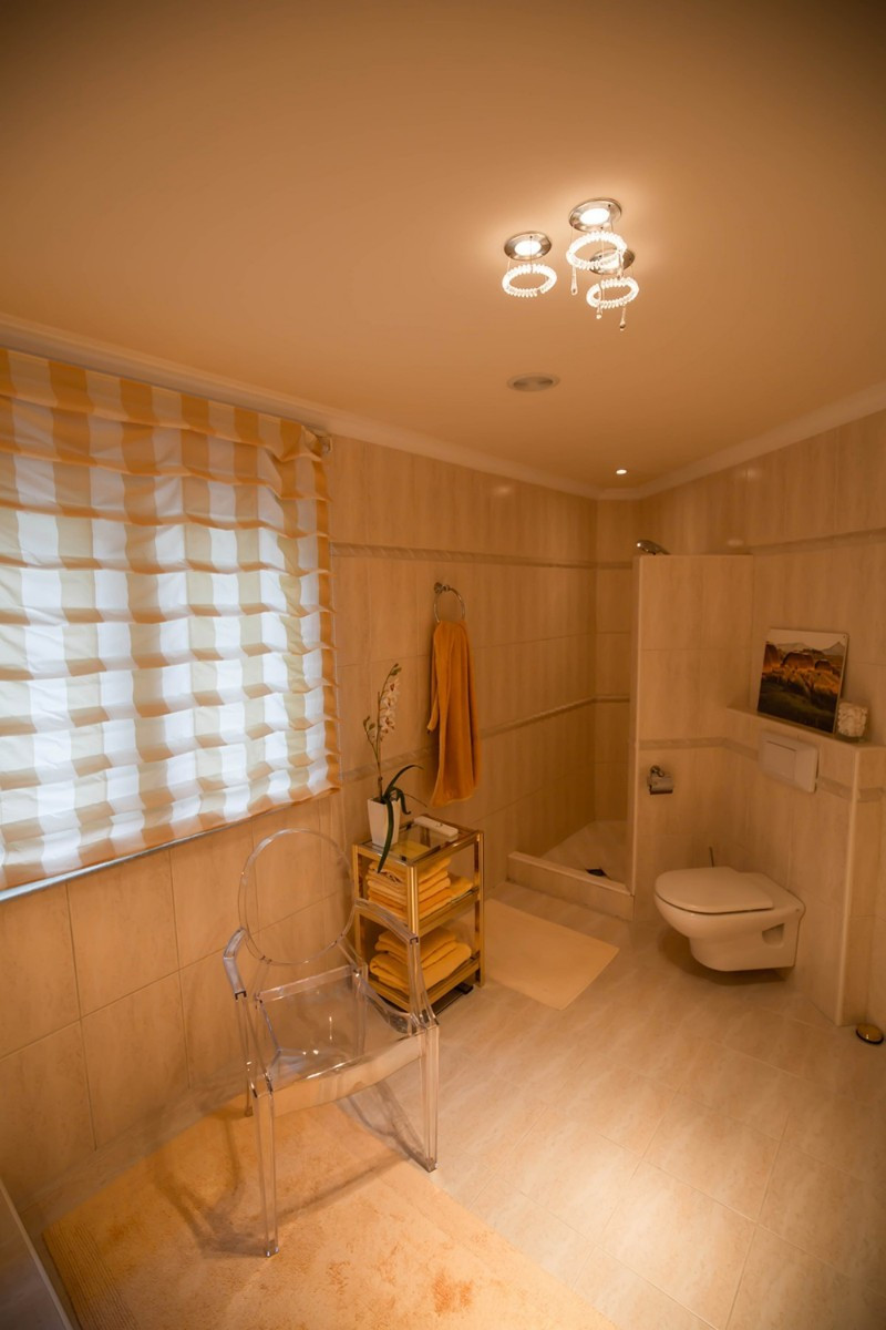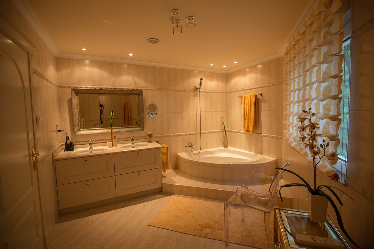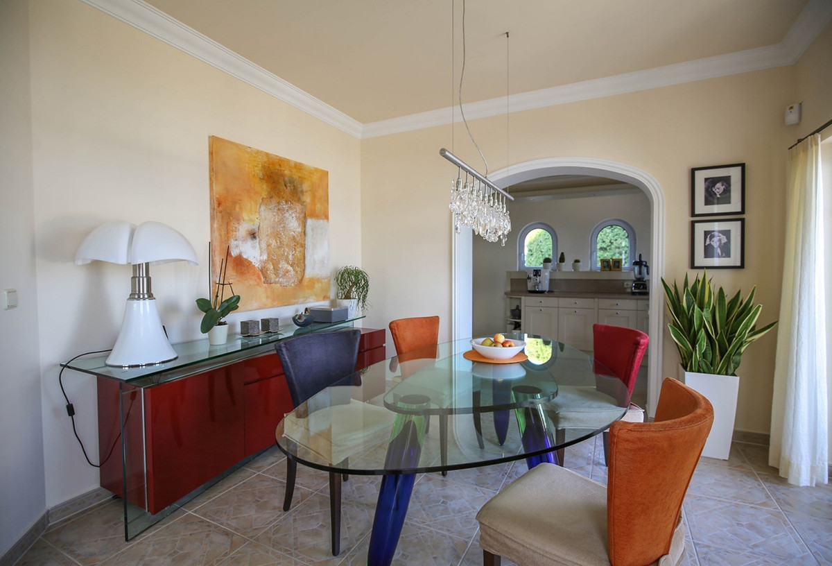 The villa also features a dining room and fully equipped kitchen, perfect for entertaining and gourmet cooking. Additionally, there is a utility room, a master bedroom with an en-suite bathroom, two further double bedrooms sharing a bathroom and a guest bathroom. Internal stairs lead to the double garage with automatic door and a large storage room, allowing easy access and additional storage.\n