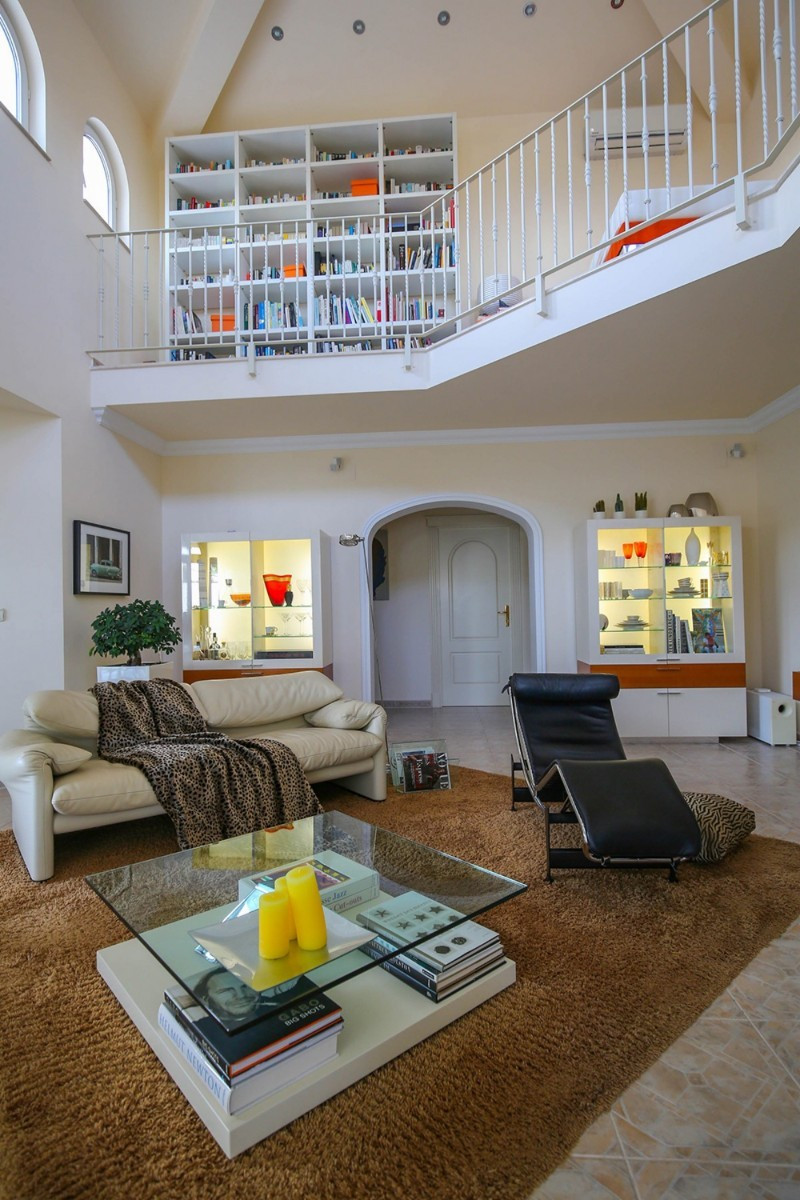 The main floor has an entrance hall that gives access to a bright living room with a double-height ceiling, which gives an air of elegance and spaciousness to the room. The staircase leads to the mezzanine, where you can enjoy the panoramic views from a different perspective.\n