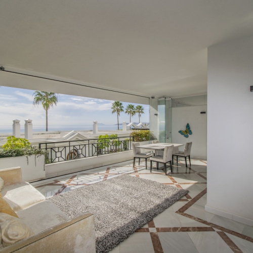 Amazing beachfront and fully furnished ground floor apartment offering a very spacious accommodation and located in the development Andalucia Beach on the New Golden Mile. Two apartments have been joined together to create this superb 4 bedroom family apartment. This fully renovated apartment features a new kitchen, bathrooms, electrics, plumbing and flooring with underfloor heating. Fabric wallpaper, feature walls and attractive lighting make the apartment both cosy and luxurious. The property consists of a large entrance hall, an ample lounge / dining room, an open plan fully fitted kitchen, 2 guest bedrooms with en-suite.