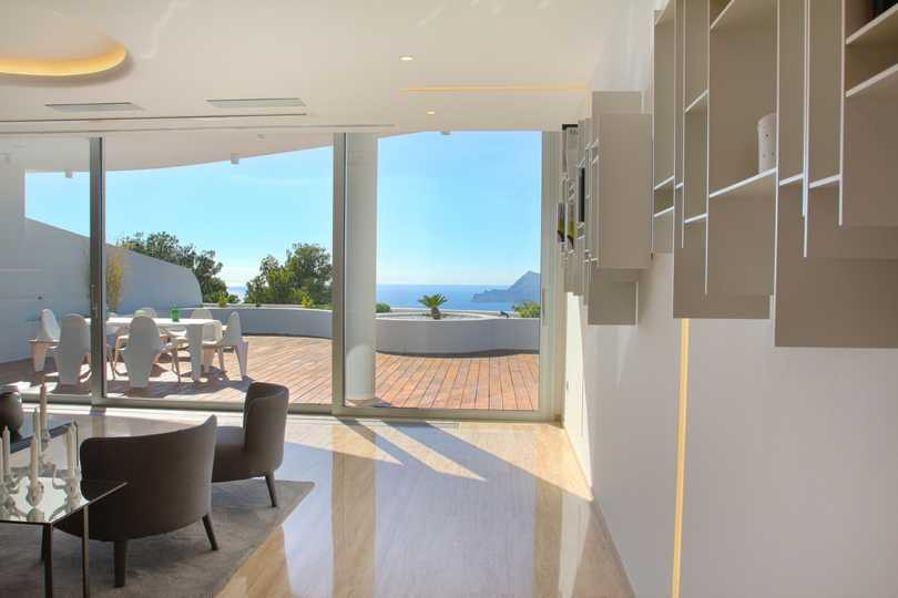Högklassigt kök och underhållning: Köket, med Miele-apparater och en spektakulär central ö, återspeglar klassen i hela hemmet. Vardagsrummet/matsalen på över 63 m² kan förvandlas till ett biorum och har utgång till en 53 m² stor terrass med jacuzzi och havsutsikt.