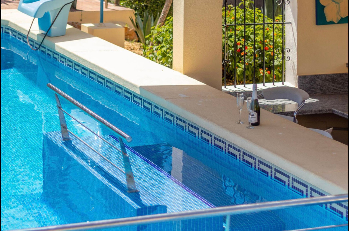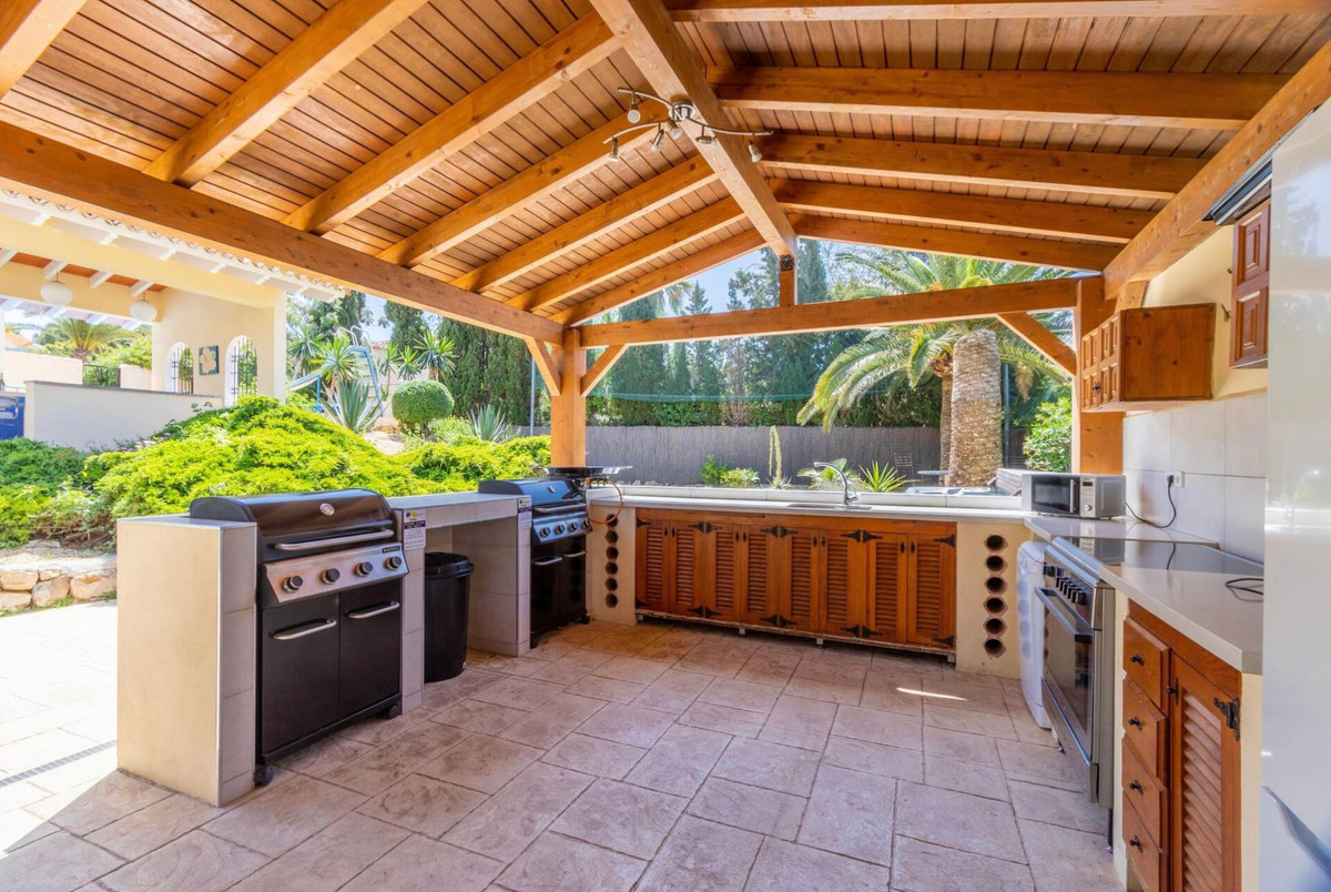 There is a total of 10 bedrooms and 7 bathrooms in the villa, as well as an additional toilet. A games room, large fully equipped summer kitchen with oven, hob, two gas BBQ and large seating area, Jacuzzi, covered pool bar and children's playground complete the property.