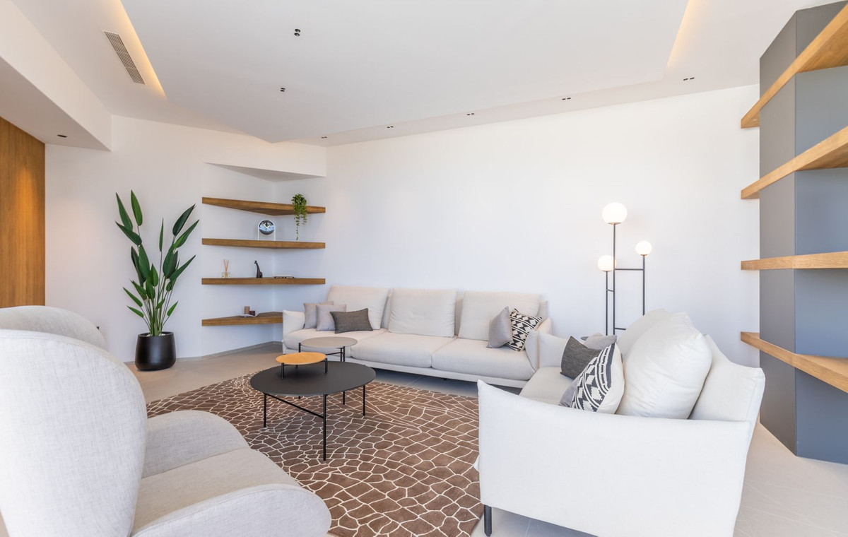 Villa Zen Infinity features a spacious living room with a breathtaking panoramic view of the Mediterranean Sea. The large 3m tall glass windows with solar protection allow natural light and the sea breeze to flood the rooms, creating a relaxing and welcoming atmosphere.