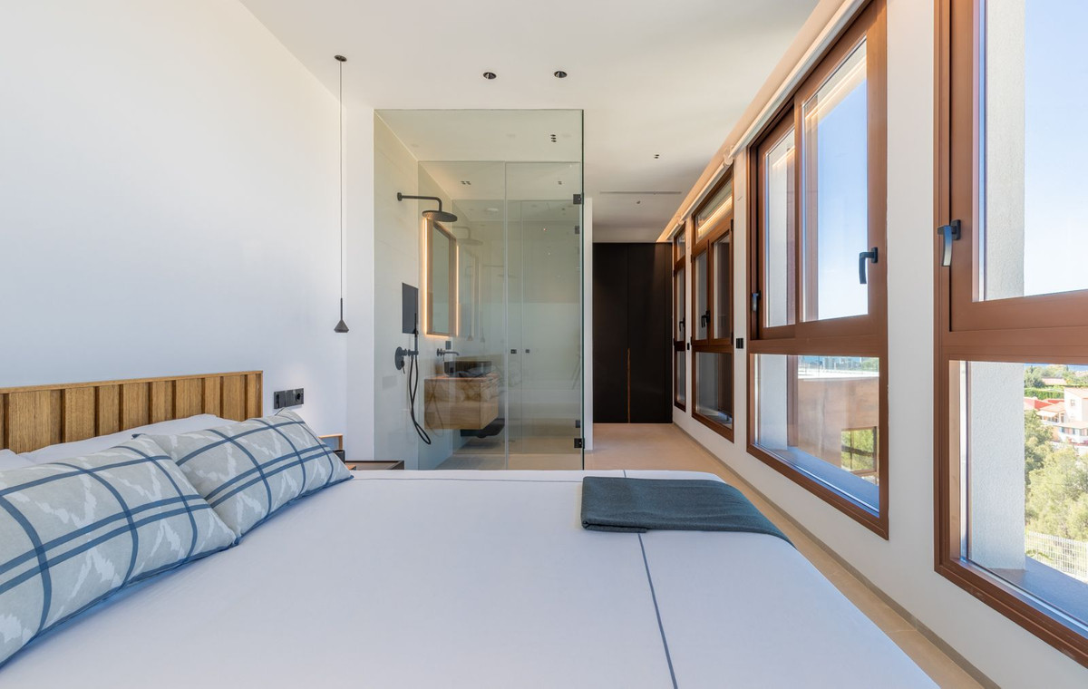 There is a large office and four full suites, each with a sea view and 2 of them with access to their own private terrace. The rooms have an elegant and contemporary design, with minimalist furniture and finishes in light tones that create a calm and serene atmosphere. All bedrooms are en-suite with private bathrooms and dressing rooms, guaranteeing a luxurious and comfortable experience.