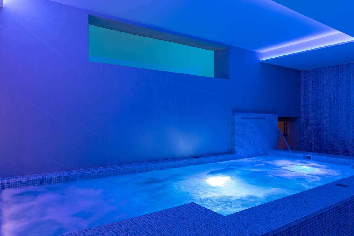 On the lower floor there is a large Spa, the heart of the villa. A space for complete relaxation and wellness, with a heated Jacuzzi-style swimming pool equipped with a waterfall, hydromassage benches and bubble loungers, as well as a large Finnish sauna and Turkish bath. There is also a large wine cellar and a lift with a stop at each level.