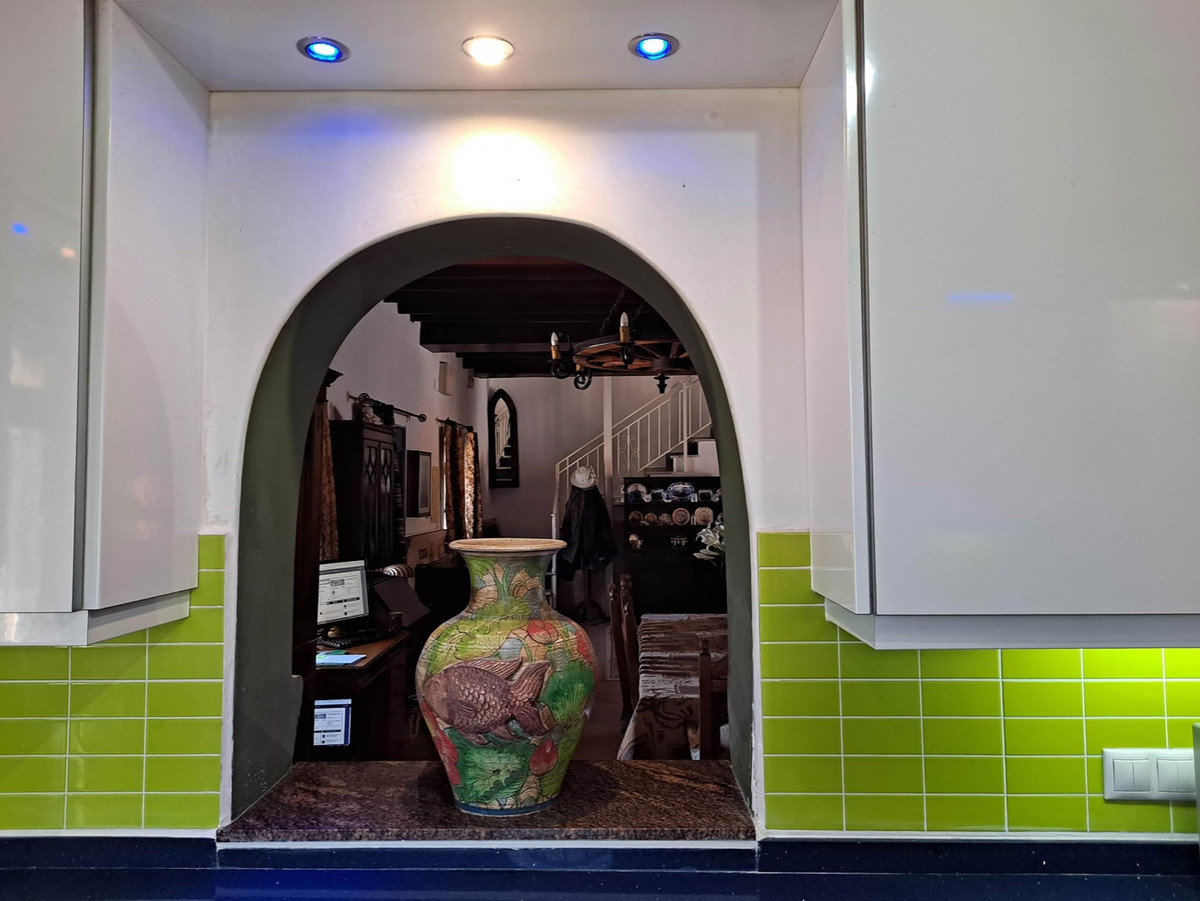 There is also a large open garage with space for four cars and a large and wide entrance to the plot with palm trees.